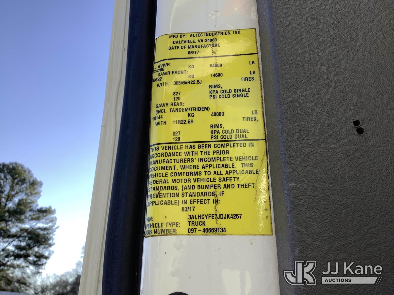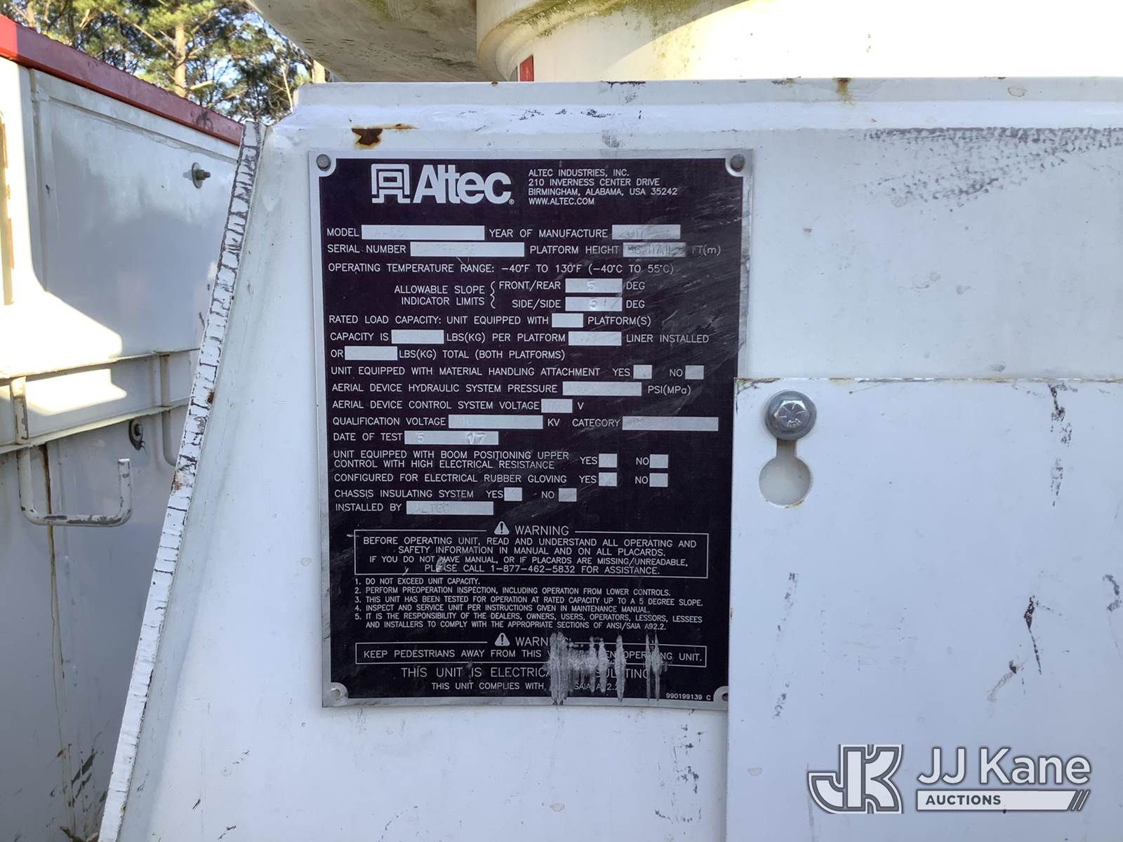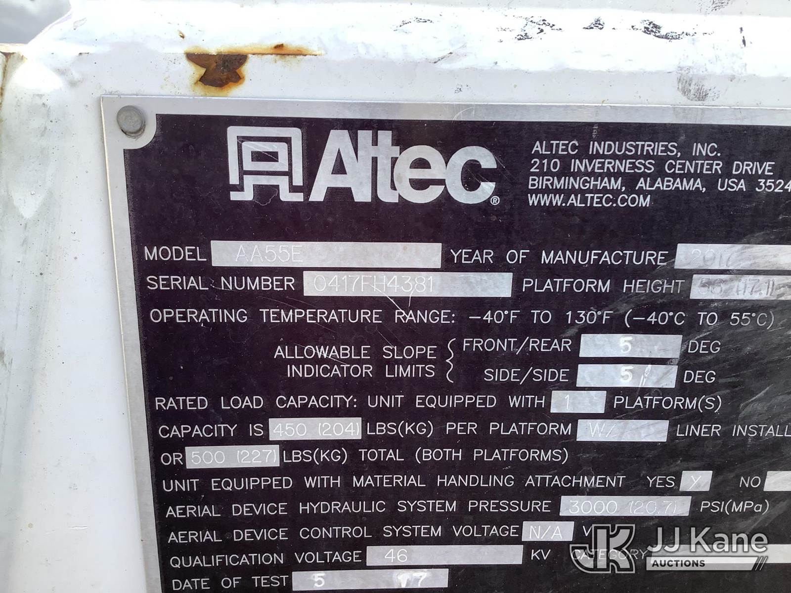 Altec AA55E, 60 ft, Material Handling Bucket Truck s/n 0417FH4381, with Two-Man Bucket & 4 Hyd. Outriggers, rear mounted on 2018 Freightliner M2 106 T/A Utility Truck, Cummins L9 Diesel Auto, A/C, with Front Bumper Winch, (64,243 miles) (AL Power Unit) (Runs, Moves & Upper Operates) (Minor Body Damage) This is a Titled Item NOTE: This unit is being sold AS IS/WHERE IS via Timed Auction and is located in Graysville, AL. Inspection & preview days for this unit are by appointment only; please contact us at contact@jjkane.com or 84-Go-JJKane for more details. Alabama Auctioneer Michael Whitebread - License # 5592 (Missing manuals, See Auction Company for Manufacturers Information to obtain manuals) (Buyer is responsible for removal. Assistance by consignor or JJ Kane Auctions is not assured.)
