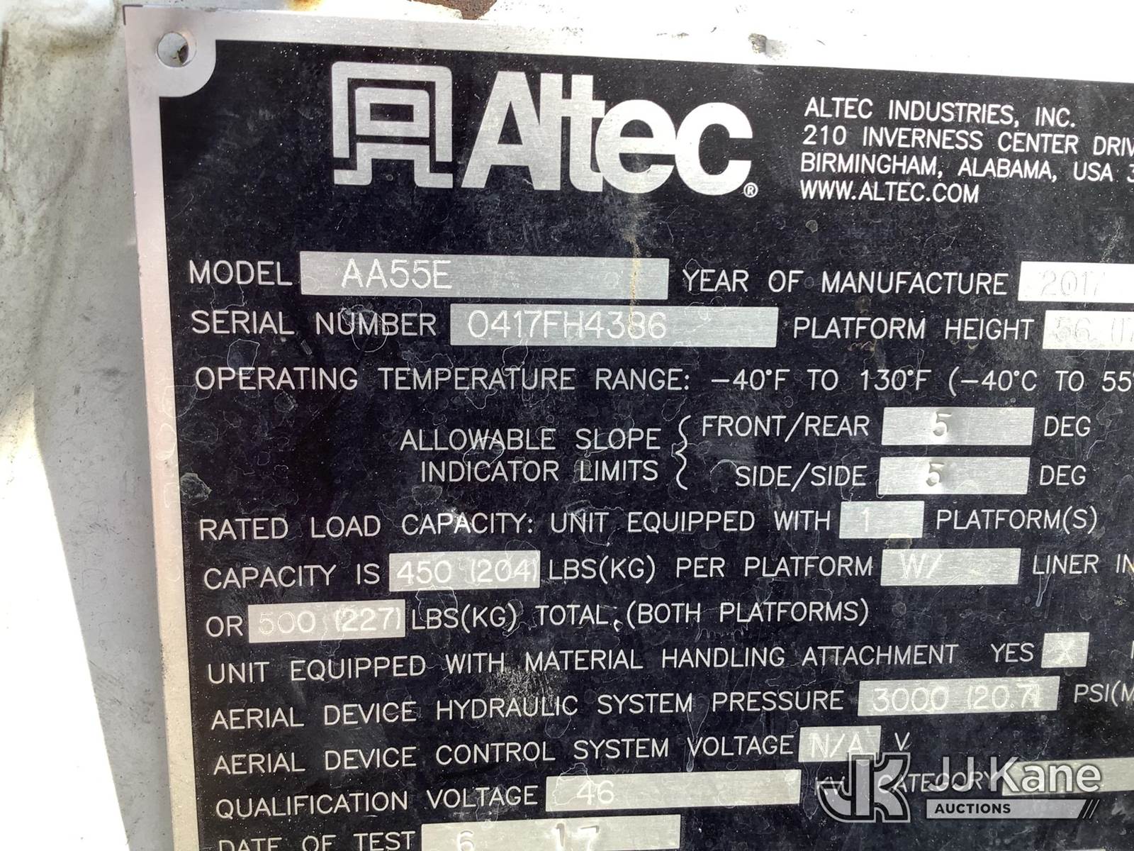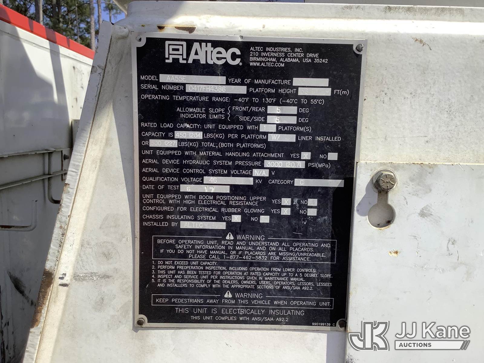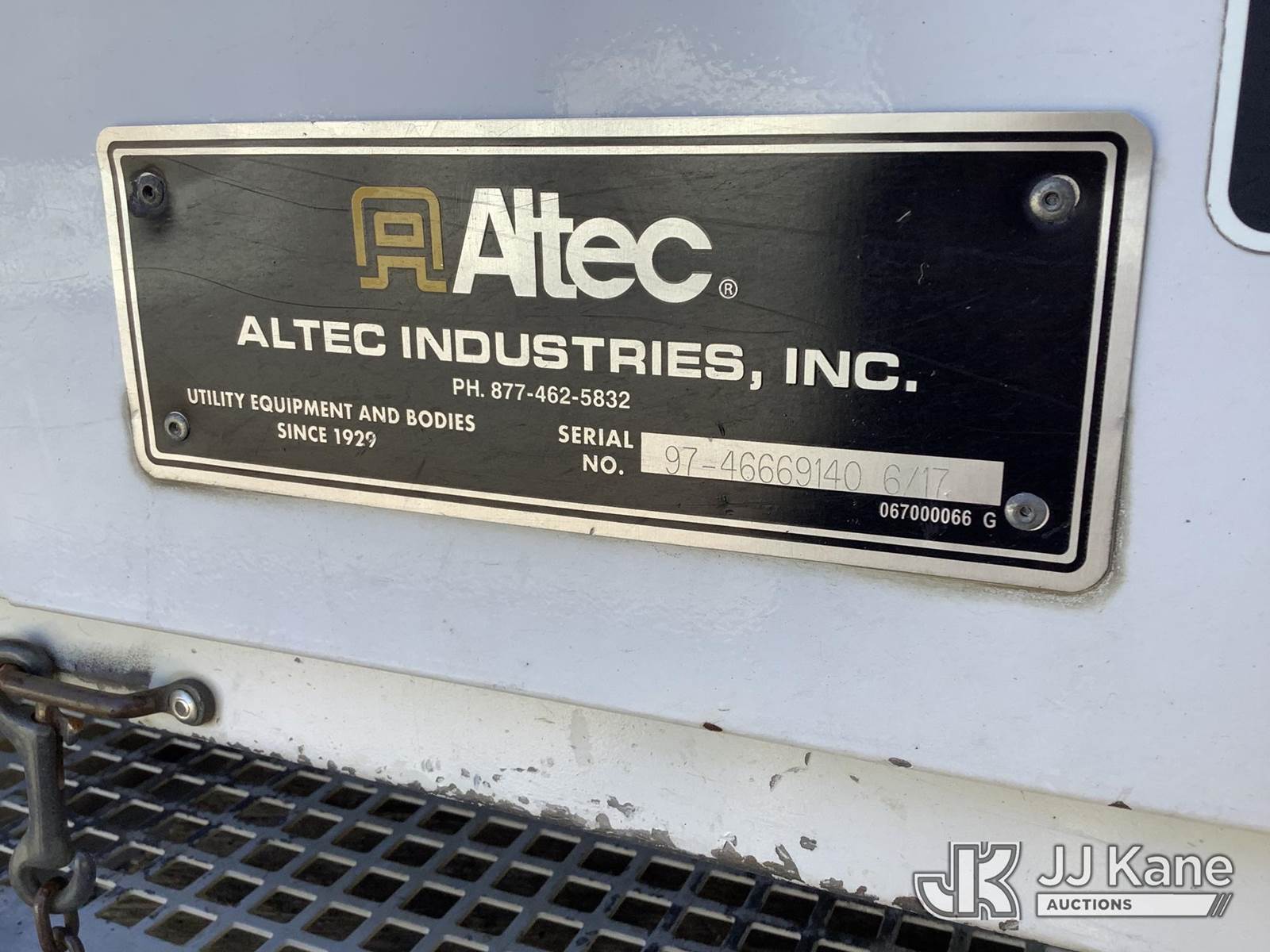 Altec AA55E, 61 ft, Material Handling Bucket Truck s/n 0417FH4386, with two-man bucket, rear mounted on 2018 Freightliner M2 106 T/A Utility Truck, 9.0L diesel, Auto, A/C, with front winch, (76,140 miles) (AL Power Unit) (Runs, Moves & Upper Operates) (Cracked Windshield, Body/Rust Damage) This is a Titled Item NOTE: This unit is being sold AS IS/WHERE IS via Timed Auction and is located in Graysville, AL. Inspection & preview days for this unit are by appointment only; please contact us at contact@jjkane.com or 84-Go-JJKane for more details. Alabama Auctioneer Michael Whitebread - License # 5592 (Manuals provided in cab) (Buyer is responsible for removal. Assistance by consignor or JJ Kane Auctions is not assured.)