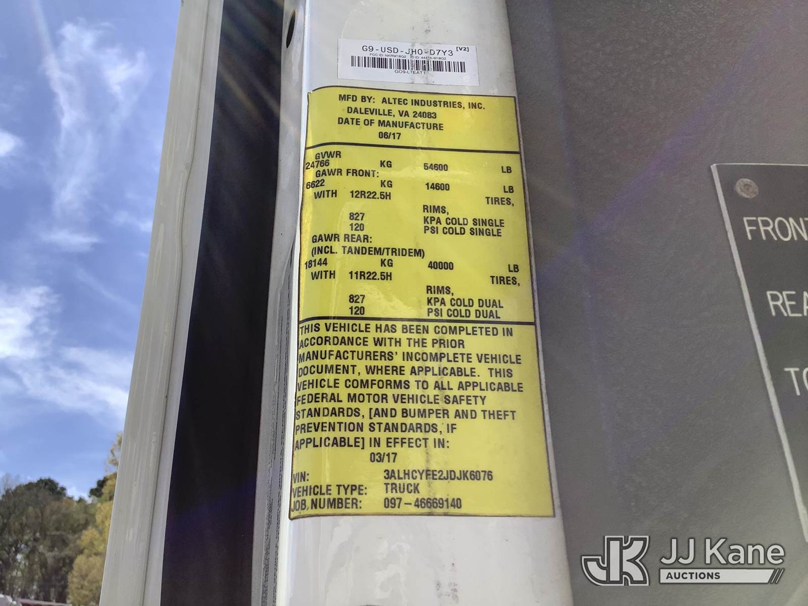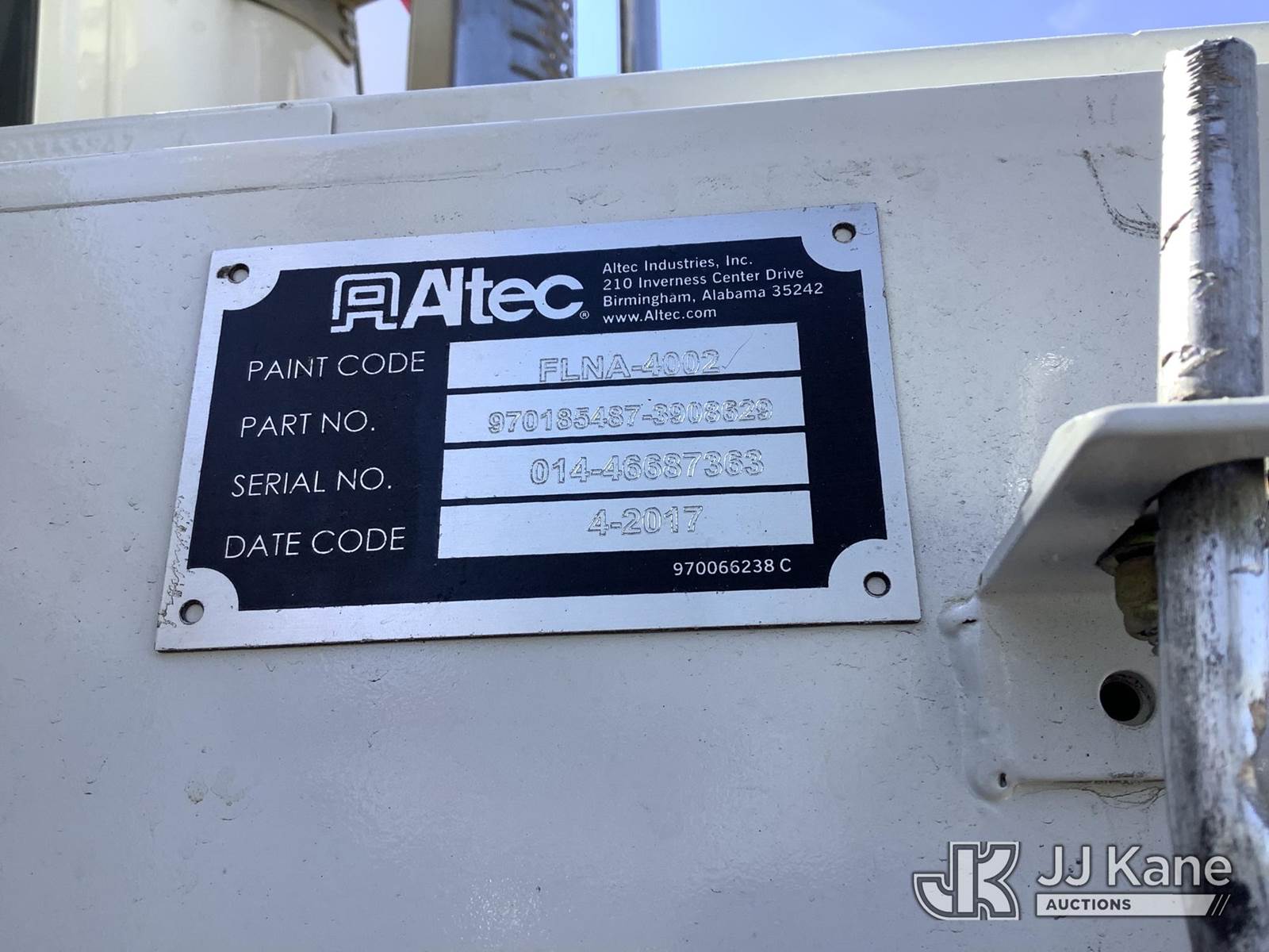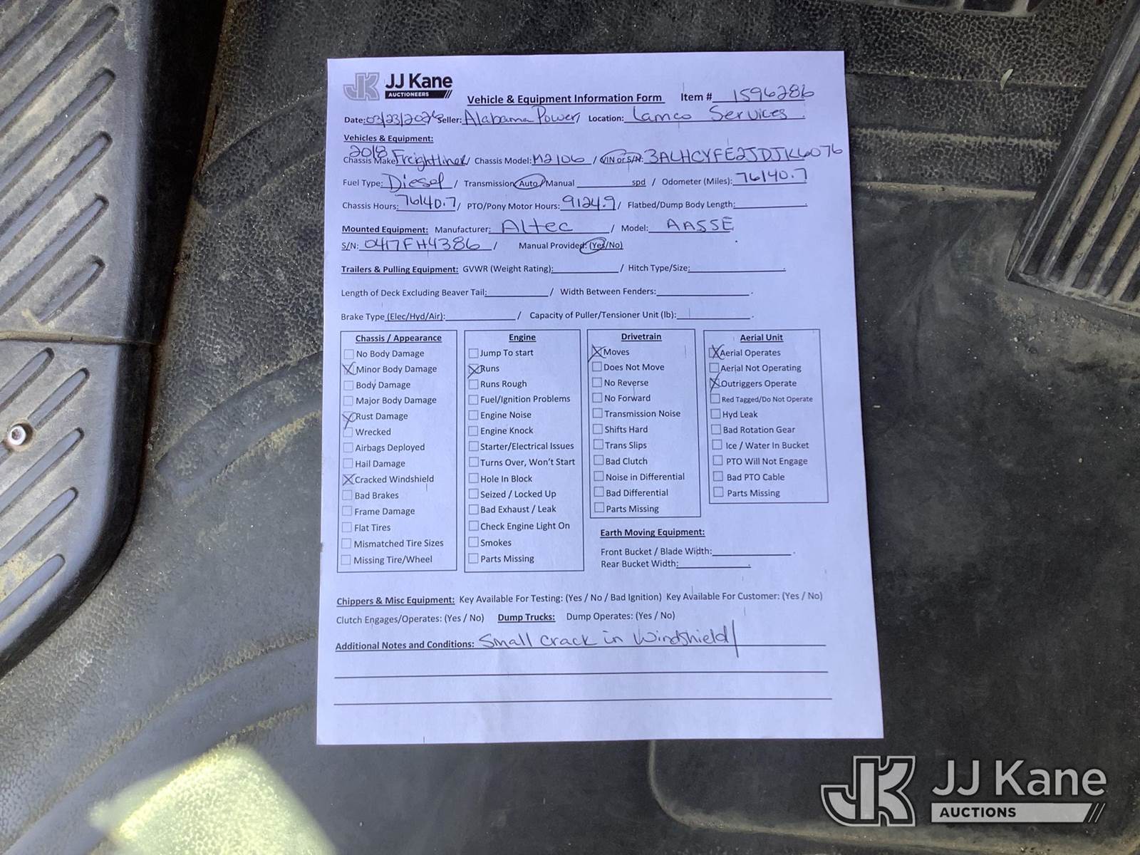 Altec AA55E, 61 ft, Material Handling Bucket Truck s/n 0417FH4386, with two-man bucket, rear mounted on 2018 Freightliner M2 106 T/A Utility Truck, 9.0L diesel, Auto, A/C, with front winch, (76,140 miles) (AL Power Unit) (Runs, Moves & Upper Operates) (Cracked Windshield, Body/Rust Damage) This is a Titled Item NOTE: This unit is being sold AS IS/WHERE IS via Timed Auction and is located in Graysville, AL. Inspection & preview days for this unit are by appointment only; please contact us at contact@jjkane.com or 84-Go-JJKane for more details. Alabama Auctioneer Michael Whitebread - License # 5592 (Manuals provided in cab) (Buyer is responsible for removal. Assistance by consignor or JJ Kane Auctions is not assured.)