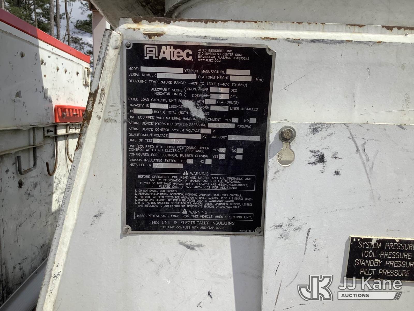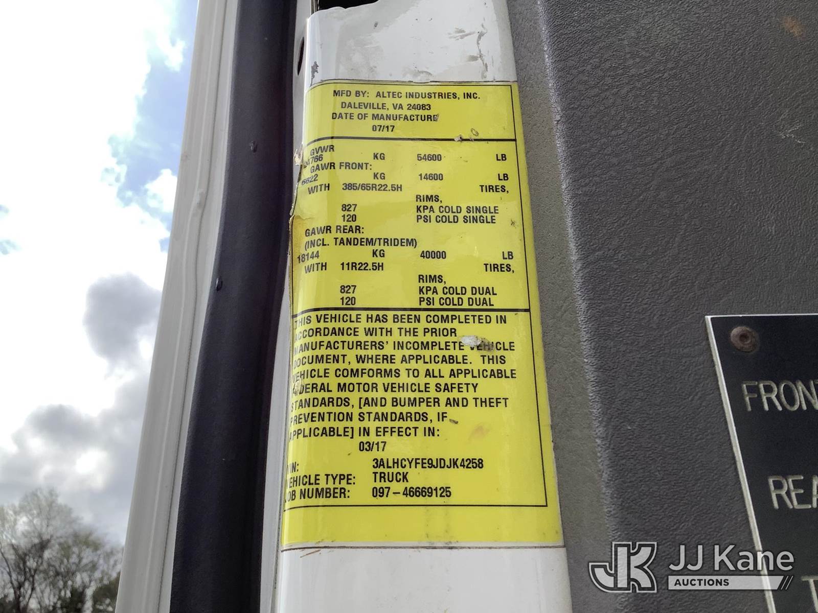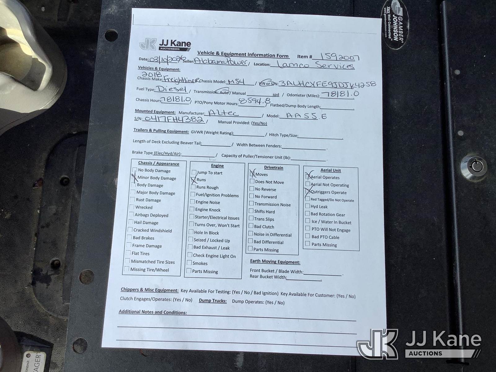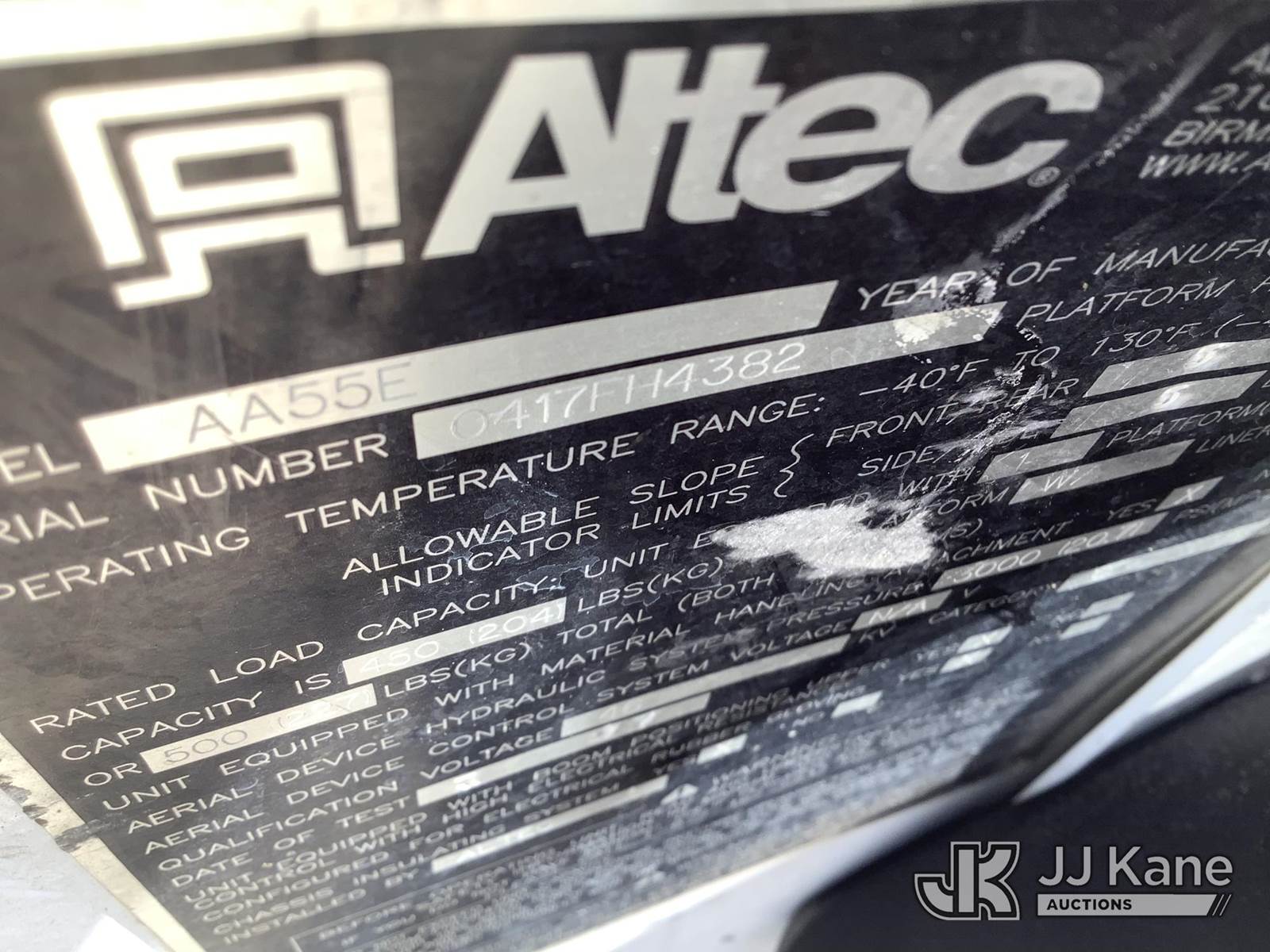 Altec AA55E-MH, 61 ft, Material Handling Bucket Truck s/n 0417FH4382, with two-man bucket, rear mounted on 2018 Freightliner M2 106 T/A Utility Truck, 9.0L diesel, Auto, A/C, with front winch, (78,181 miles) (AL Power Unit) (Runs, Moves & Upper Operates) (Body Damage) This is a Titled Item NOTE: This unit is being sold AS IS/WHERE IS via Timed Auction and is located in Graysville, AL. Inspection & preview days for this unit are by appointment only; please contact us at contact@jjkane.com or 84-Go-JJKane for more details. Alabama Auctioneer Michael Whitebread - License # 5592 (Missing manuals, See Auction Company for Manufacturers Information to obtain manuals) (Buyer is responsible for removal. Assistance by consignor or JJ Kane Auctions is not assured.)