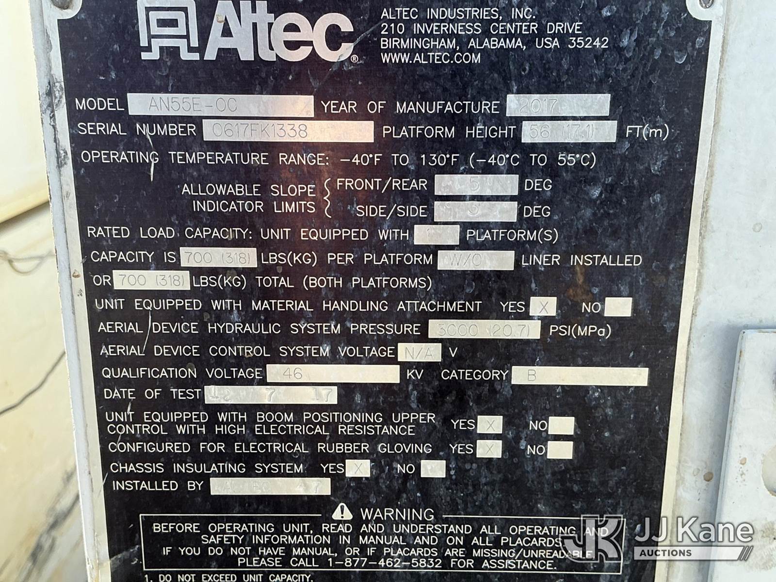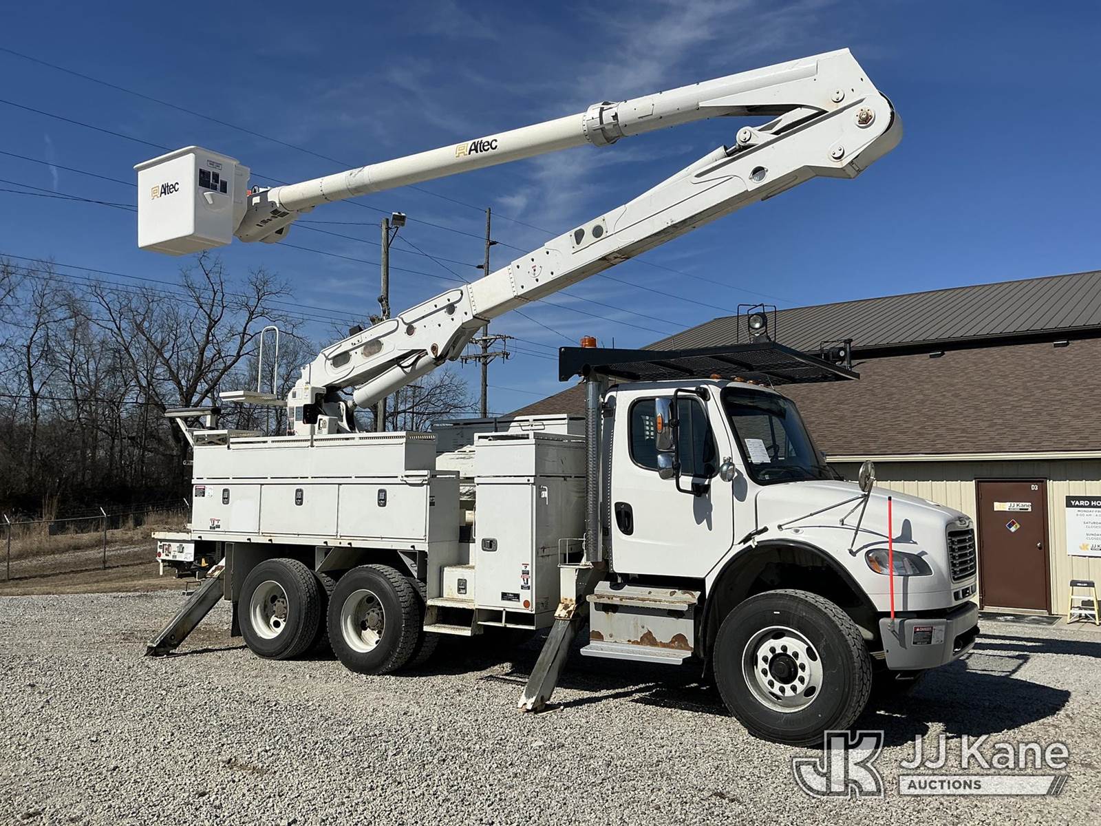 Altec AN55E-OC, 61 ft, Articulating Material Handling Bucket Truck s/n 0617FK1338, with two-man bucket & 4 hyd outriggers, rear mounted on 2018 Freightliner M2 106 T/A Utility Truck, Cummins L9 diesel, Auto, A/C, with capstan & front winch, (116,012 miles) (Runs, Moves & Upper Operates) This is a Titled Item NOTE: This unit is being sold AS IS/WHERE IS via Timed Auction and is located in Fort Wayne, IN. Inspection & preview days for this unit are the 2 business days prior to the first day of items closing for this auction, item is located at 3020 Commercial Rd Fort Wayne, IN 46809 and hours of operations are 8a-4p. For pre-sale questions, please contact Eric Mcintosh @ (260) 205-2483 (Manuals provided in cab) (Buyer is responsible for removal. Assistance by consignor or JJ Kane Auctions is not assured.)