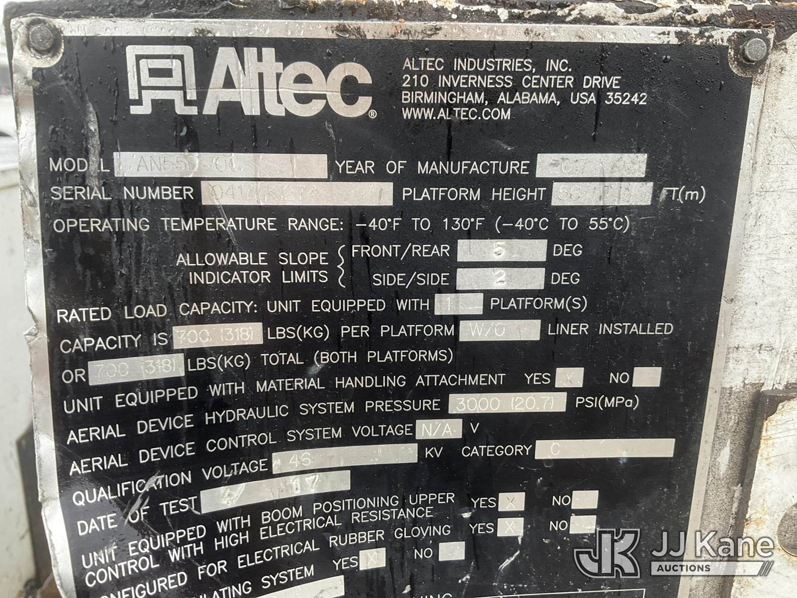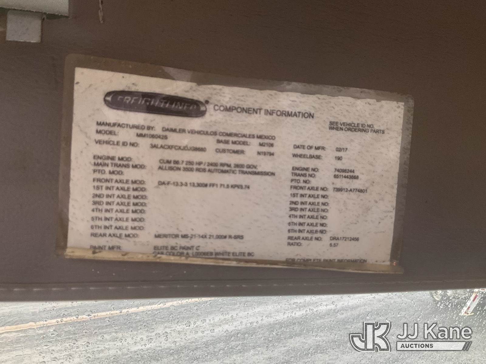Altec AN55E-OC, 61 ft, Material Handling Bucket Truck s/n 0417FK1274, with two-man bucket, rear mounted on 2018 Freightliner M2 106 Utility Truck, Cummins ISB-250 6.7L diesel, Auto, A/C, (89,238 miles) (Runs, Moves & Upper Operates) (Check Engine Light On ) This is a Titled Item NOTE: This unit is being sold AS IS/WHERE IS via Timed Auction and is located in China Grove, NC. Inspection & preview days for this unit are the 2 business days prior to the first day of items closing for this auction, item is located at 820 E NC Hwy 152 China Grove, NC 28023 and hours of operations are 8a-4p. For pre-sale questions, please contact Office Staff @ (704) 674-1113. (Manuals provided in cab) (Buyer is responsible for removal. Assistance by consignor or JJ Kane Auctioneers is not assured.)