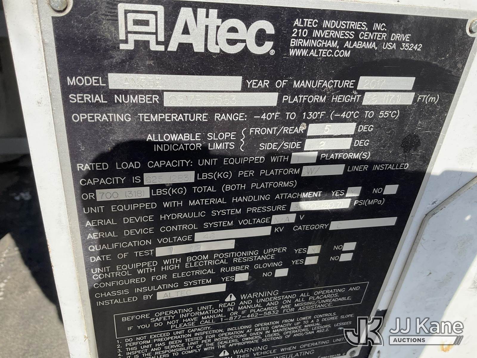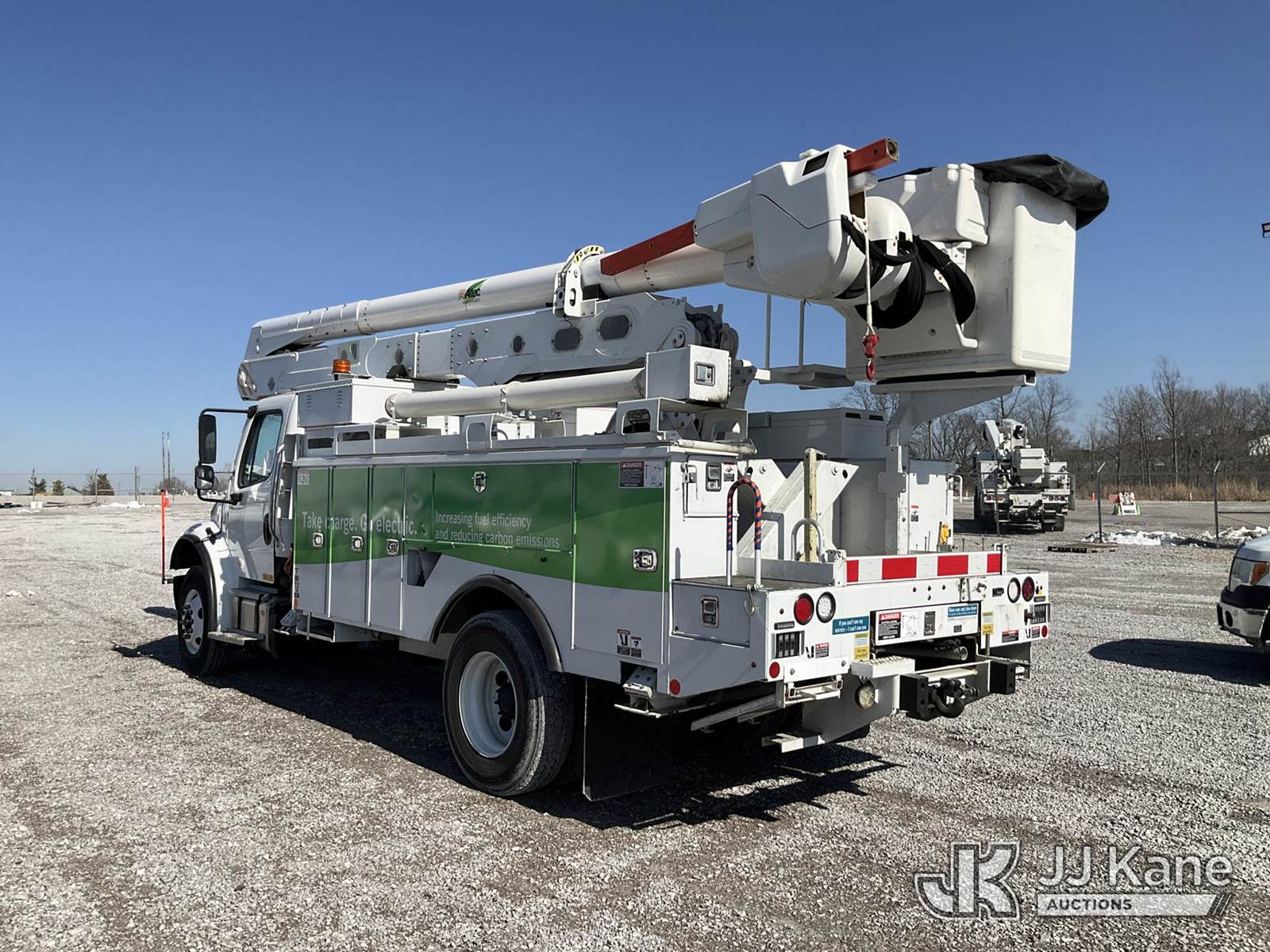 Altec AN55EJEMS, 62 ft, Material Handling Bucket Truck s/n 0817FJ0563, with two-man bucket & 4 hyd outriggers, rear mounted on 2018 Freightliner M2 Utility Truck, 6.7L diesel, Auto, A/C, with Jobsite Energy Management System is an integrated plug-in system that uses stored electrical energy to power the aerial device, tools and exportable power, and provides cab comfort. The energy storage system is recharged by plugging into shore power or by the truck’s internal combustion engine., (35,544 miles) (Duke Unit) (Runs, Moves & Upper Operates) (Reads 3,160 hours) This is a Titled Item NOTE: This unit is being sold AS IS/WHERE IS via Timed Auction and is located in Verona, KY. Inspection & preview days for this unit are the 2 business days prior to the first day of items closing for this auction, item is located at 2841 Verona-Mudlick Rd Ste B Verona, KY 41092 and hours of operations are 8a-4p. For pre-sale questions, please contact Office Staff @ (502) 612-5080. Auctioneer Michael Whitebread / License # 256617. (Manuals provided in cab) (Buyer is responsible for removal. Assistance by consignor or JJ Kane Auctions is not assured.)