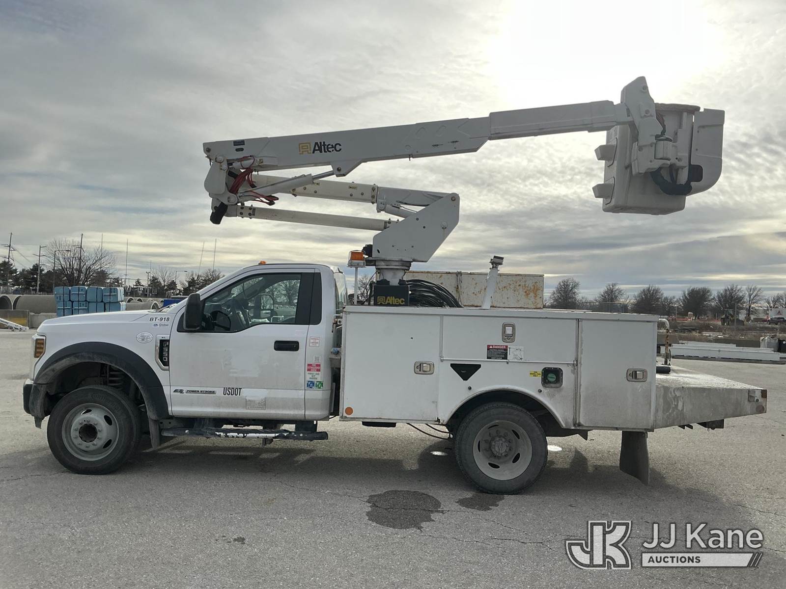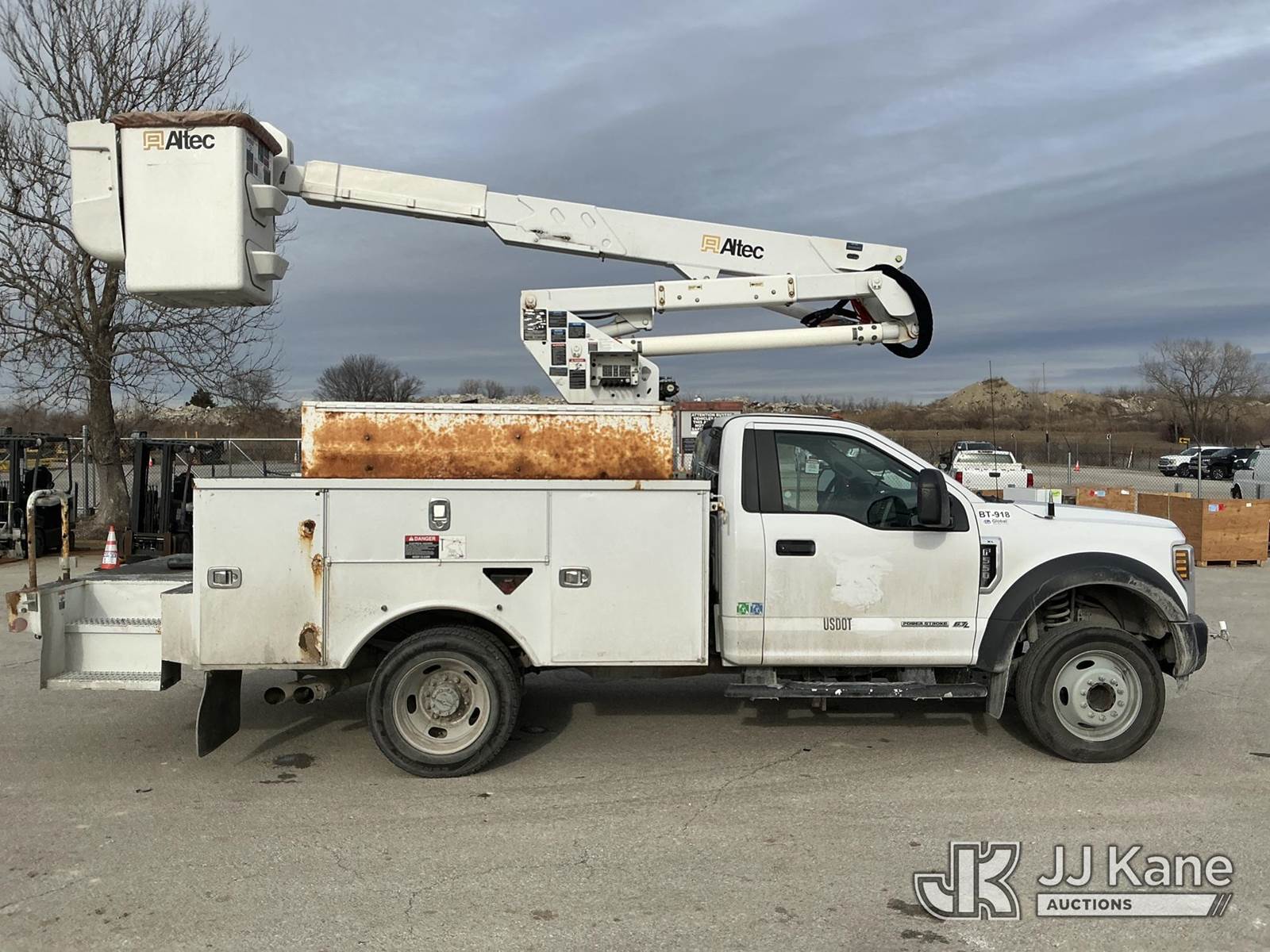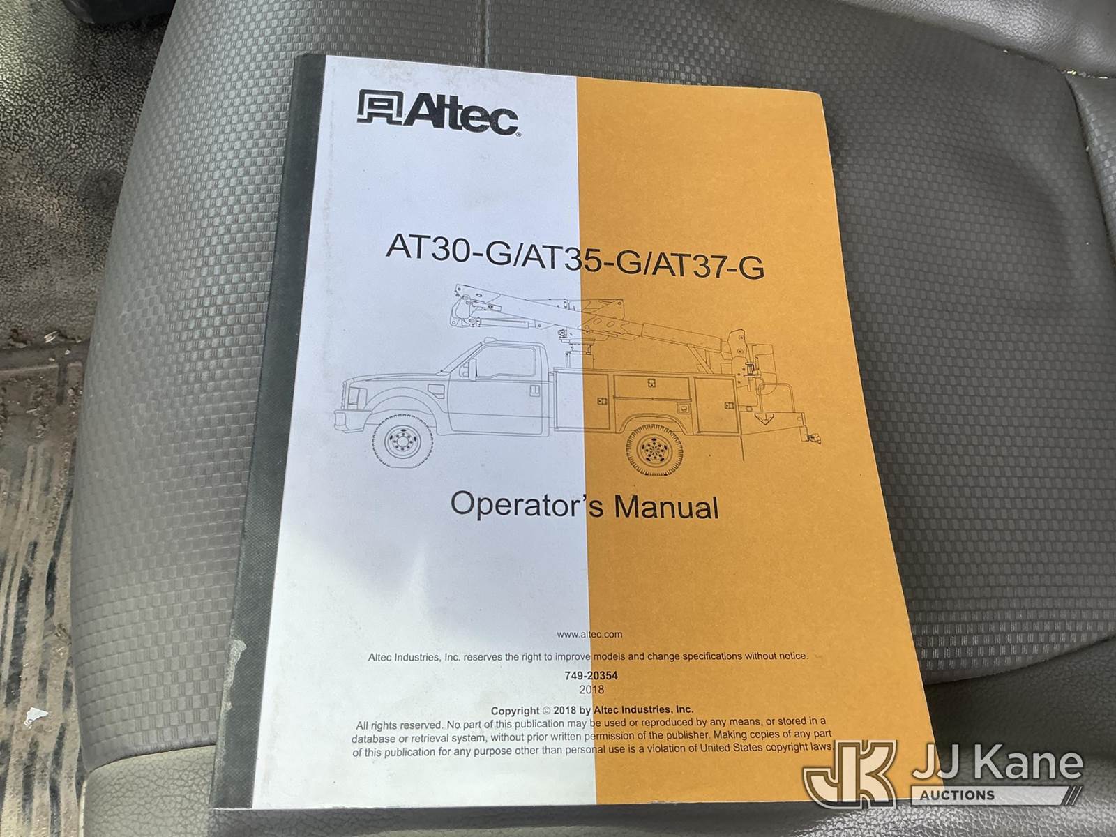 Altec AT37G, 42 ft, Articulating & Telescopic Bucket Truck s/n 0418DE21206, with single man bucket, mounted behind cab on 2018 Ford F-550 Service Truck, 6.7L diesel, Auto, A/C, (194,673 miles) (Runs, Moves & Upper Operates)(Rust & Paint Damage) (Seller States: Transmission Issue, DEF Clogged, Oil Leak At Boom Tip) (Reads 6,128 hours) This is a Titled Item NOTE: This unit is being sold AS IS/WHERE IS via Timed Auction and is located in Kansas City, MO. For more information & removal arrangements please contact Ricky McPherson @ 816-610-2250. Load out by appointment only, Buyer/Hauler must present copy of paid invoice upon arrival. Purchaser acknowledges ALL lots must be removed within 5 business days of Auction, or a storage fee may be incurred. For load out and pick up information, please reference the release form sent out after purchase. (Manuals provided in cab) (Buyer is responsible for removal. Assistance by consignor or JJ Kane Auctions is not assured.)