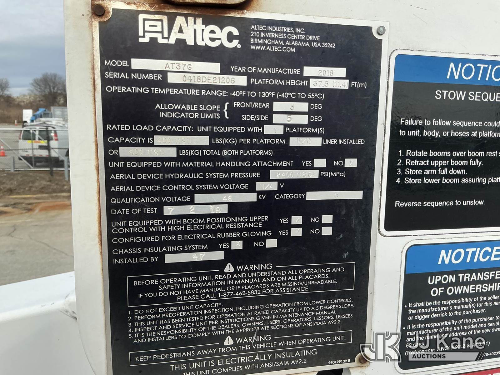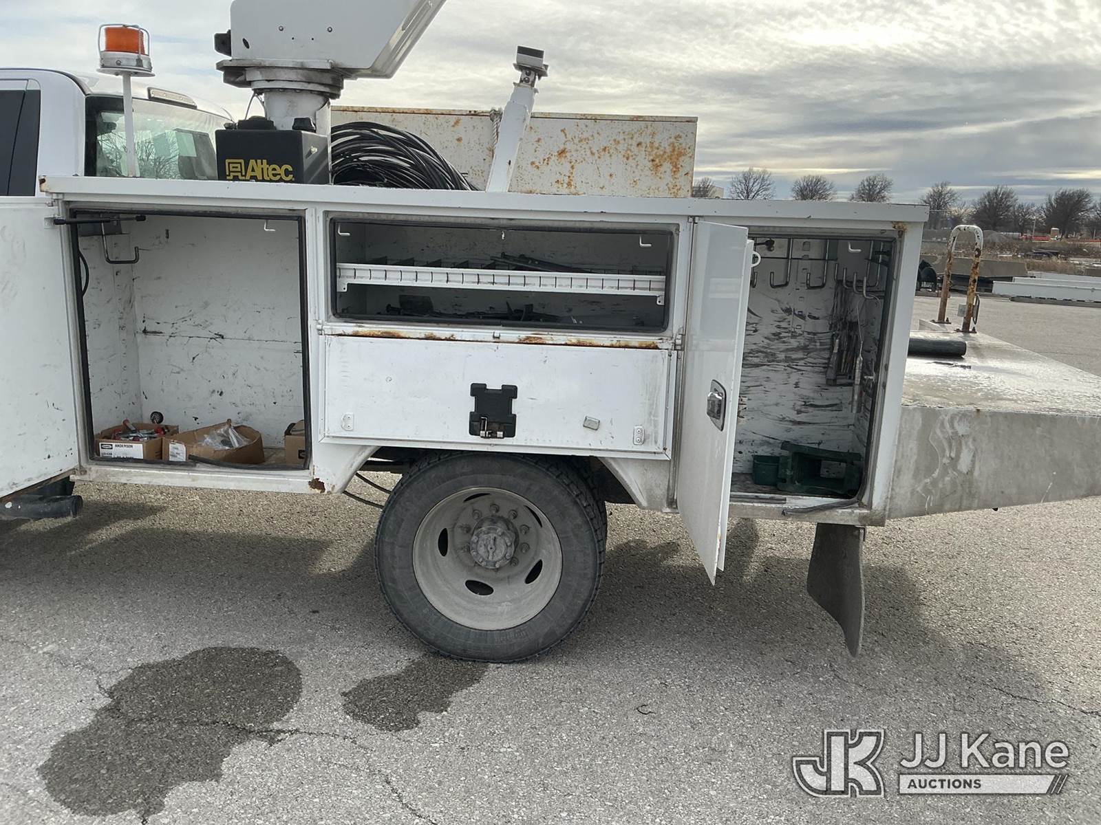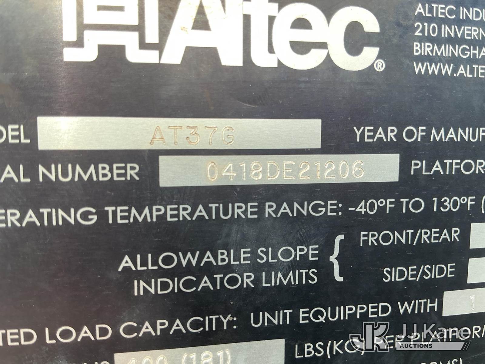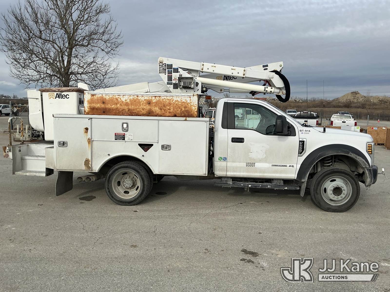 Altec AT37G, 42 ft, Articulating & Telescopic Bucket Truck s/n 0418DE21206, with single man bucket, mounted behind cab on 2018 Ford F-550 Service Truck, 6.7L diesel, Auto, A/C, (194,673 miles) (Runs, Moves & Upper Operates)(Rust & Paint Damage) (Seller States: Transmission Issue, DEF Clogged, Oil Leak At Boom Tip) (Reads 6,128 hours) This is a Titled Item NOTE: This unit is being sold AS IS/WHERE IS via Timed Auction and is located in Kansas City, MO. For more information & removal arrangements please contact Ricky McPherson @ 816-610-2250. Load out by appointment only, Buyer/Hauler must present copy of paid invoice upon arrival. Purchaser acknowledges ALL lots must be removed within 5 business days of Auction, or a storage fee may be incurred. For load out and pick up information, please reference the release form sent out after purchase. (Manuals provided in cab) (Buyer is responsible for removal. Assistance by consignor or JJ Kane Auctions is not assured.)