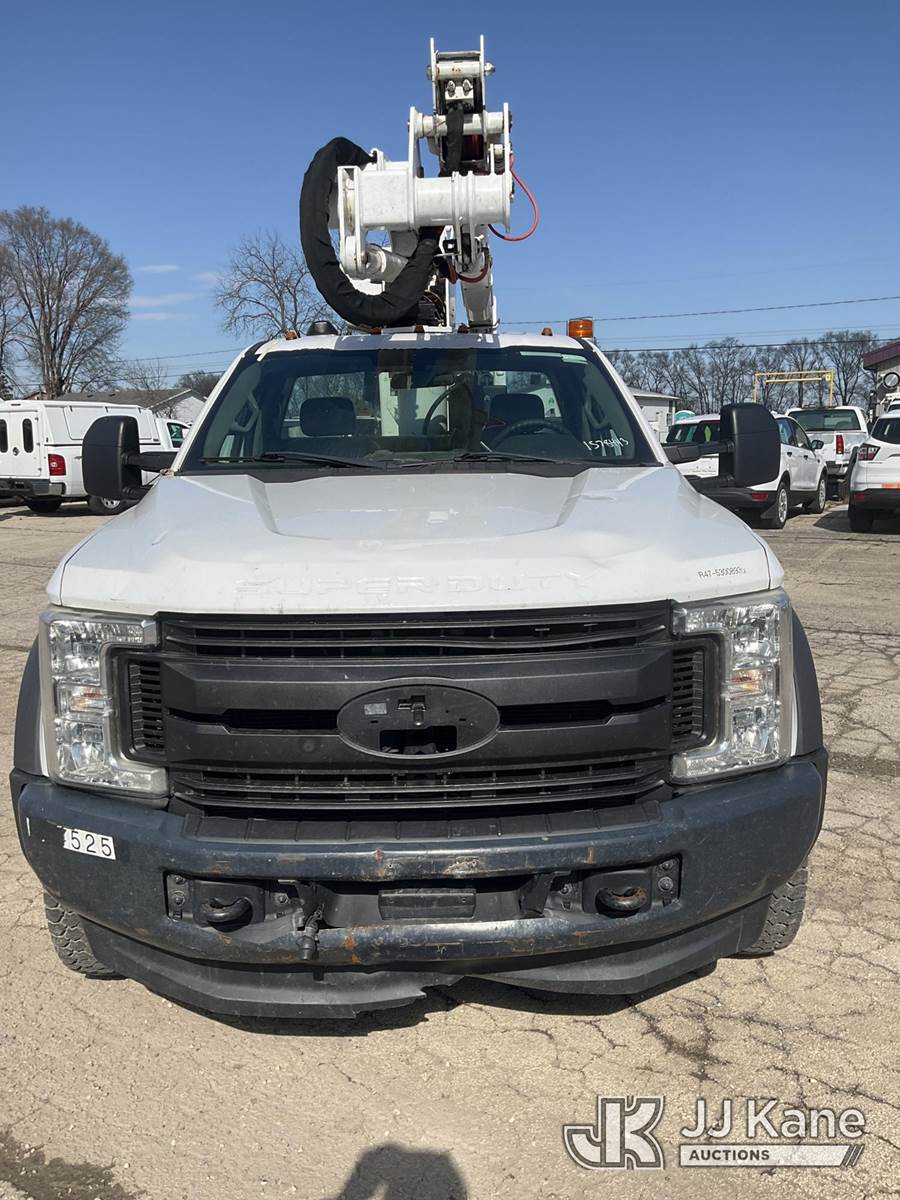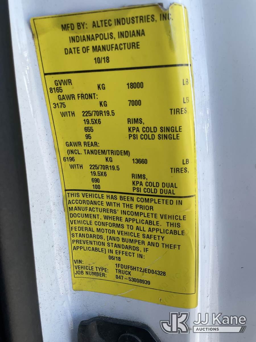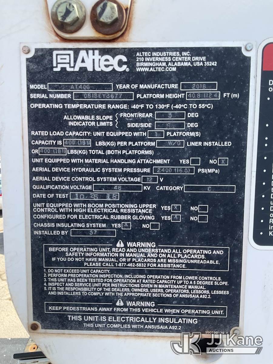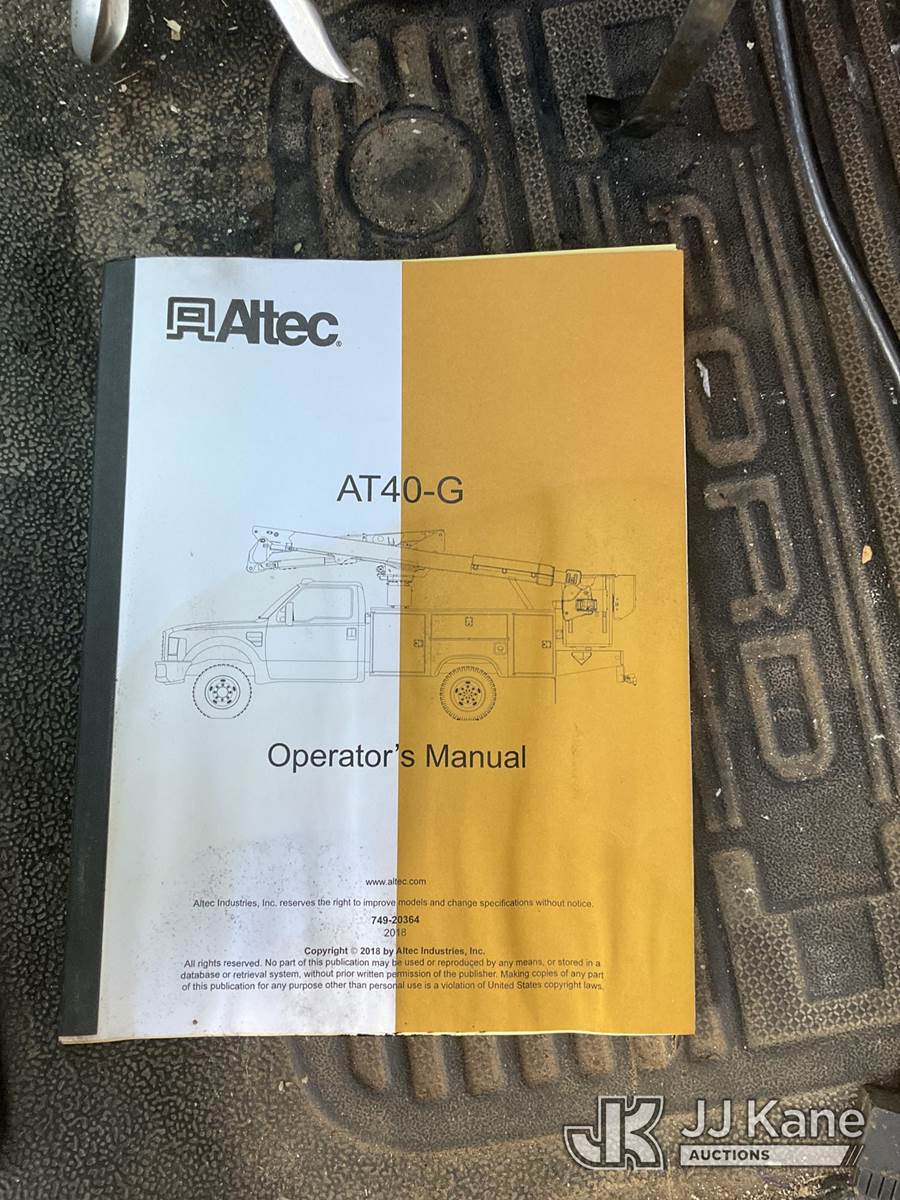 Altec AT40G, 45 ft, Articulating & Telescopic Bucket Truck s/n 0818EY3677, with single-man bucket, mounted behind cab on 2018 Ford F-550 Service Truck, 6.7L Diesel 4wd, Auto, A/C, (145,228 miles) (Runs, Moves & Upper Operates)(Transmission Performance Deficiencies, Dash Indicator Light On) (Reads 10,477 hours) This is a Titled Item NOTE: This unit is being sold AS IS/WHERE IS via Timed Auction and is located in South Beloit, IL. Inspection & preview days for this unit are the 2 business days prior to the first day of items closing for this auction, item is located at 14354 Dearborn Ave South Beloit, IL and hours of operations are 8a-4p. For pre-sale questions, please contact Derek Eklund at (608) 904-0618 or (derek.eklund@jjkane.com). (Manuals provided in cab) (Buyer is responsible for removal. Assistance by consignor or JJ Kane Auctions is not assured.)