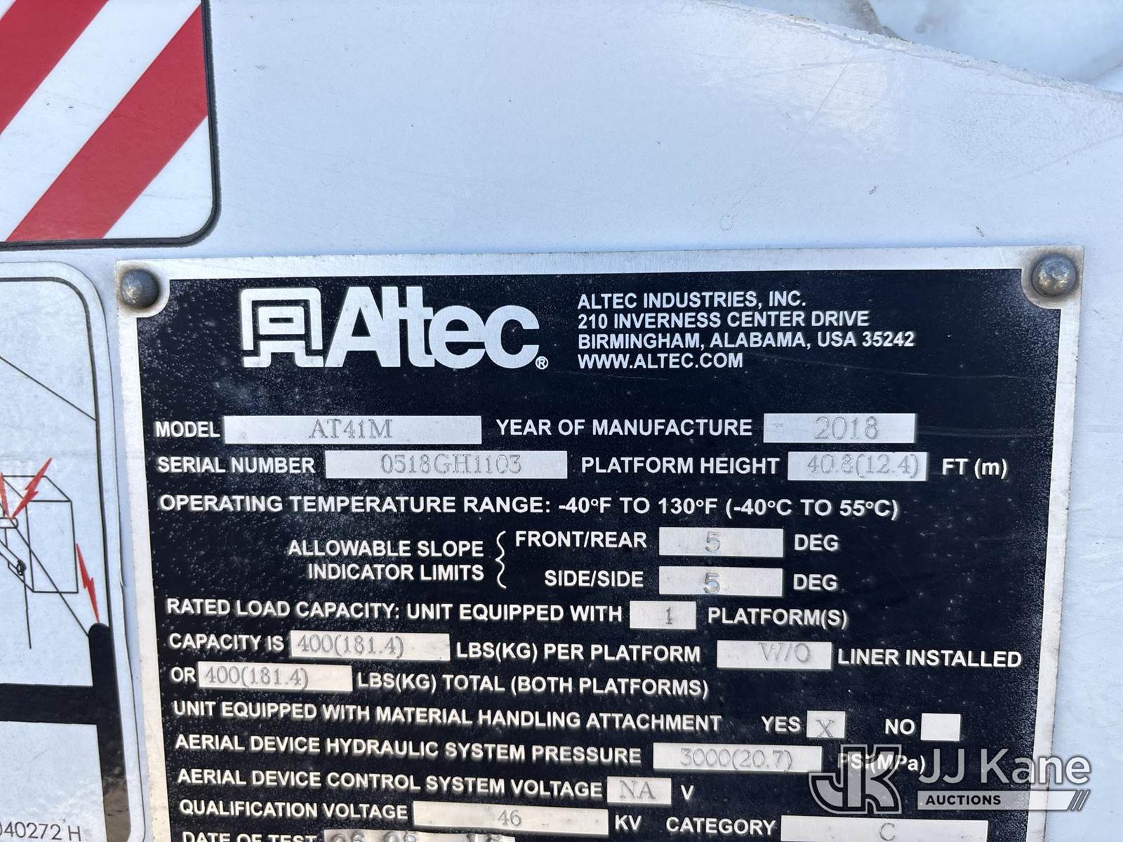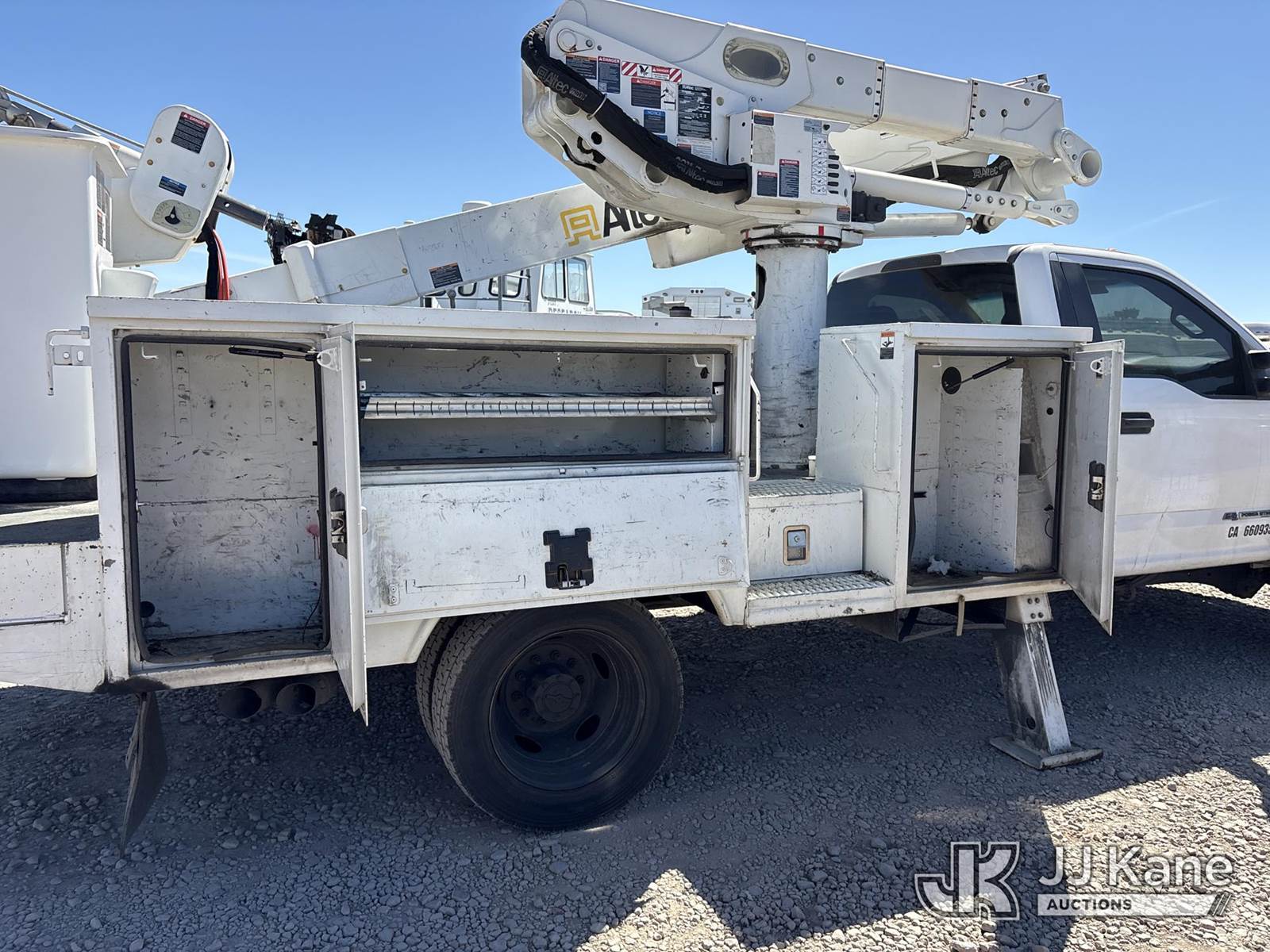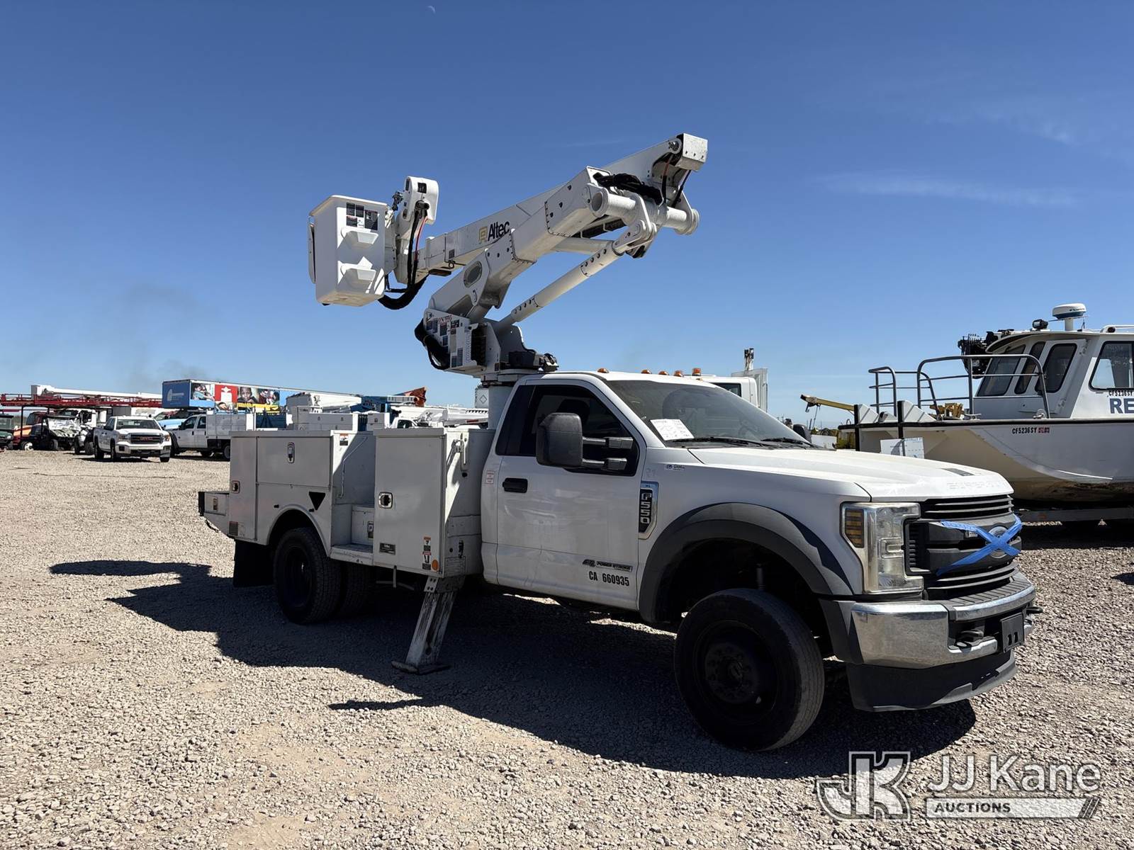 Altec AT41M, 45 ft, Articulating & Telescopic Material Handling Bucket Truck s/n 0518GH1103, with single-man bucket & 2 hyd outriggers, mounted behind cab on 2018 Ford F-550 Regular Cab DRW 4WD Service Truck, s/n 1FDUF5HT6JDA02692, 6.7L V8 OHV 16V diesel, Auto, A/C, (152,373 miles) (Runs, Moves & Operates) (Reads 8,697 hours) May be subject to ARB Regulations This is a Titled Item NOTE: This unit is being sold AS IS/WHERE IS via Timed Auction and is located in Dixon, CA. Inspection & preview days for this unit are the 2 business days prior to the first day of items closing for this auction, item is located at 8668 Sparling Ln Dixon, CA 95620 and hours of operations are 8a-4p. For pre-sale questions, please contact JJ Kane Staff at (707) 678-8060 (dixon@jjkane.com). Dealer License Number 45696. (Missing manuals, See Auction Company for Manufacturers Information to obtain manuals) (Buyer is responsible for removal. Assistance by consignor or JJ Kane Auctions is not assured.)
