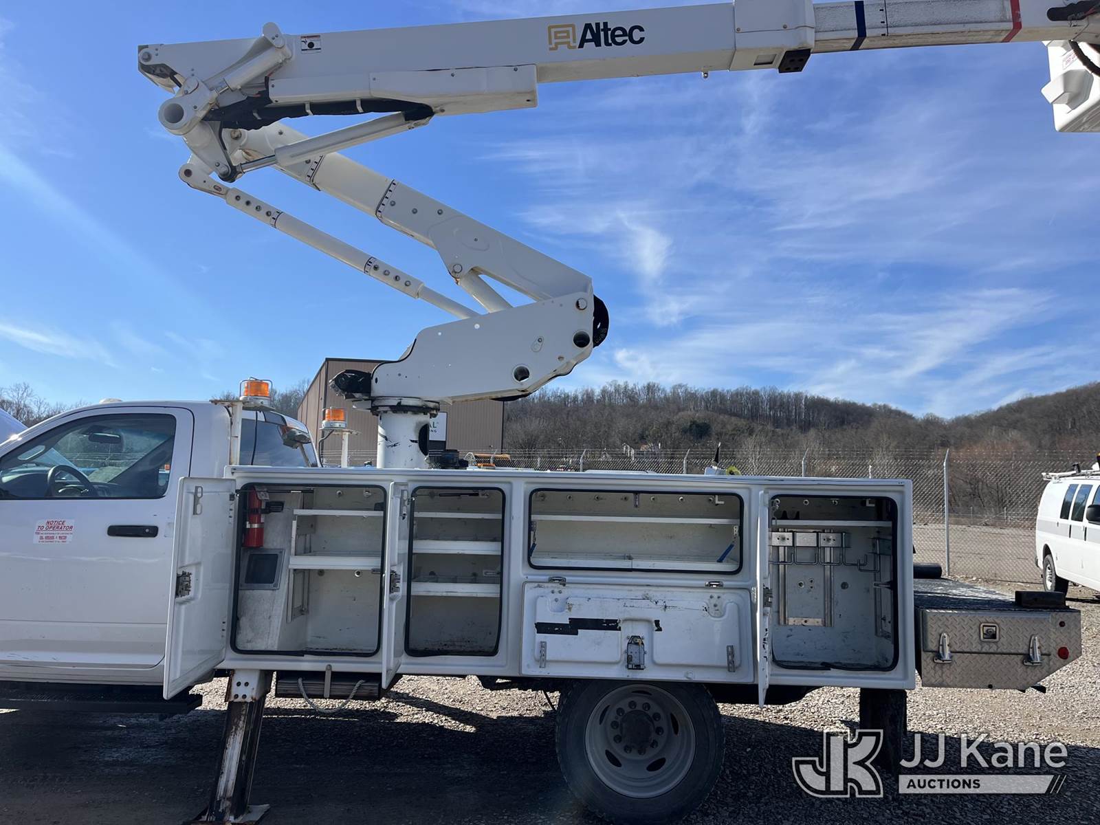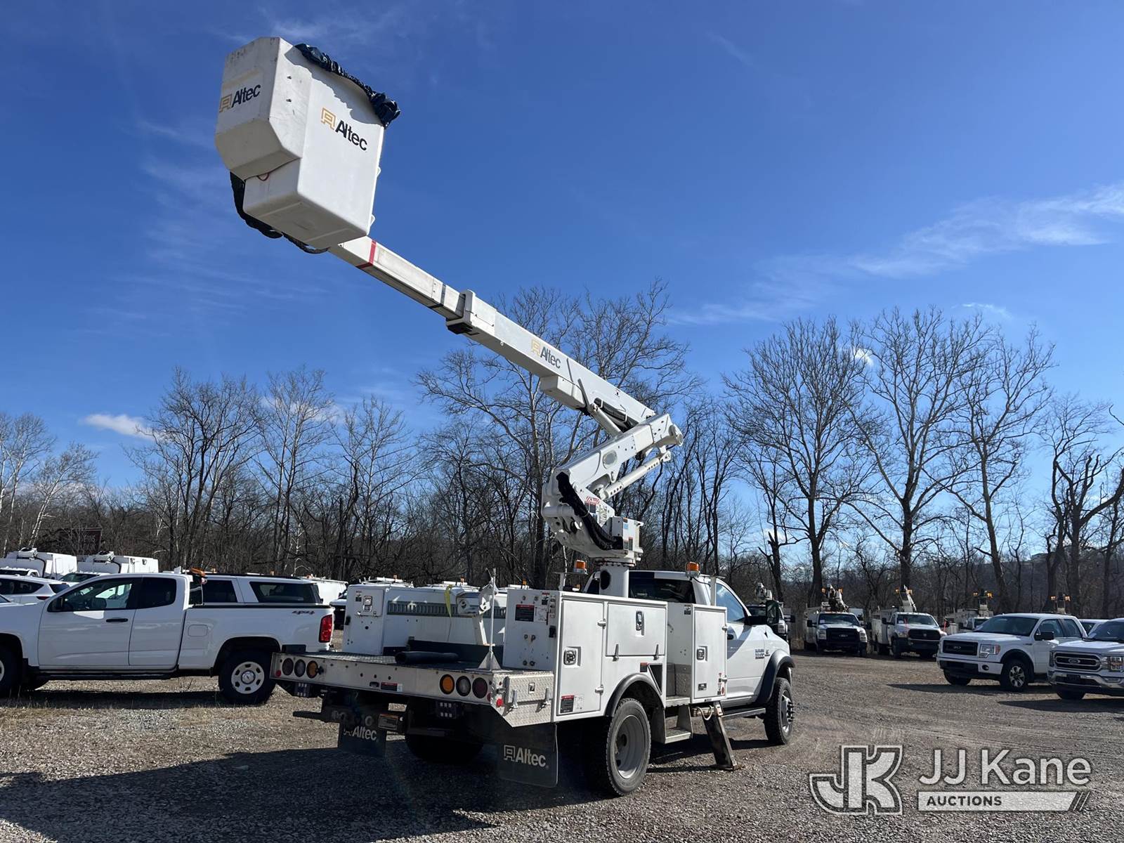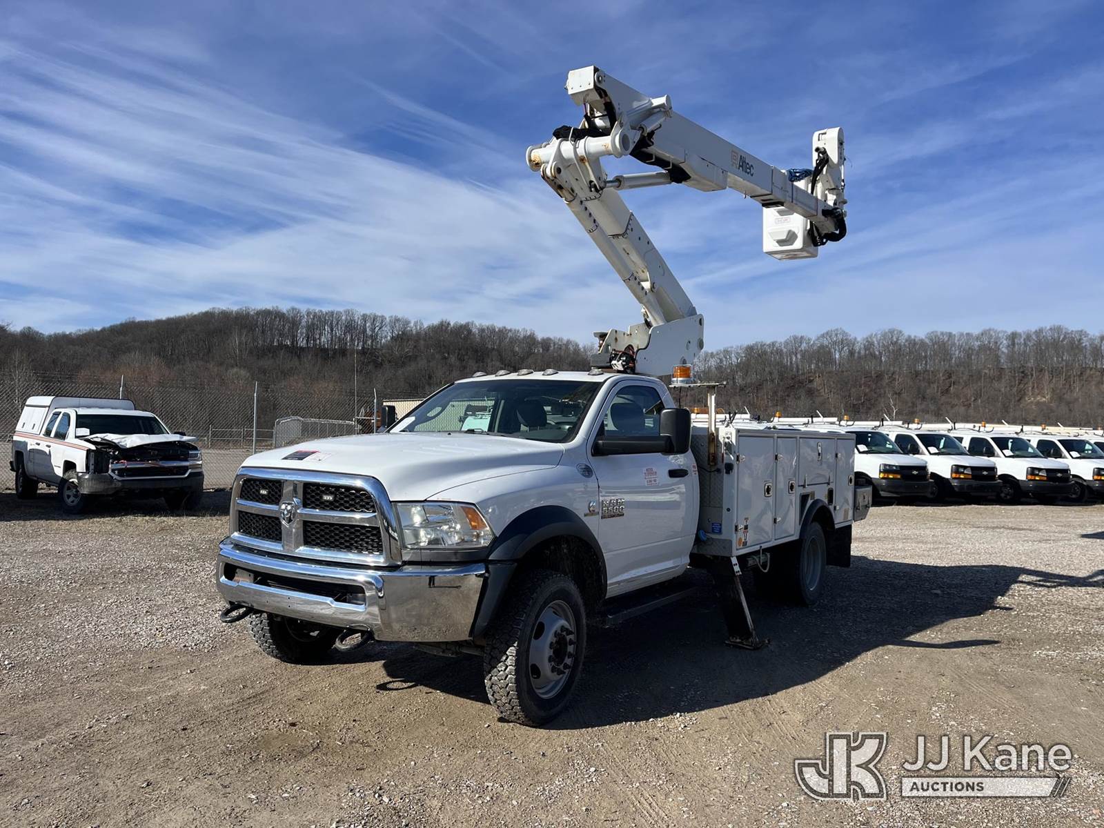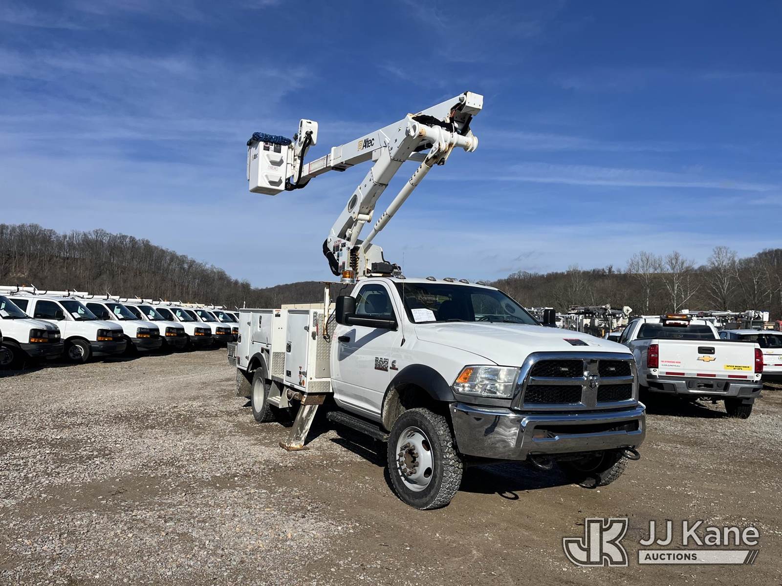 Altec AT41M, 46 ft, Articulating & Telescopic Material Handling Bucket Truck s/n 1018GH1332, with single-man bucket & 2 hyd outriggers, mounted behind cab on 2018 RAM 5500 4x4 Service Truck, 6.7L L6 Turbo Diesel Auto, A/C, (59,349 miles) (Runs, Moves & Operates, Low Fuel, Body Damage) (Reads 371 hours) This is a Titled Item NOTE: This unit is being sold AS IS/WHERE IS via Timed Auction and is located in Smock, PA. For pre-sale questions, please contact Alaina White @ 724-562-2575 or Alaina.White@JJKane.com. JJ Kane Smock, PA yard is open for inspection on the Friday and Monday before the sale date from 8:00 am to 3:00 pm. REMOVAL: All items must be removed by 10 calendar days after the sale, Monday - Friday (Excluding Holidays). (Manuals provided in cab) (Buyer is responsible for removal. Assistance by consignor or JJ Kane Auctions is not assured.)