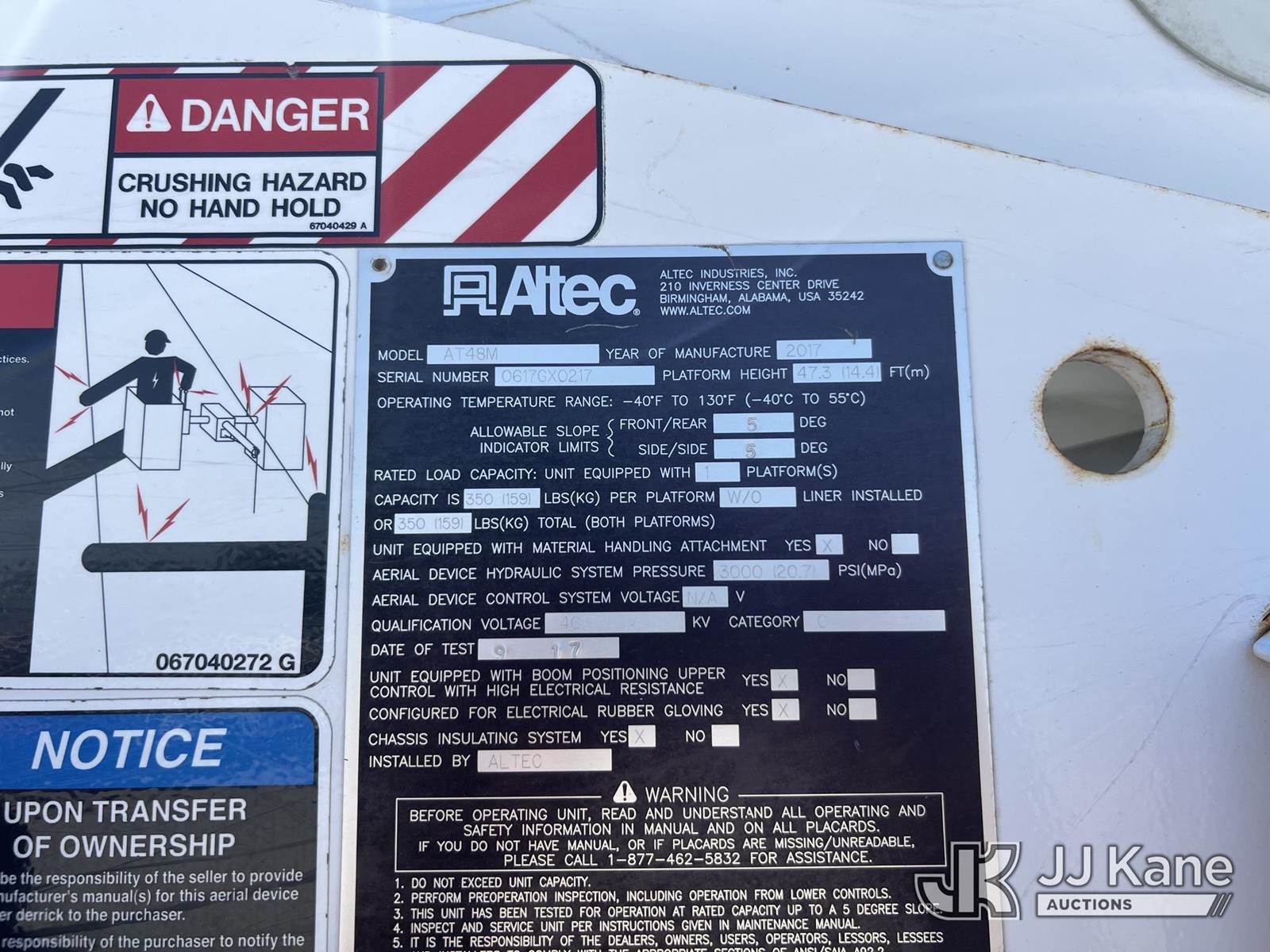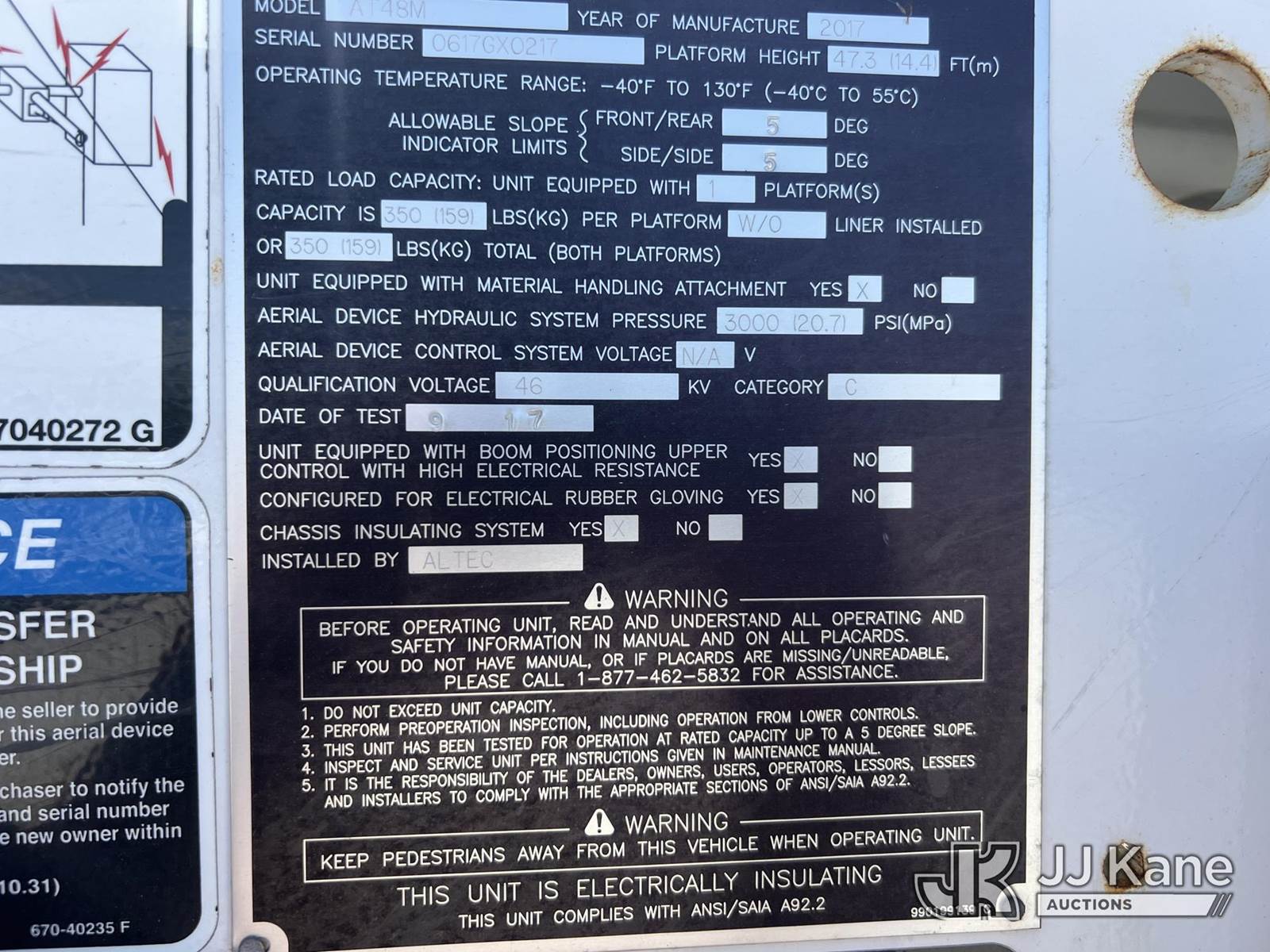 Altec AT48M, 53 ft, Articulating & Telescopic Material Handling Bucket Truck s/n 0617GX0217, with single-man bucket, center mounted on 2018 Freightliner M2 106 Utility Truck, Cummins ISB 6.7L diesel, Auto, A/C, with front winch, (52,806 miles (unverified)) (Runs, Moves & Upper Operates) (Jump To Start, Check Engine Light On) (TITLE DELAY) This is a Titled Item NOTE: This unit is being sold AS IS/WHERE IS via Timed Auction and is located in Chester, VA. Inspection & preview days for this unit are the 2 business days prior to the first day of items closing for this auction, item is located at 13301 Great Coastal Dr Chester, VA 23836 and hours of operations are 7am-3pm. For pre-sale questions, please contact Doug Caton @ 804-807-4574. (Manuals provided in cab) Sales Tax Collected Based on Residency Title To Come From Leasing Company In 30 Days(Buyer is responsible for removal. Assistance by consignor or JJ Kane Auctions is not assured.)