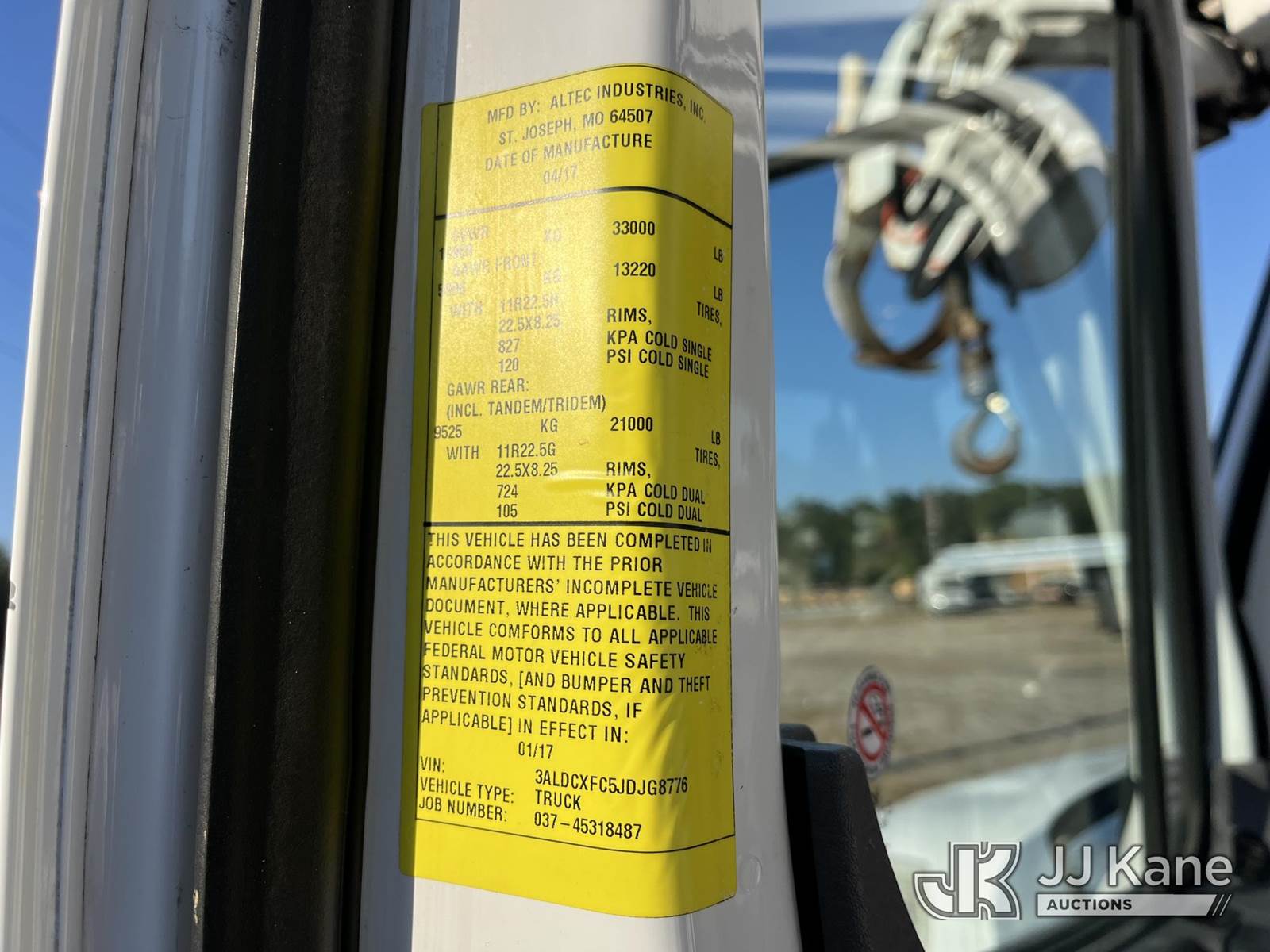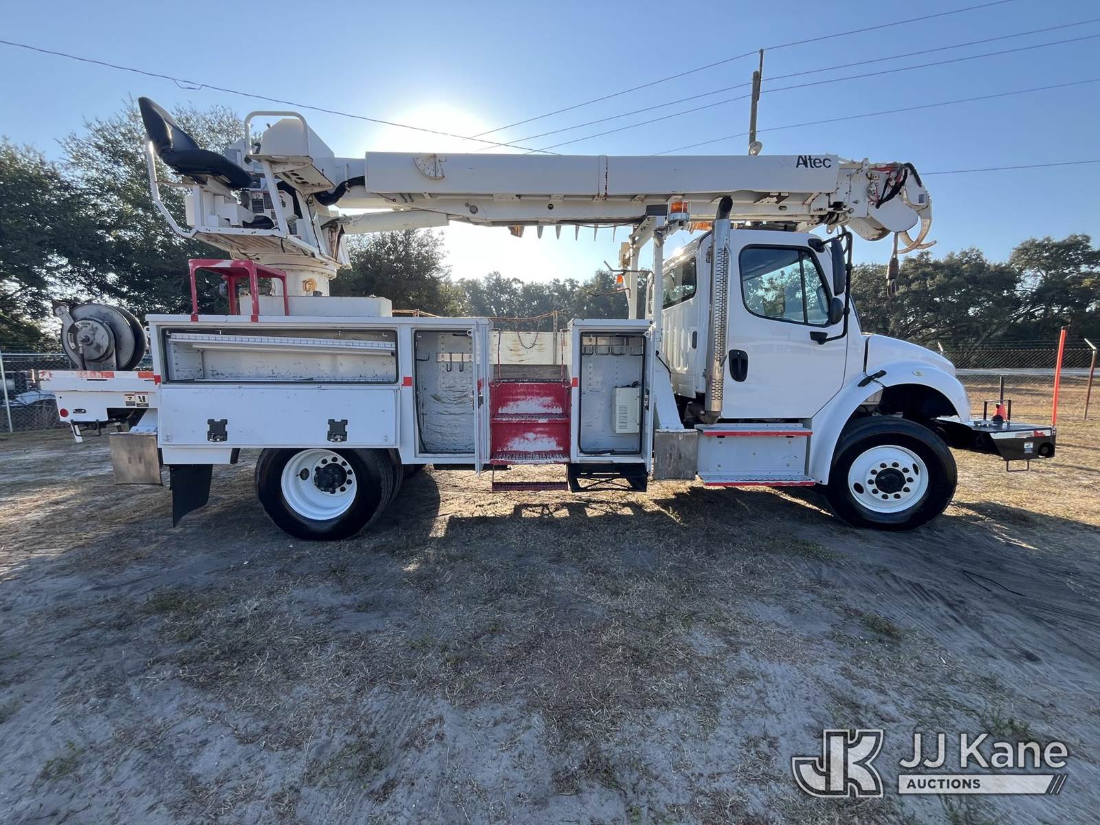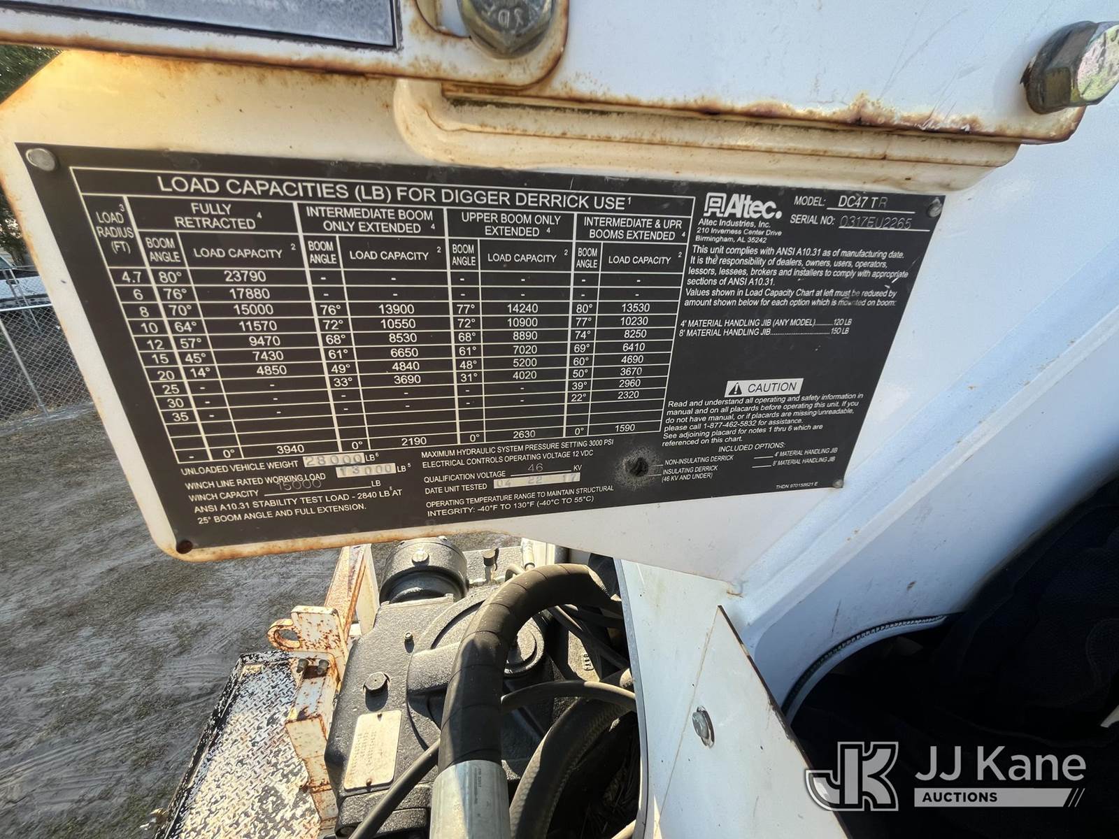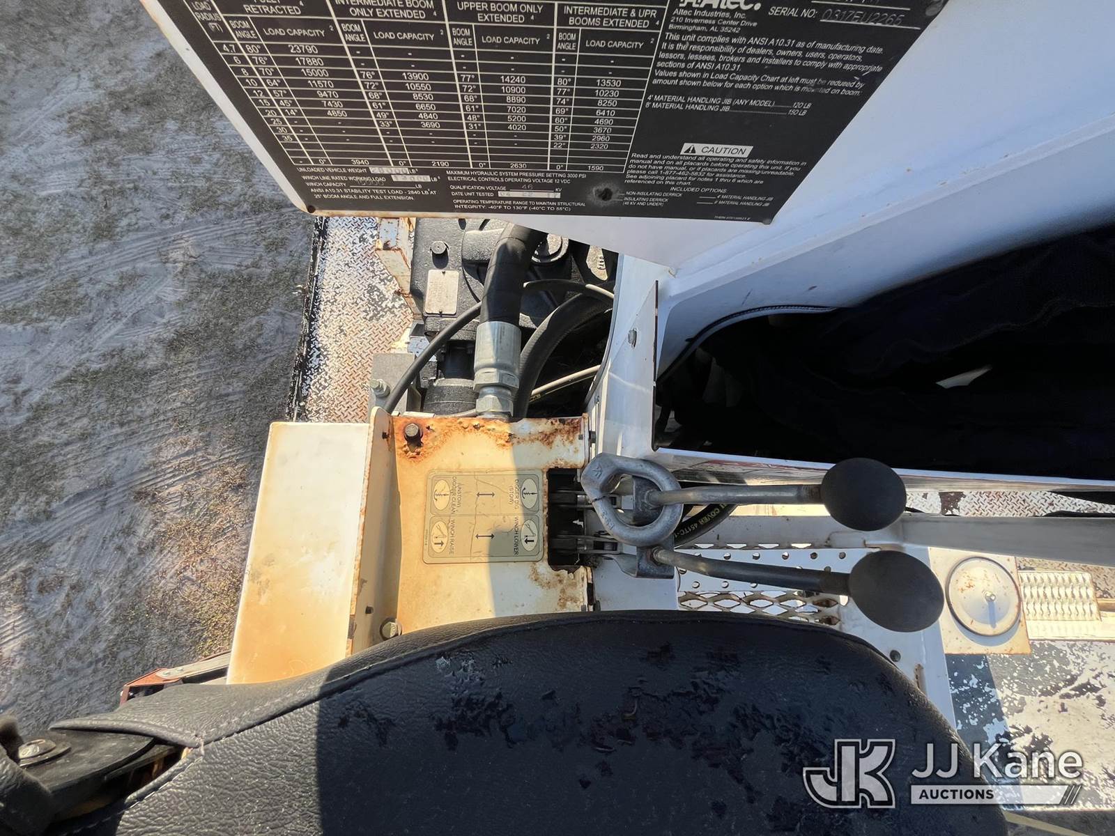Altec DC47-TR, 23,790 Lb Digger Derrick s/n 0317EU225, with 47 ft sheave height, 2spd digger, heel winch, pole grabs & riding console, rear mounted on 2018 Freightliner M2 106 4x4 Utility Truck, Cummins ISB 6.7L diesel, Auto, A/C, with front winch, (138,593 miles) (Runs, Moves & Upper Operates) (Paint/Rust issues) (Reads 8,370 hours) This is a Titled Item NOTE: This unit is being sold AS IS/WHERE IS via Timed Auction and is located in Thonotosassa, FL. Inspection & preview days for this unit are the 2 business days prior to the first day of items closing for this auction, item is located at 11720 N US 301 Thonotosassa, Fl 33592 and hours of operations are 8a-4p. For pre-sale questions, please contact Office Staff @ (813) 986-2485. (Manuals provided in cab) (Buyer is responsible for removal. Assistance by consignor or JJ Kane Auctioneers is not assured.)