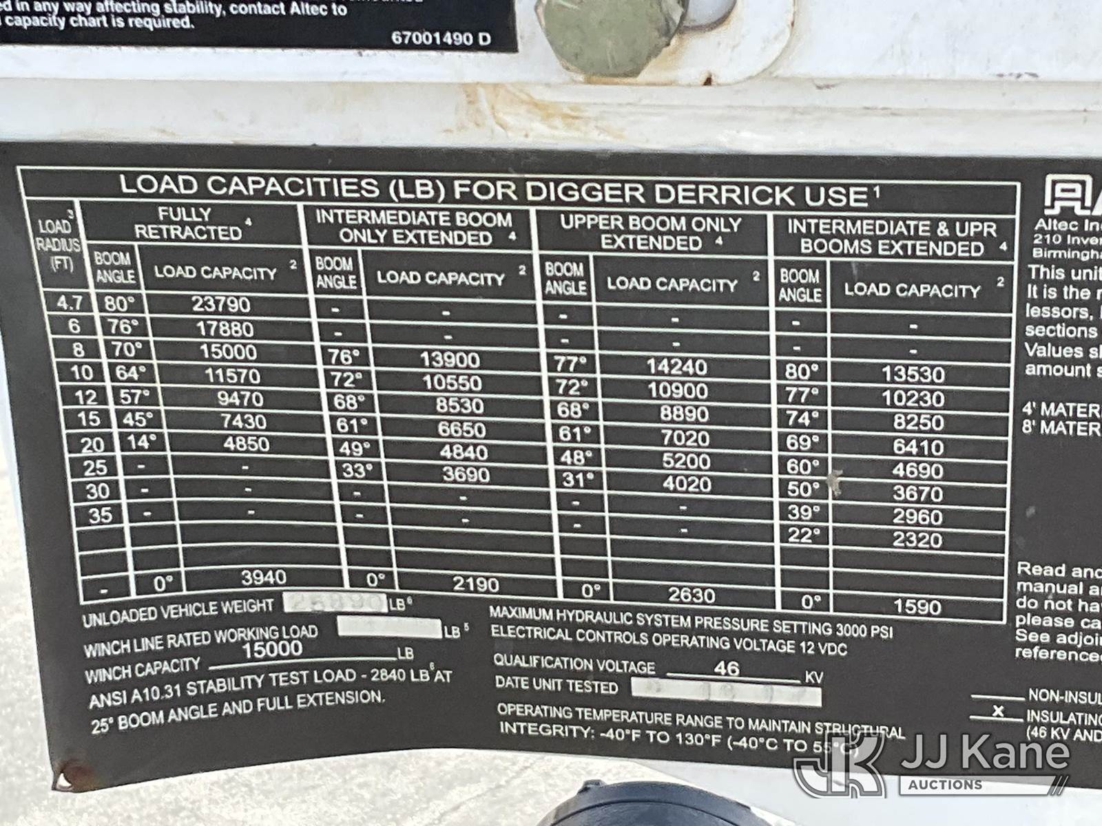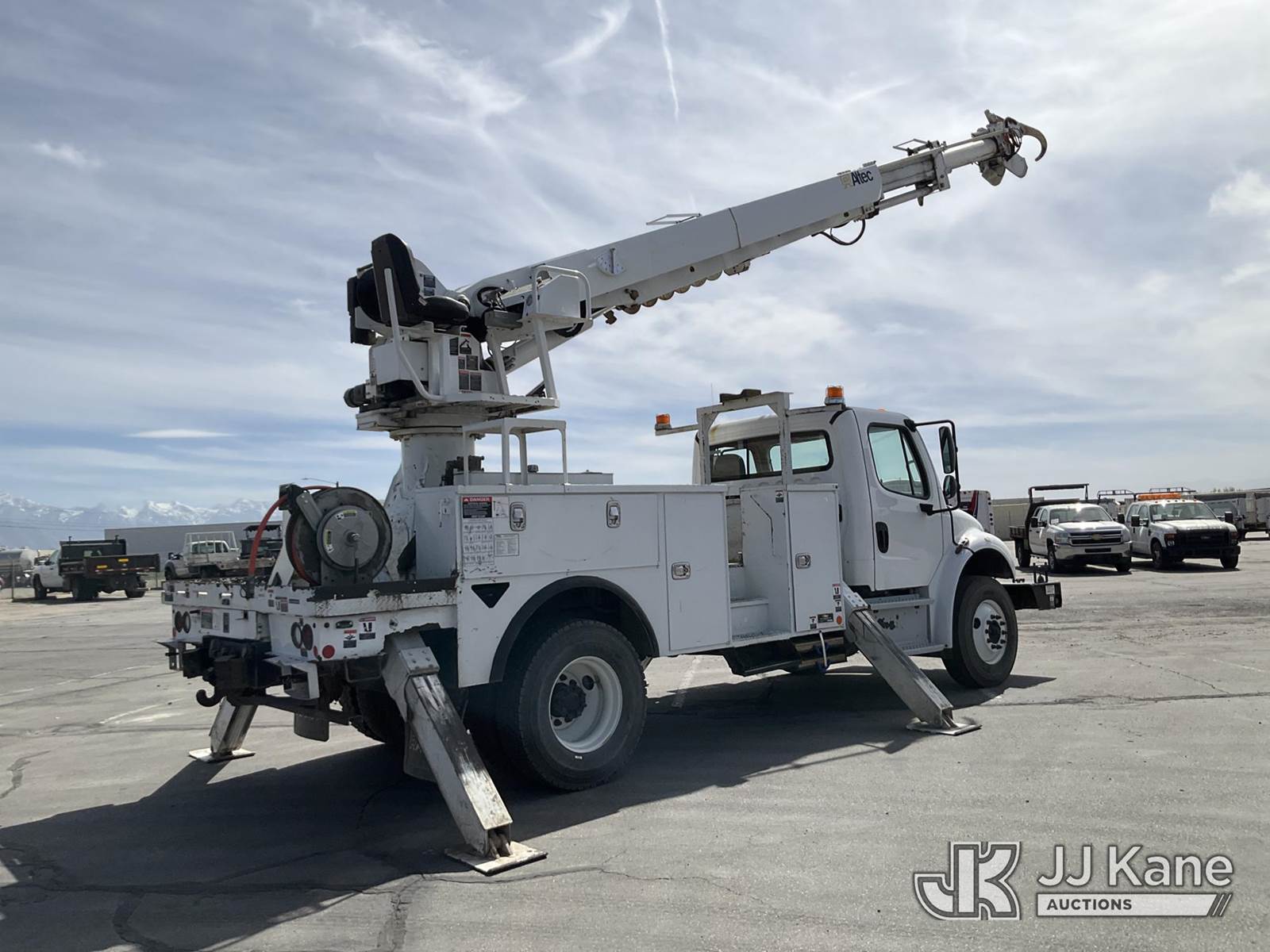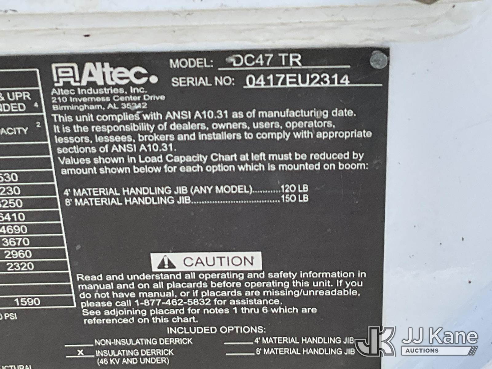 Altec DC47-TR, 23,790 Lb Digger Derrick s/n 0417EU2314, with 47ft sheave height, 3 section hyd boom, 2 spd digger, heel winch, pole grabs, riding console & 4 hyd outriggers, rear mounted on 2018 Freightliner M2 106 Service Truck, Cummins diesel, Auto, A/C, (099,381 miles) (Runs, Moves & Upper Operates) (No Winch Lines) (Reads 7,603 hours) This is a Titled Item NOTE: This unit is being sold AS IS/WHERE IS via Timed Auction and is located in Salt Lake City, UT. Inspection & preview days for this unit are the 2 business days prior to the first day of items closing for this auction, item is located at 2353 N Redwood Rd Salt Lake City, UT 84116 and hours of operations are 8a-4p. Titles executed exactly as bidder registered. Ensure your name and/or business name and address in JJ Kane and/or ProxiBid is correct before bidding. For pre-sale questions, please contact Office Staff @ (801) 519-0123. (Manuals provided in cab) (Buyer is responsible for removal. Assistance by consignor or JJ Kane Auctions is not assured.)