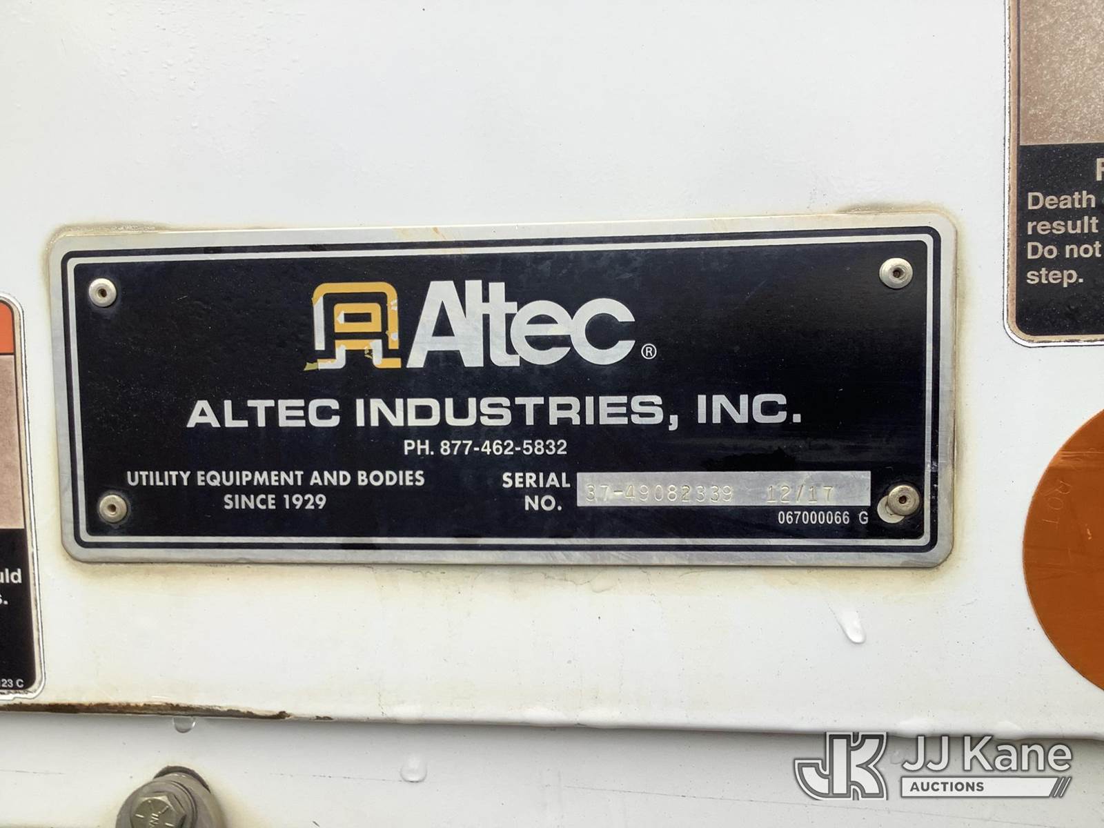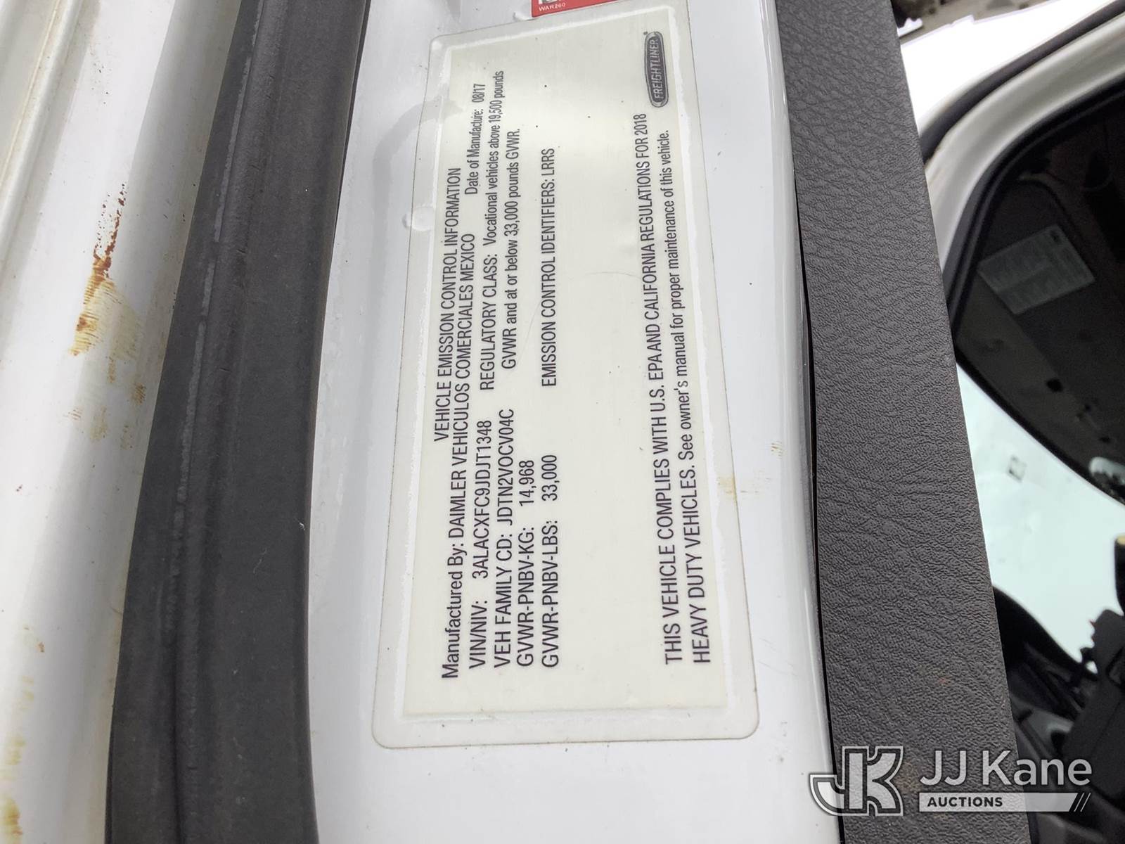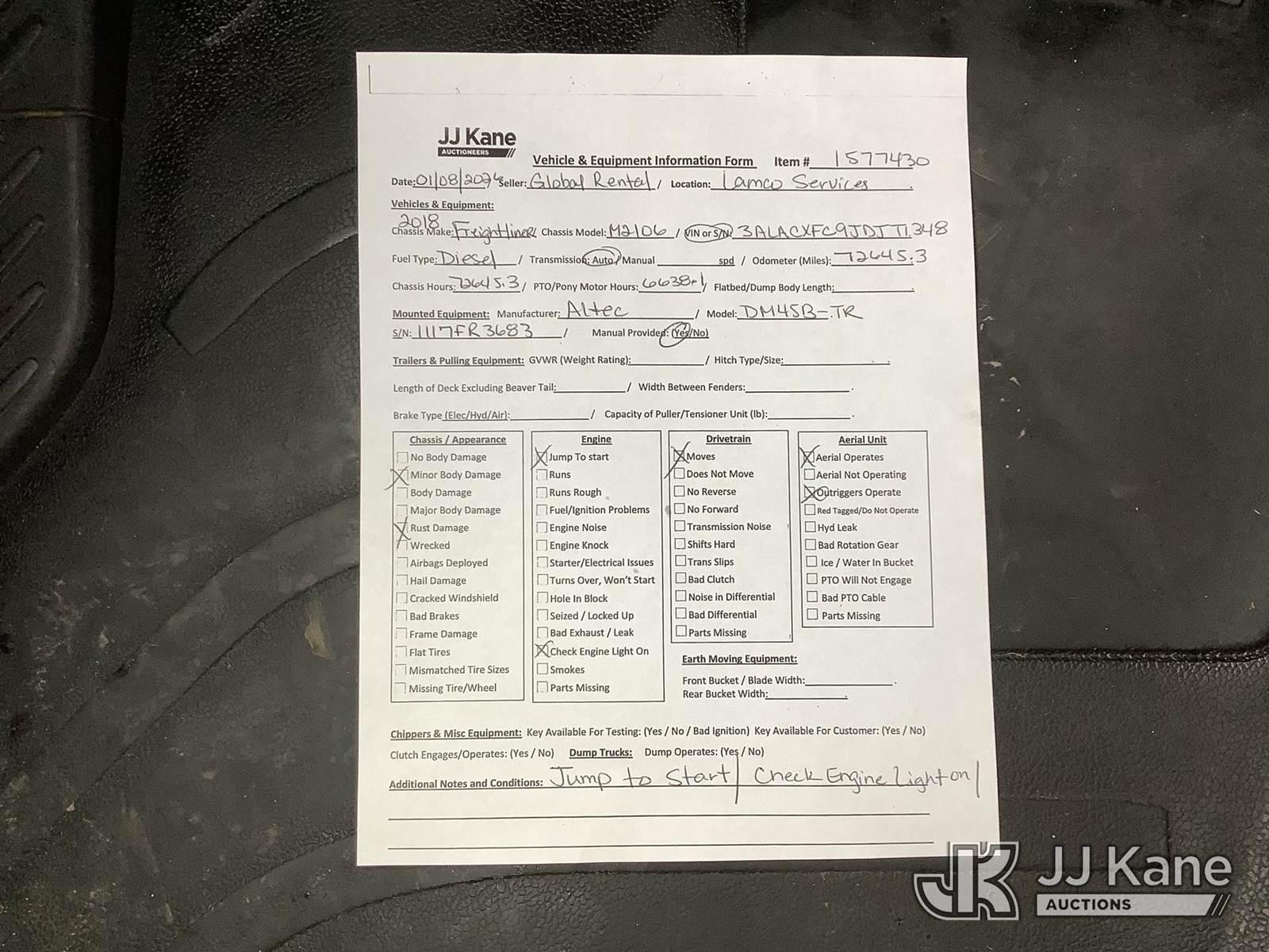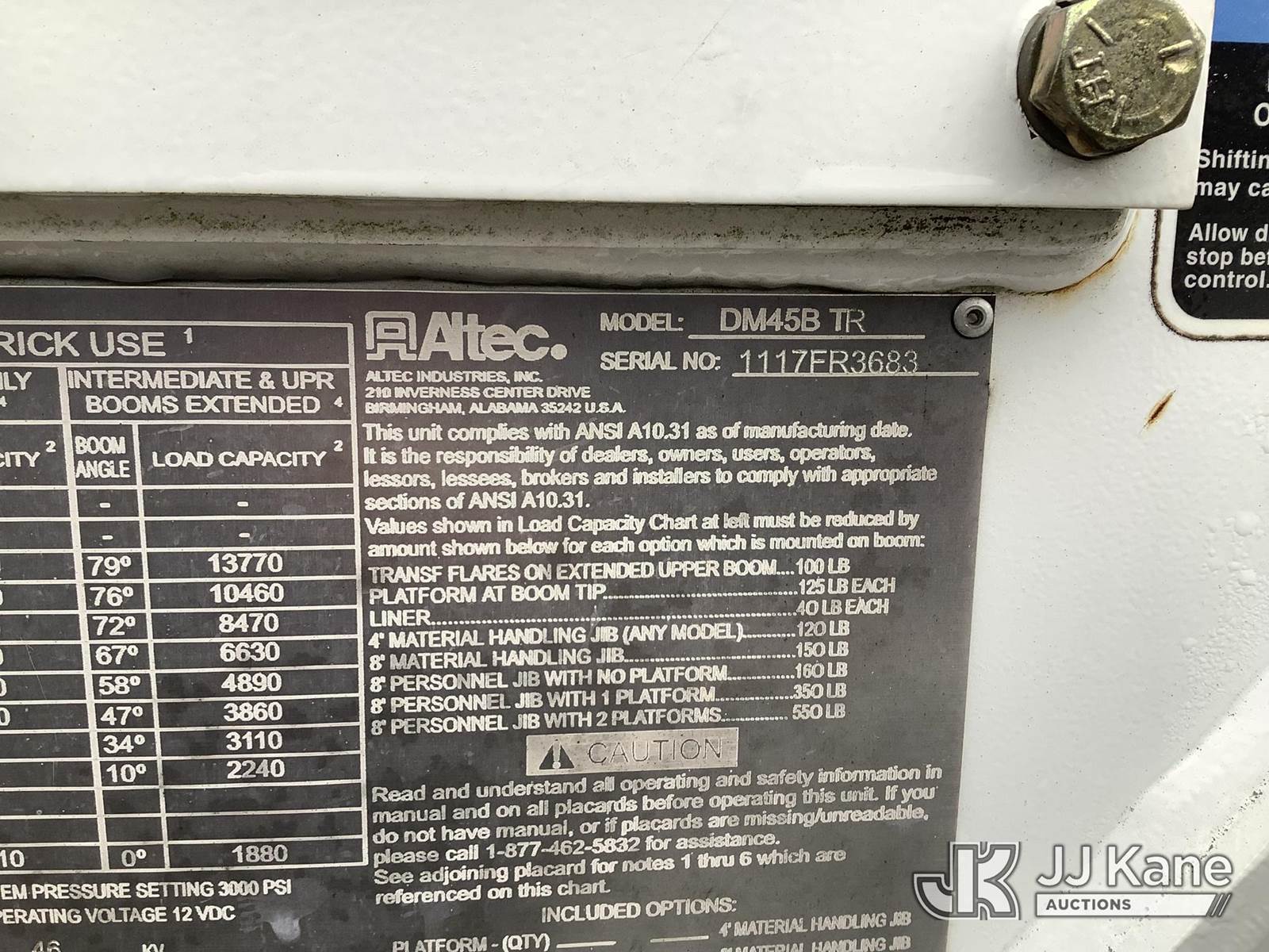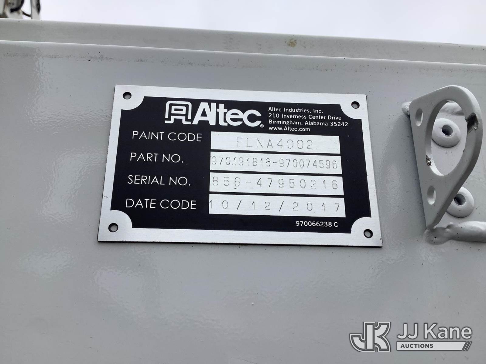 Altec DM45B-TR, 26,790 Lb Digger Derrick s/n 1117FR3683, with 45 ft. sheave height, 3 section hyd boom, 2 spd digger, heel winch, pole guides, riding console & 4 hyd outriggers, rear mounted on 2018 Freightliner M2 106 Utility Truck, Cummins 6.7L diesel, Auto, (72,645 miles) (Runs, Jump To Start, Moves, Upper Condition Unknown) ( Check Engine Light On, Body/Rust Damage) This is a Titled Item NOTE: This unit is being sold AS IS/WHERE IS via Timed Auction and is located in Graysville, AL. Inspection & preview days for this unit are by appointment only; please contact us at contact@jjkane.com or 84-Go-JJKane for more details. Alabama Auctioneer Michael Whitebread - License # 5592 (Missing manuals, See Auction Company for Manufacturers Information to obtain manuals) (Buyer is responsible for removal. Assistance by consignor or JJ Kane Auctions is not assured.)