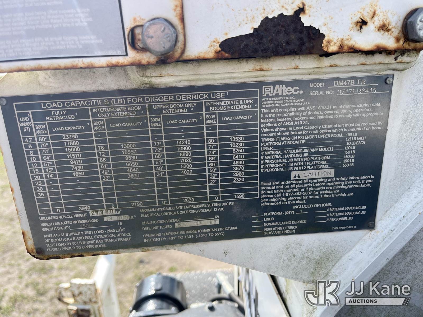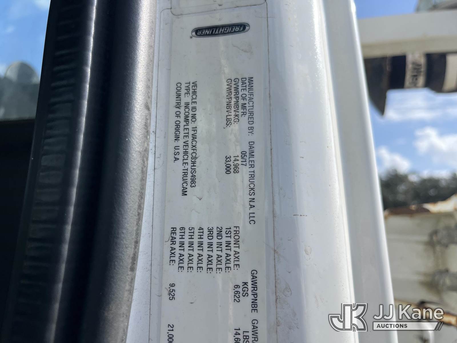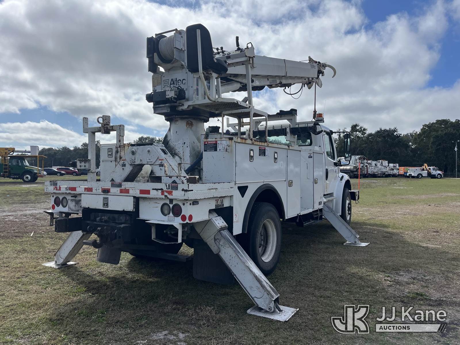 Altec DM47B-TR, 23,790 Lb Digger Derrick s/n 0717FR3415, with 47 ft. sheave height, 3 section hyd boom, 2 spd digger, heel winch, pole guides, riding console & 4 hyd outriggers, rear mounted on 2018 Freightliner M2 Utility Truck, 6.7L diesel, Auto, A/C, with front winch, capstan, (59,785 miles) (Runs, Moves, Upper Operates) (Radio Not Included, Rust) (FL Residents Purchasing Titled Items - tax, title & registration fees will be collected at the maximum rate of $400.00 under 25,999 and $800.00 for Over 26,000 and $250.00 trailers - Proof of insurance is mandatory; Out of State Residents Purchasing Title Items - tax will be collected based upon your state rate.) (Reads 7,074 hours) This is a Titled Item NOTE: This unit is being sold AS IS/WHERE IS via Timed Auction and is located in Thonotosassa, FL. For more information & removal arrangements please contact Office Staff @ 813-986-2485. (Buyer is responsible for removal. Assistance by consignor or JJ Kane Auctions is not assured.)