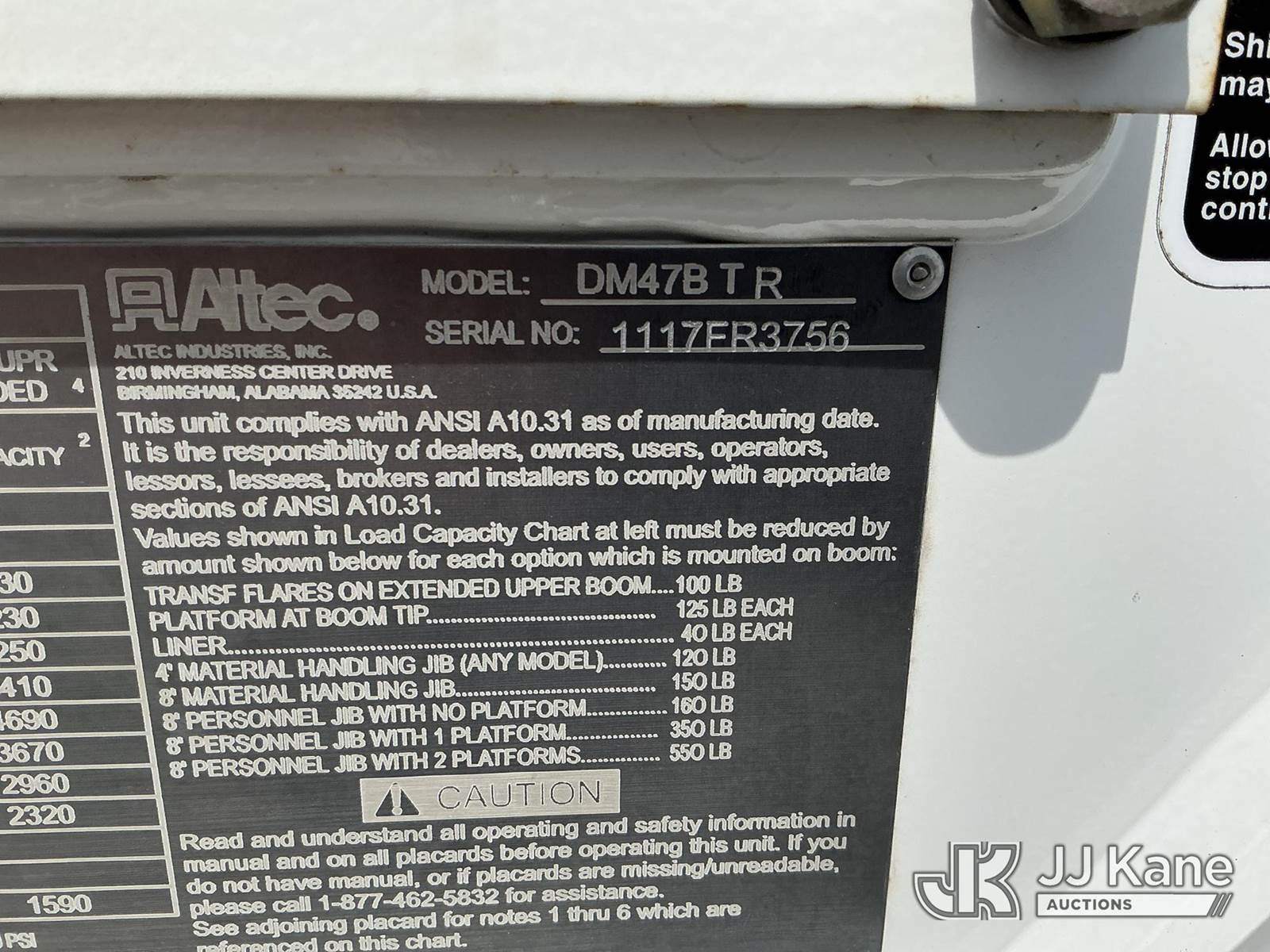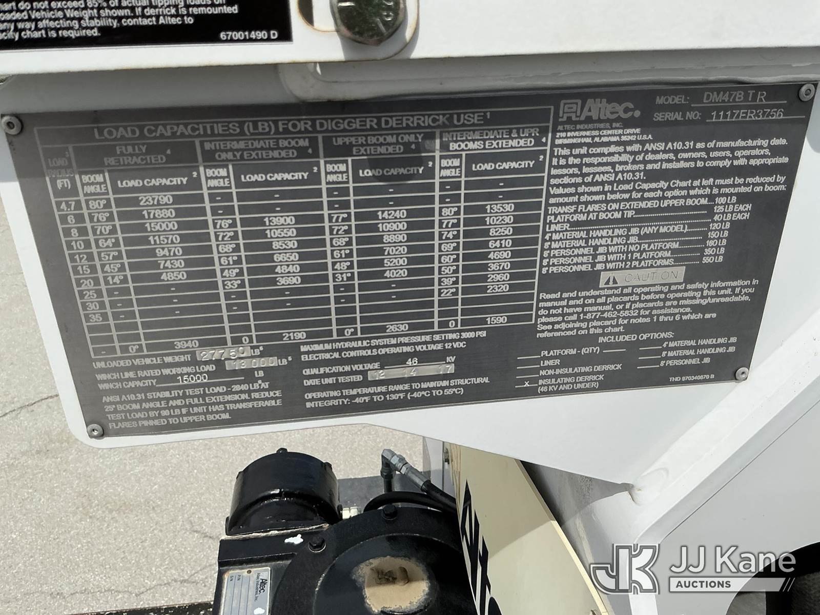 Altec DM47B-TR, 23,790 Lb Digger Derrick s/n 1117FR3756, with 47 Ft. Sheave Height, Heel Winch, 2 Spd. Digger, Control Console W/ Riding Seat, 4 Hydraulic Outriggers & Capstan Winch, rear mounted on 2018 Freightliner M2 Utility Truck, Cummins ISB 6.7L Diesel 4wd, diesel, Auto, A/C, (21,354 miles (unverified)) (Runs, Moves & Upper Operates) (Reads 4,365 hours) This is a Titled Item NOTE: This unit is being sold AS IS/WHERE IS via Timed Auction and is located in Kansas City, MO. Inspection & preview days for this unit are the 2 business days prior to the first day of items closing for this auction, item is located at 962 Tel Aviv Ave Kansas City, MO 64153 and hours of operations are 8a-4p. For pre-sale questions, please contact Ricky McPherson @ (816) 610-2250. (Manuals provided in cab) (Buyer is responsible for removal. Assistance by consignor or JJ Kane Auctions is not assured.)