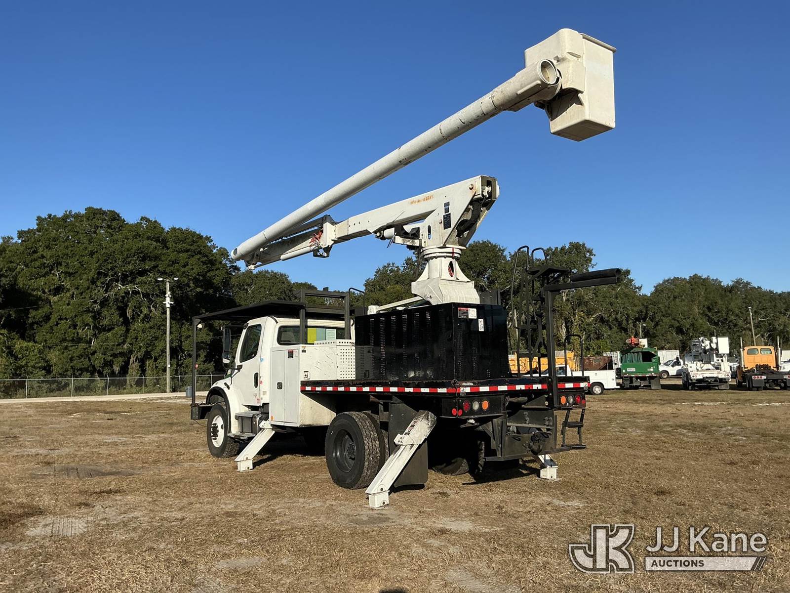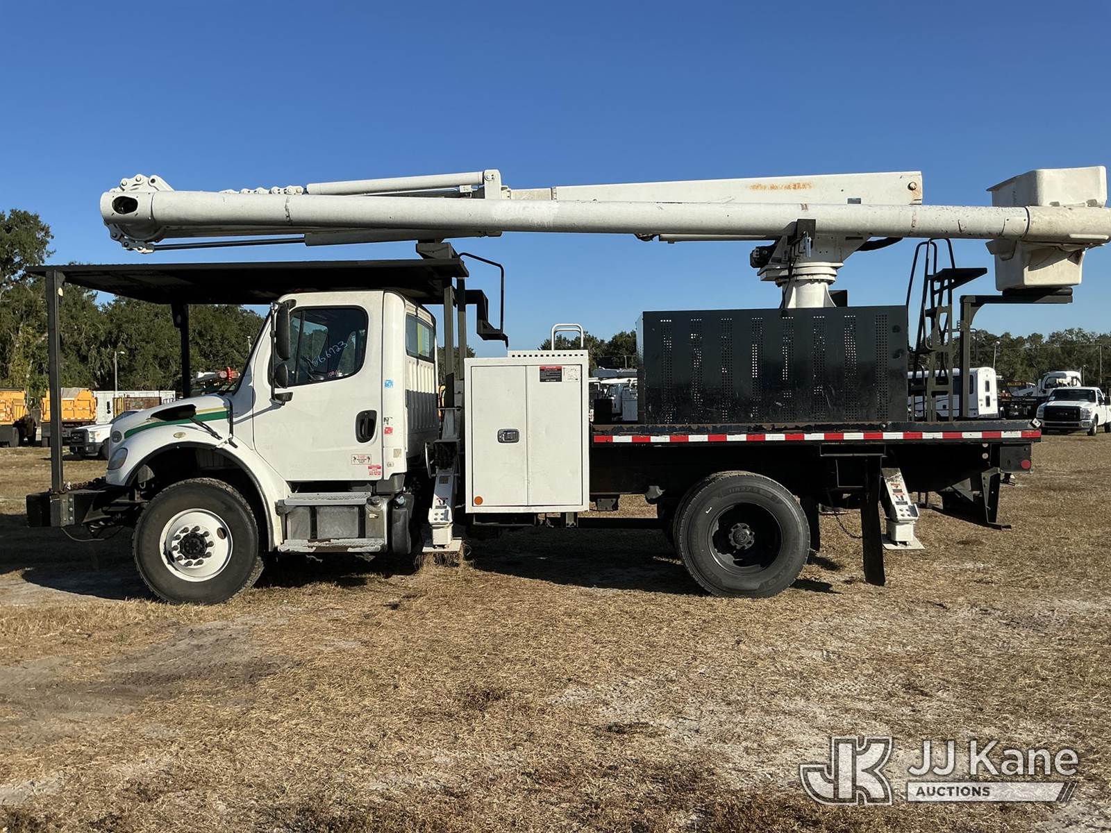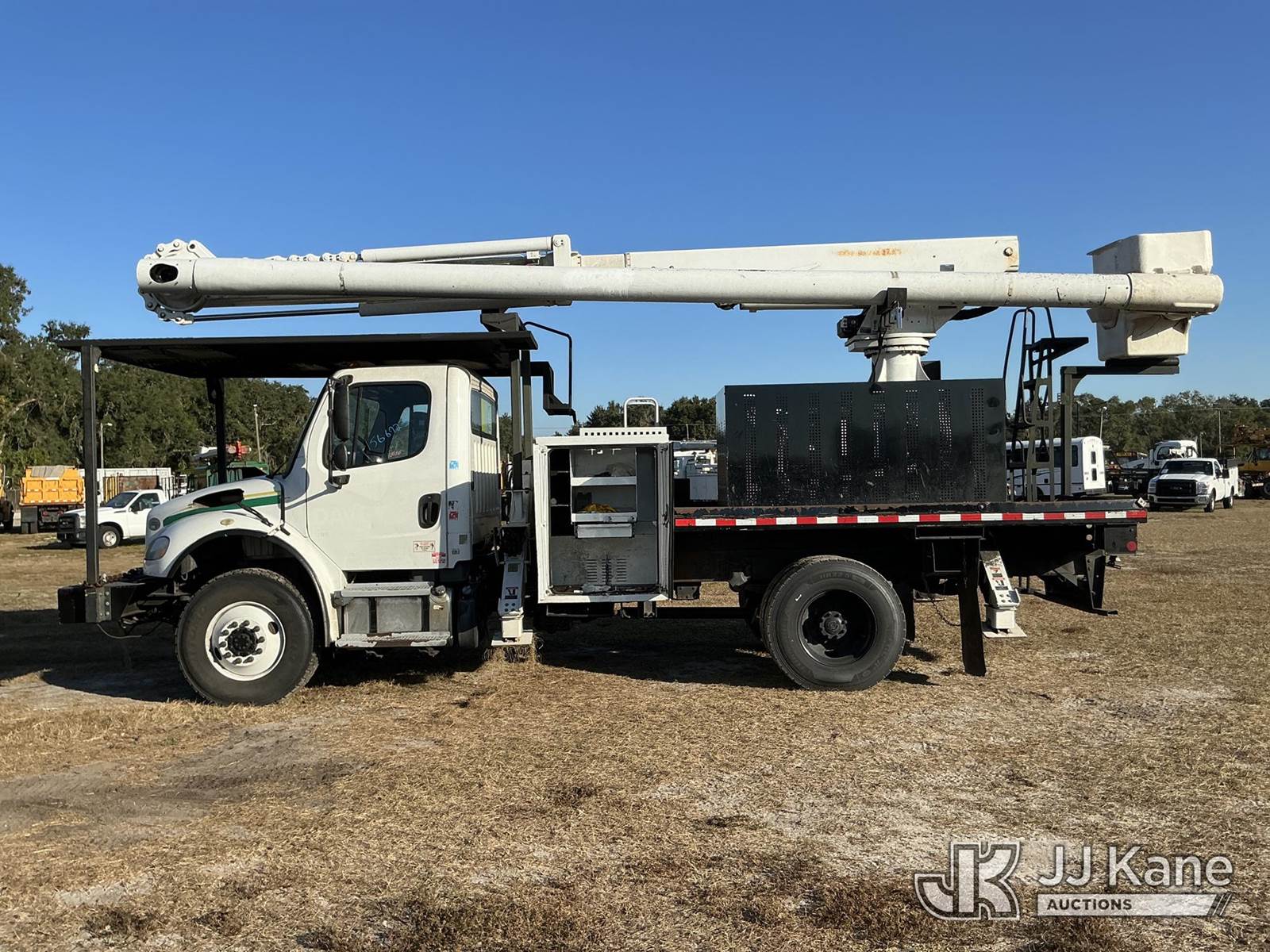 Altec LR7-60E70-RM, 75 ft, Over-Center Elevator Bucket Truck s/n 0318FF8242, with single-man bucket, 2 hyd. outriggers, rear mounted on 2018 Freightliner M2 Flatbed/Utility Truck, manual, diesel, A/C, (76,797 miles) (Runs, Moves, & Upper Operates)(Paint Damage) (FL Residents Purchasing Titled Items - tax, title & registration fees will be collected at the maximum rate of $400.00 under 25,999 and $800.00 for Over 26,000 and $250.00 trailers - Proof of insurance is mandatory; Out of State Residents Purchasing Title Items - tax will be collected based upon your state rate.) (Reads 9,348 hours) This is a Titled Item NOTE: This unit is being sold AS IS/WHERE IS via Timed Auction and is located in Thonotosassa, FL. For more information & removal arrangements please contact Office Staff @ 813-986-2485. (Manuals provided in cab) (Buyer is responsible for removal. Assistance by consignor or JJ Kane Auctioneers is not assured.)