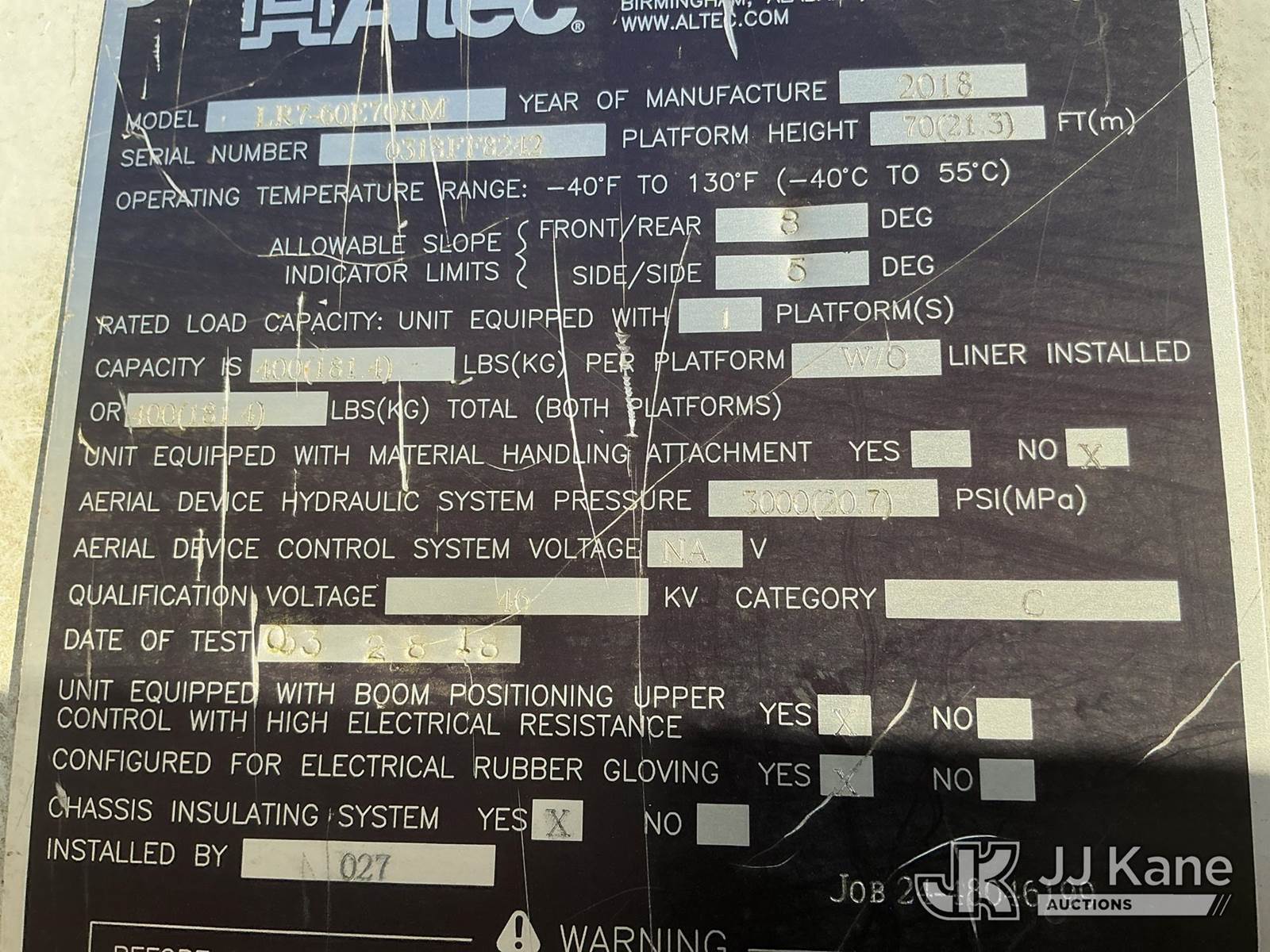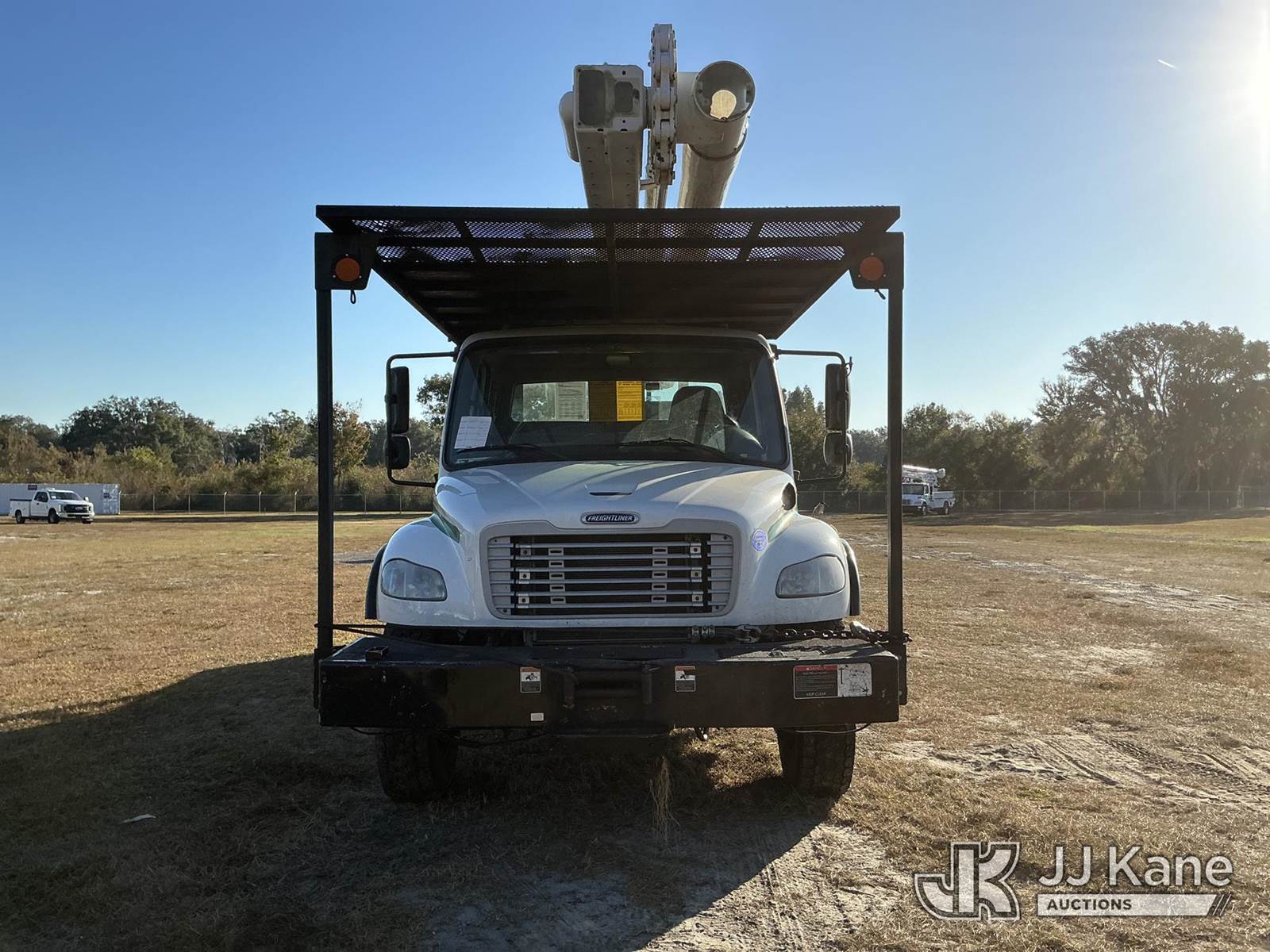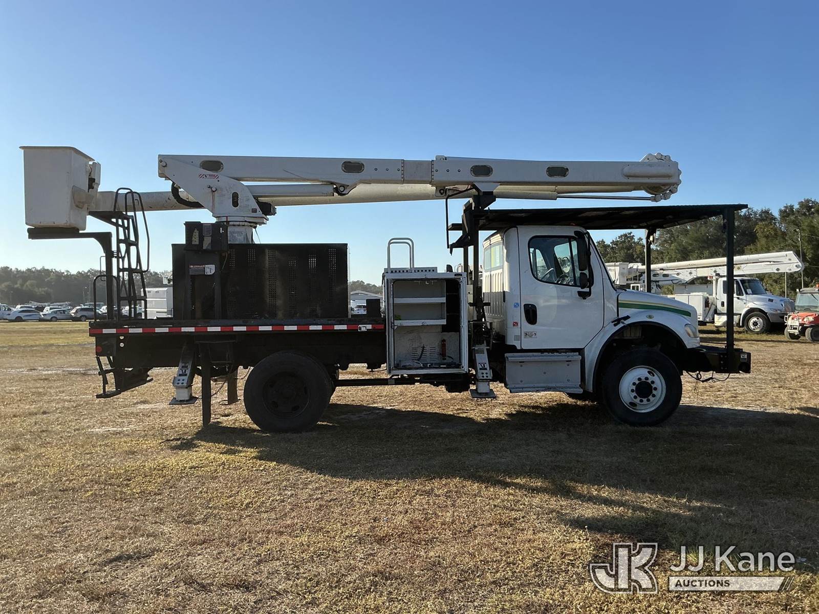 Altec LR7-60E70-RM, 75 ft, Over-Center Elevator Bucket Truck s/n 0318FF8242, with single-man bucket, 2 hyd. outriggers, rear mounted on 2018 Freightliner M2 Flatbed/Utility Truck, manual, diesel, A/C, (76,797 miles) (Runs, Moves, & Upper Operates)(Paint Damage) (FL Residents Purchasing Titled Items - tax, title & registration fees will be collected at the maximum rate of $400.00 under 25,999 and $800.00 for Over 26,000 and $250.00 trailers - Proof of insurance is mandatory; Out of State Residents Purchasing Title Items - tax will be collected based upon your state rate.) (Reads 9,348 hours) This is a Titled Item NOTE: This unit is being sold AS IS/WHERE IS via Timed Auction and is located in Thonotosassa, FL. For more information & removal arrangements please contact Office Staff @ 813-986-2485. (Manuals provided in cab) (Buyer is responsible for removal. Assistance by consignor or JJ Kane Auctioneers is not assured.)