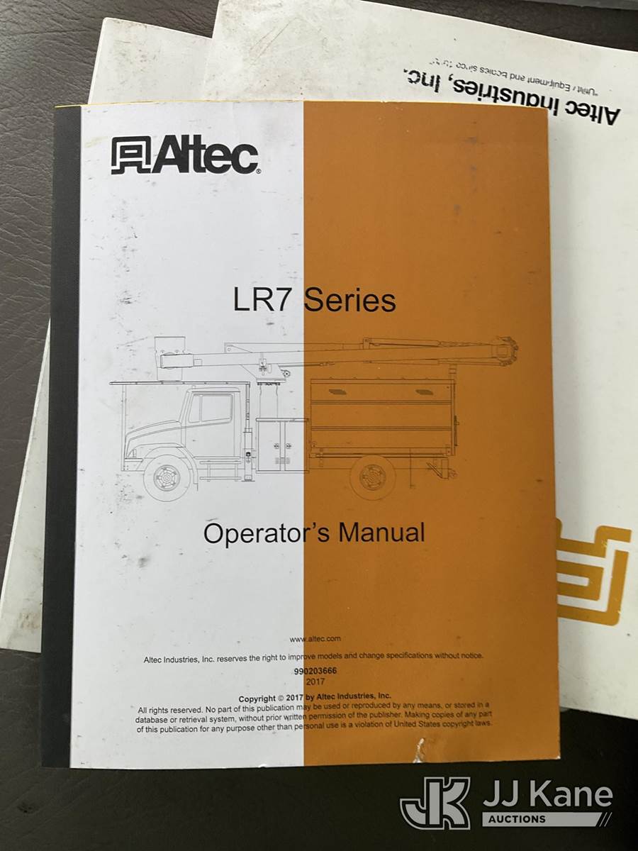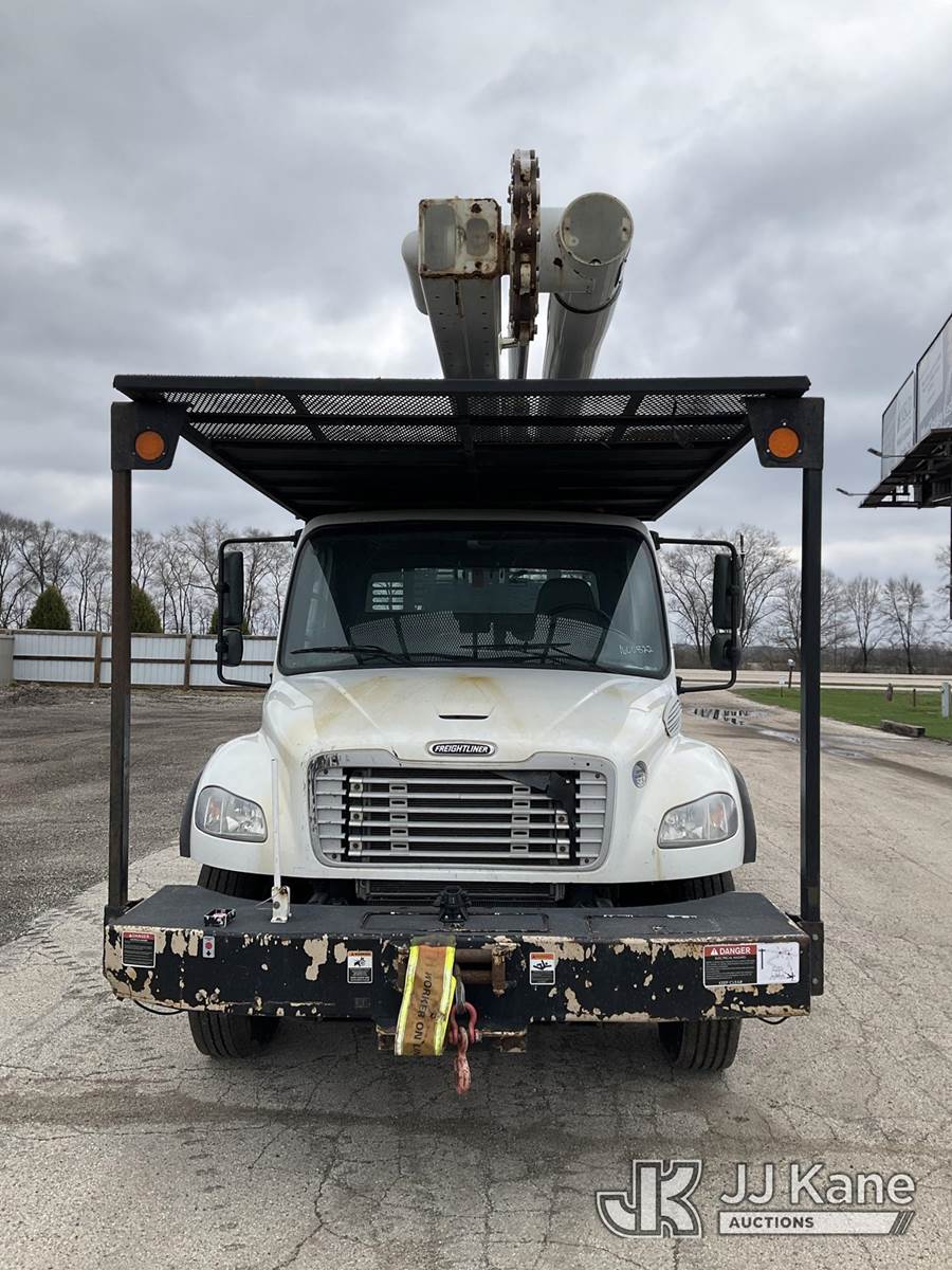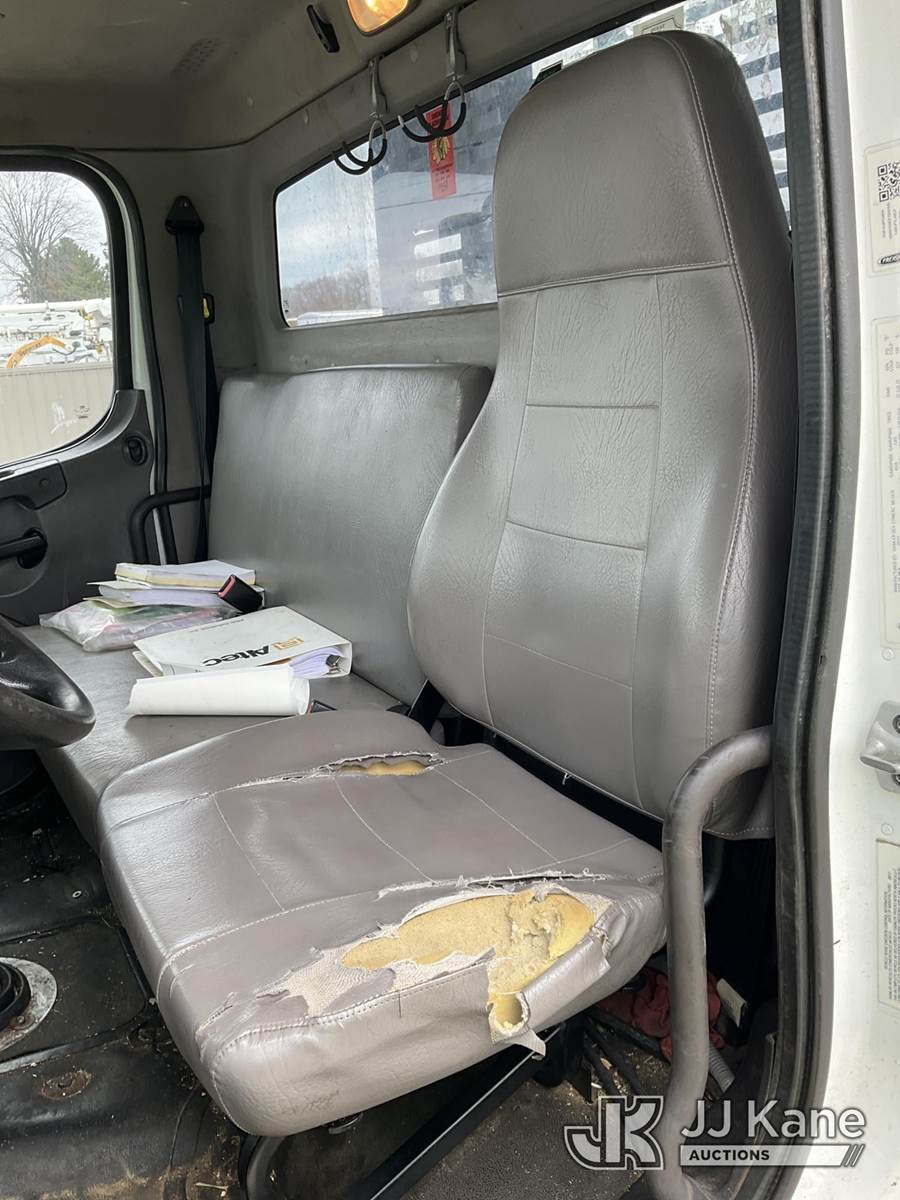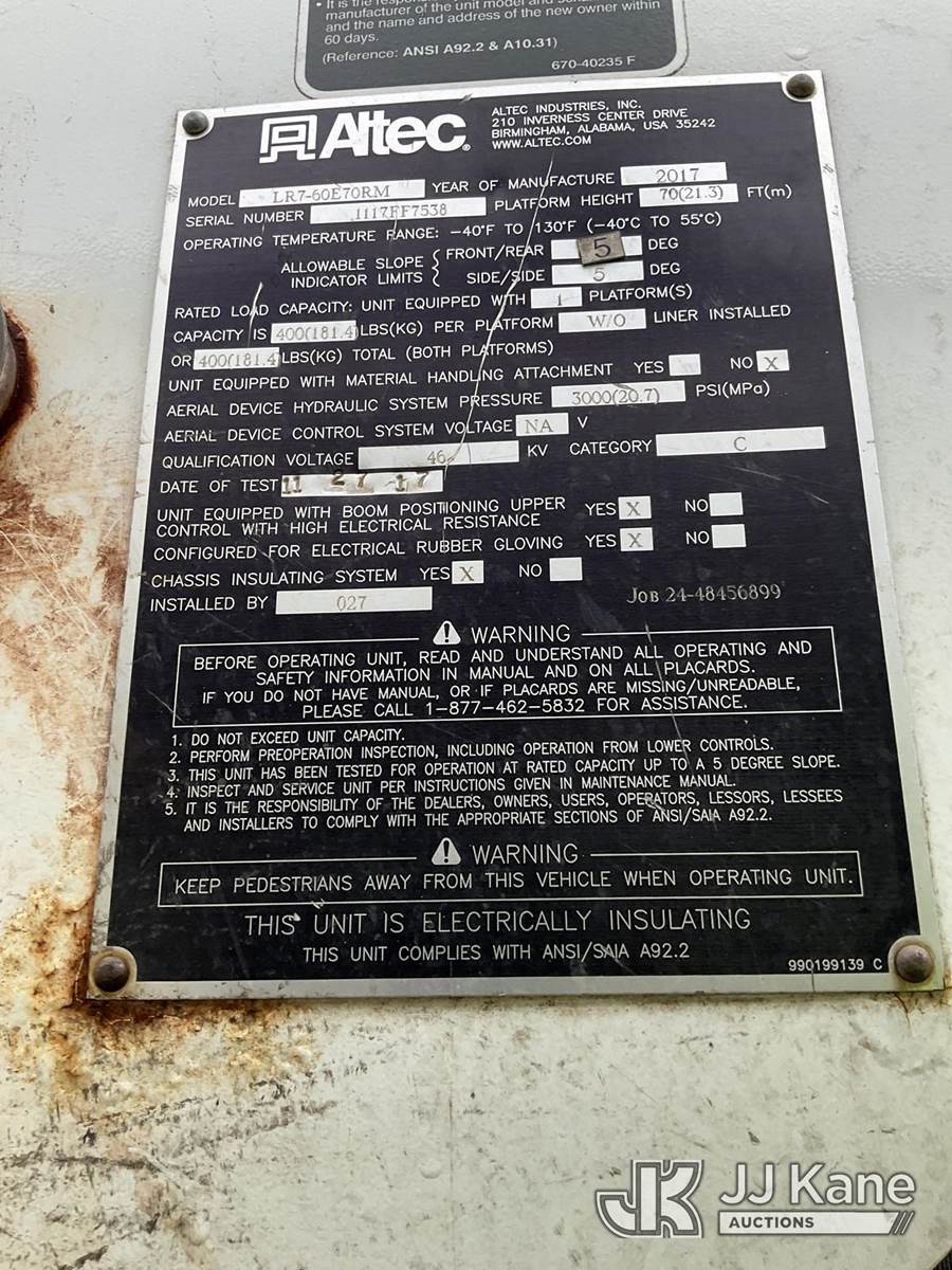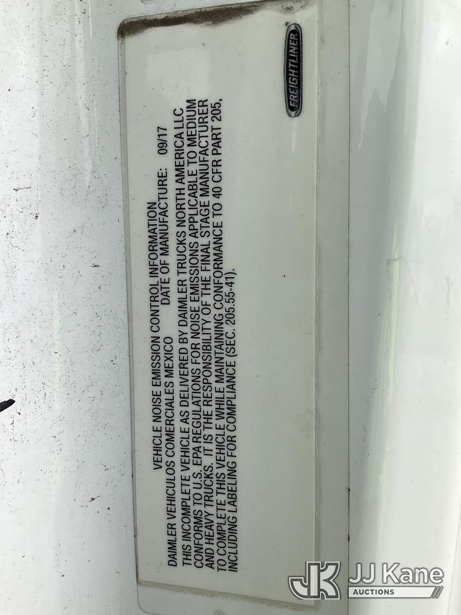 Altec LR7-60E70RM, 75 ft, Over-Center Elevator Bucket Truck s/n 1117FF7538, with Single-Man Bucket, 4 Hydraulic Outriggers, mounted on 2018 Freightliner M2 106 Flatbed/Service Truck, Cummins 6.7L Diesel 6-spd manual, A/C, with front bumper winch, (120,157 miles) (Runs, Moves, Hydraulic System Defect-Do Not Engage PTO, Upper Condition Unknown) (Brake System Non-Operational, Dash Indicator Light On, Windshield Deficiencies) (Seller States-Major repairs needed) (Reads 12,976 hours) This is a Titled Item NOTE: This unit is being sold AS IS/WHERE IS via Timed Auction and is located in South Beloit, IL. Inspection & preview days for this unit are the 2 business days prior to the first day of items closing for this auction, item is located at 14354 Dearborn Ave South Beloit, IL and hours of operations are 8a-4p. For pre-sale questions, please contact Derek Eklund at (608) 904-0618 or (derek.eklund@jjkane.com). (Manuals provided in cab) (Buyer is responsible for removal. Assistance by consignor or JJ Kane Auctions is not assured.)