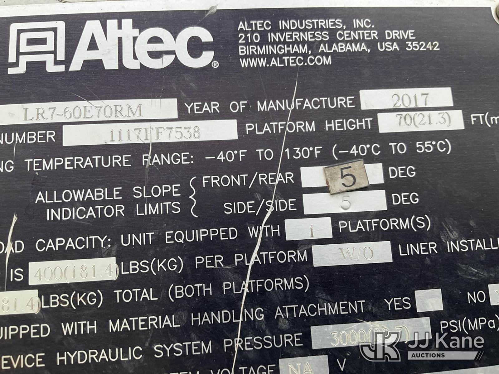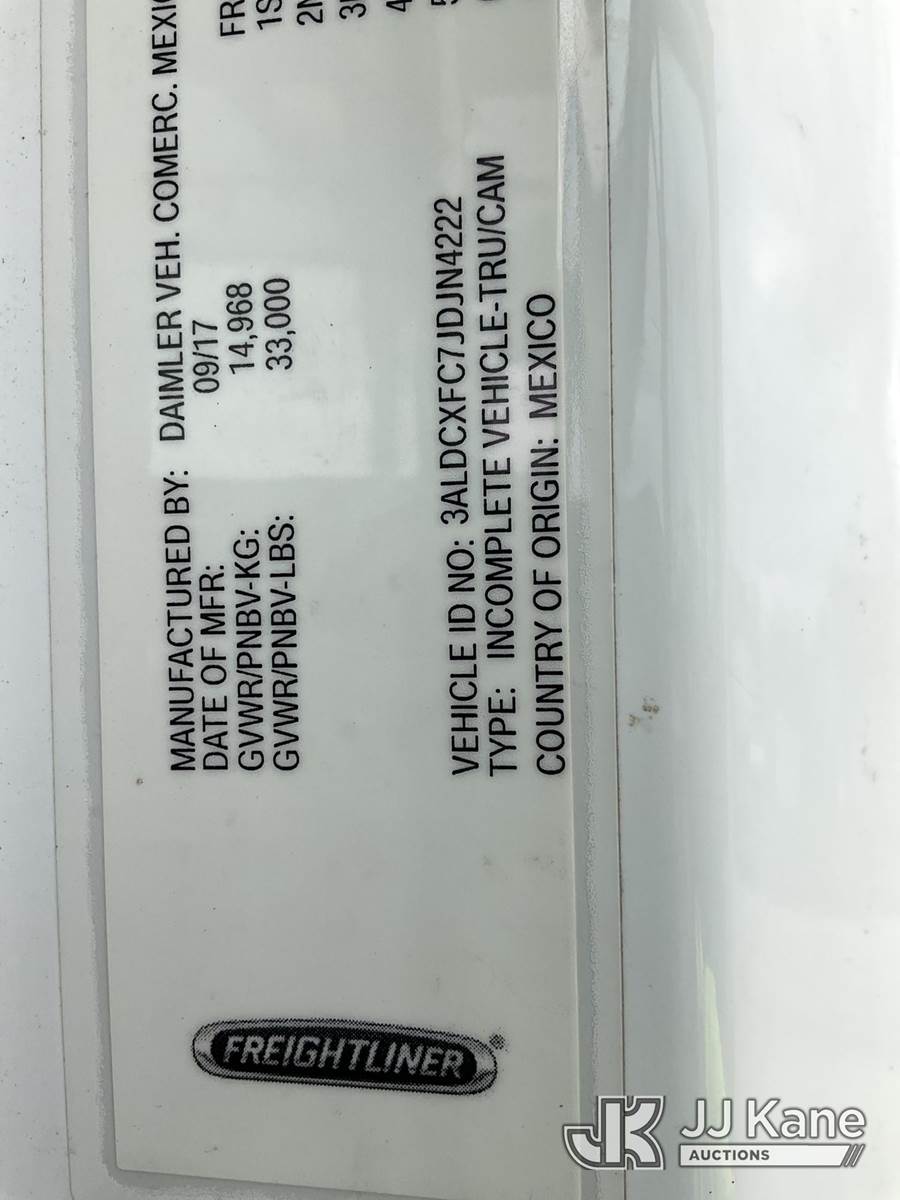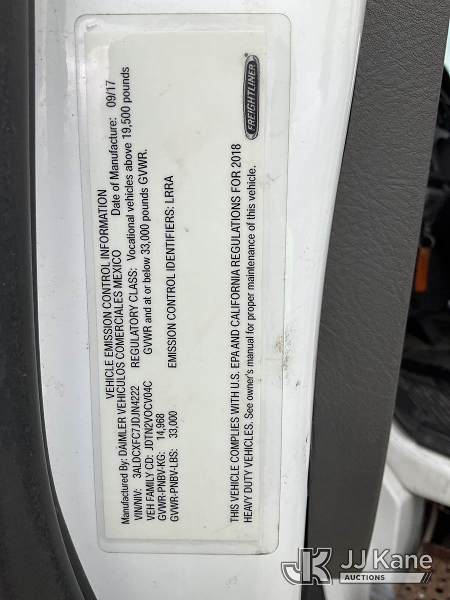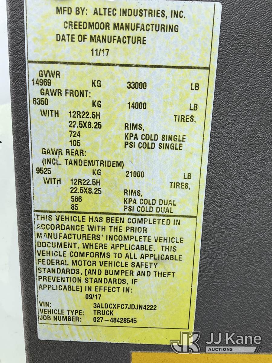 Altec LR7-60E70RM, 75 ft, Over-Center Elevator Bucket Truck s/n 1117FF7538, with Single-Man Bucket, 4 Hydraulic Outriggers, mounted on 2018 Freightliner M2 106 Flatbed/Service Truck, Cummins 6.7L Diesel 6-spd manual, A/C, with front bumper winch, (120,157 miles) (Runs, Moves, Hydraulic System Defect-Do Not Engage PTO, Upper Condition Unknown) (Brake System Non-Operational, Dash Indicator Light On, Windshield Deficiencies) (Seller States-Major repairs needed) (Reads 12,976 hours) This is a Titled Item NOTE: This unit is being sold AS IS/WHERE IS via Timed Auction and is located in South Beloit, IL. Inspection & preview days for this unit are the 2 business days prior to the first day of items closing for this auction, item is located at 14354 Dearborn Ave South Beloit, IL and hours of operations are 8a-4p. For pre-sale questions, please contact Derek Eklund at (608) 904-0618 or (derek.eklund@jjkane.com). (Manuals provided in cab) (Buyer is responsible for removal. Assistance by consignor or JJ Kane Auctions is not assured.)