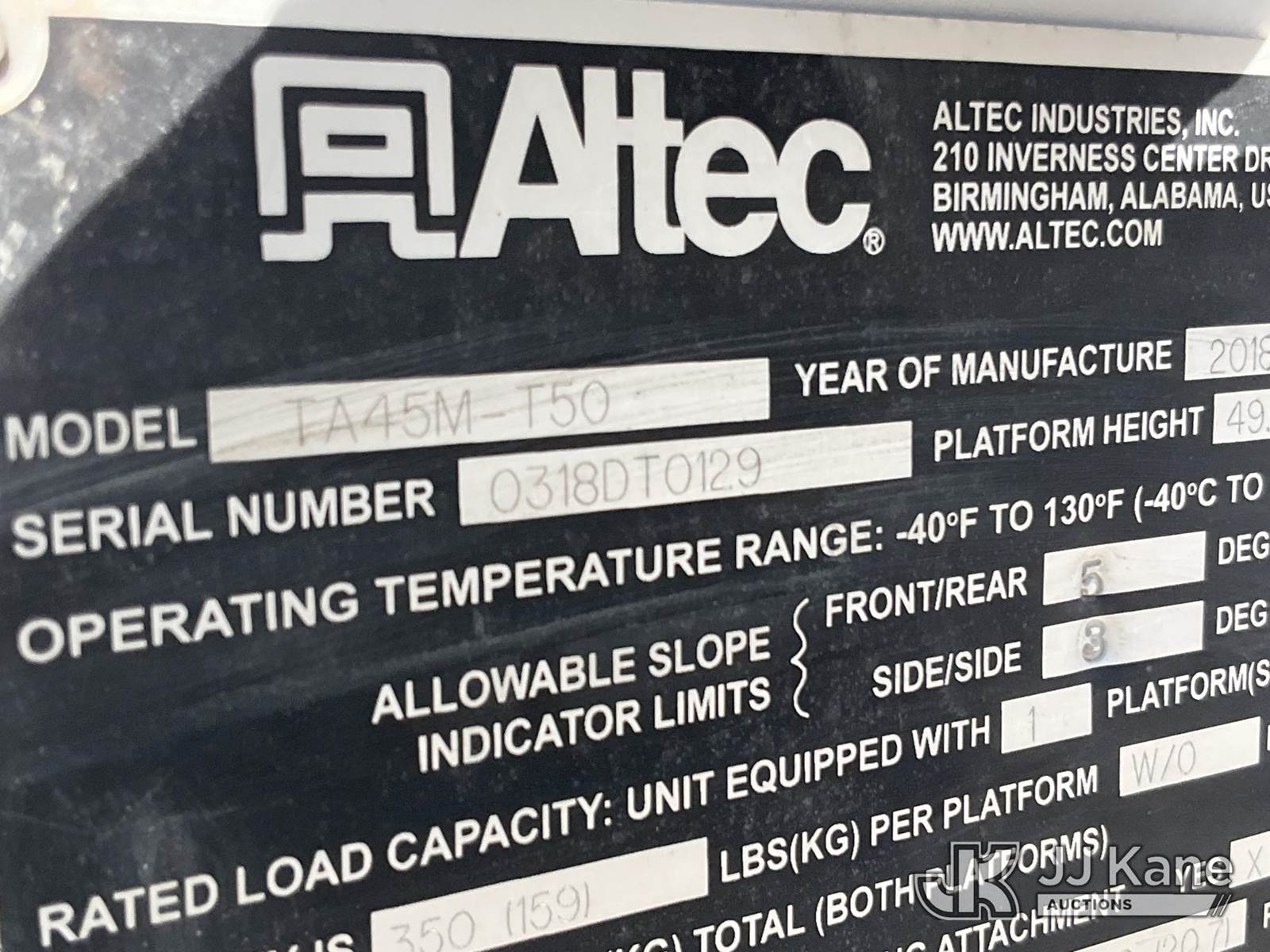 Altec TA45M-T50, 55 ft, Articulating & Telescopic Material Handling Elevator Bucket Truck s/n 0318DT0129, with single man bucket, mounted behind cab on 2018 Freightliner M2 Utility Truck, 6.7L diesel, Auto, A/C, (50,858 miles) (Runs, Moves & Upper Operates) This is a Titled Item NOTE: This unit is being sold AS IS/WHERE IS via Timed Auction and is located in Waxahachie, TX. Inspection & preview days for this unit are the 2 business days prior to the first day of items closing for this auction, item is located at 999 Solon Rd Waxahachie, TX 75165 and hours of operations are 8a-4p. For pre-sale questions, please contact Alex Bayless @ (469) 550-4938. (Manuals provided in cab) (Buyer is responsible for removal. Assistance by consignor or JJ Kane Auctions is not assured.)