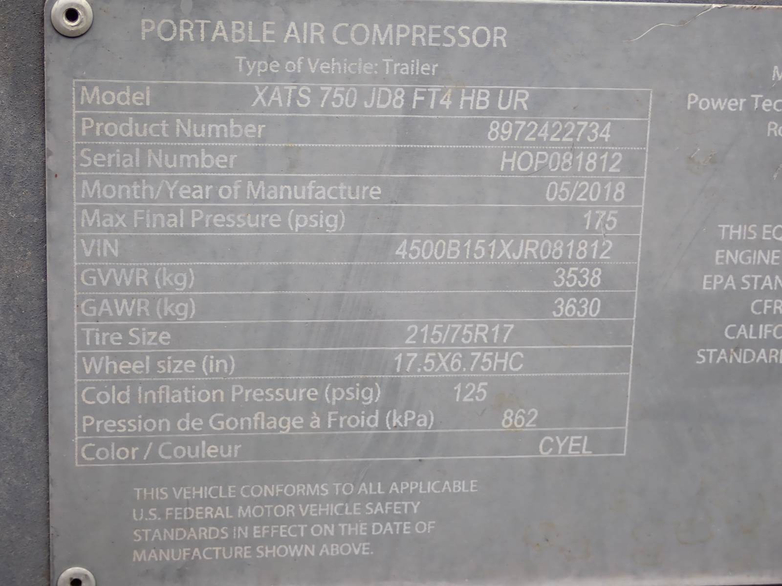 2018 Atlas Copco XATS750 JD8 FT4 air compressor, 750 CFM at 150 PSI rating, selectable pressure settings, 100-175 PSI working pressure range, John Deere turbo diesel engine, tier 4 interim emissions rating, trailer mounted, towable, 10,002 hours on meter. GOOD RUNNING COMPRESSOR, SEE DEMO VIDEO -- NICE UNIT -- HIGH PRESSURE RATING, TRAILER MOUNTED, RELIABLE JOHN DEERE POWER -- GET IT COMING ! ** HOURS SEEM HIGH FOR THE AGE OF COMPRESSOR, WE WERE UNABLE TO DETERMINE IF HOURS ARE ACCURATE OR IF THERE WAS A PROBLEM W/ METER, UNIT IS PRICED FOR THE HOURS SHOWING BUT WE FEEL TRUE HOURS MAY BE LOWER **