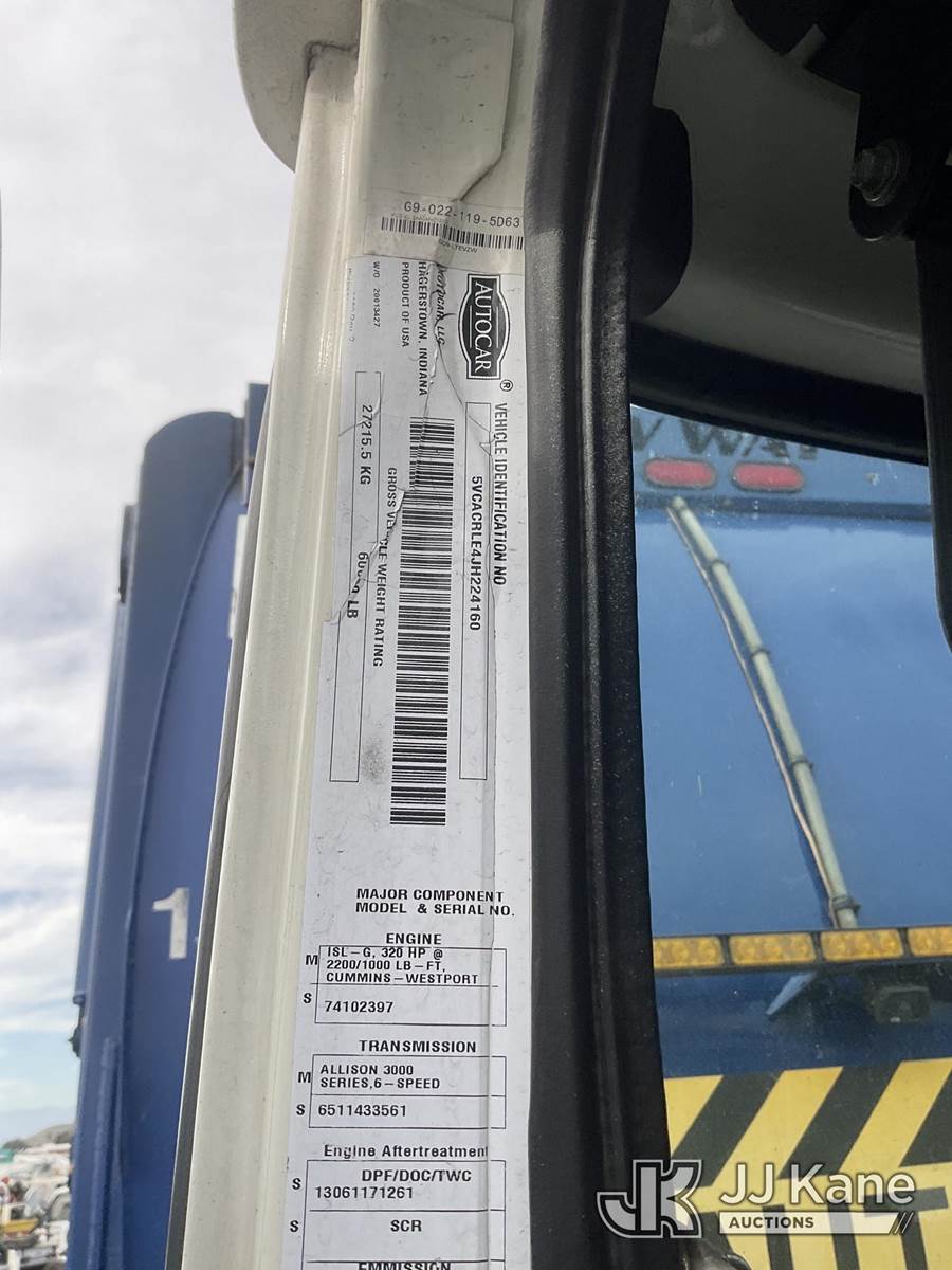 2018 Autocar ACX Xpeditor T/A Trash Truck, 6-cyl, 6X4, CNG Only, Auto, A/C, with Aluminum Wheels, (096,745 miles) (Runs & Moves) This is a Titled Item NOTE: This unit is being sold AS IS/WHERE IS via Timed Auction and is located in Jurupa Valley, CA. Inspection & preview days for this unit are the 2 business days prior to the first day of items closing for this auction, item is located at 4510 Muth Way Jurupa Valley, CA 92509 and hours of operations are 8a-4p. For pre-sale questions, please contact please contact Office Staff @ (310) 353-7140. Dealer License Number 45696. (Buyer is responsible for removal. Assistance by consignor or JJ Kane Auctions is not assured.)