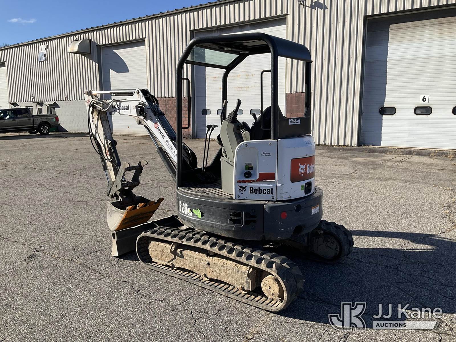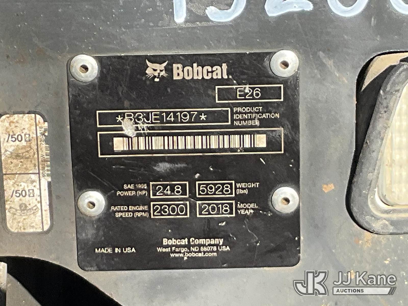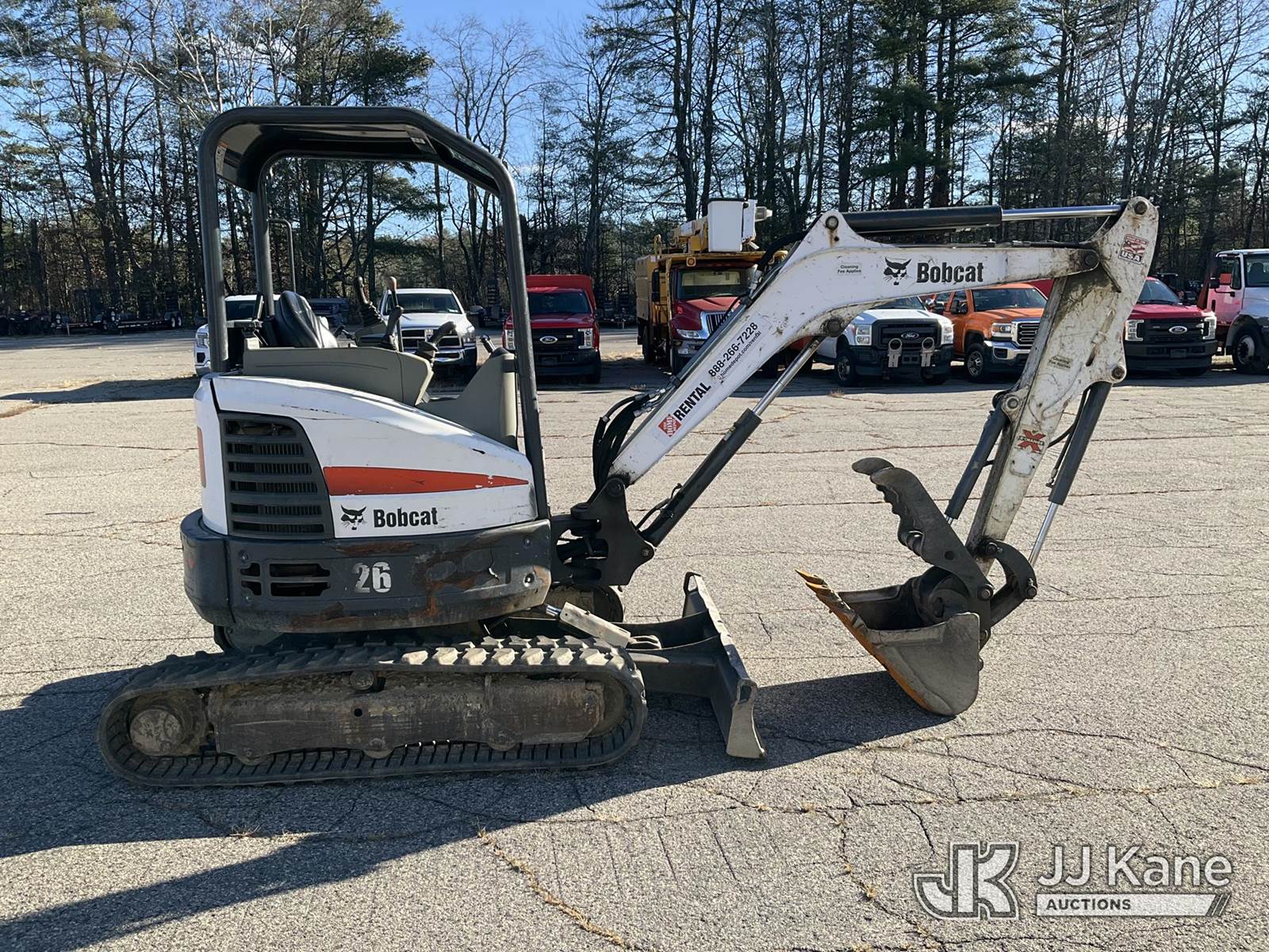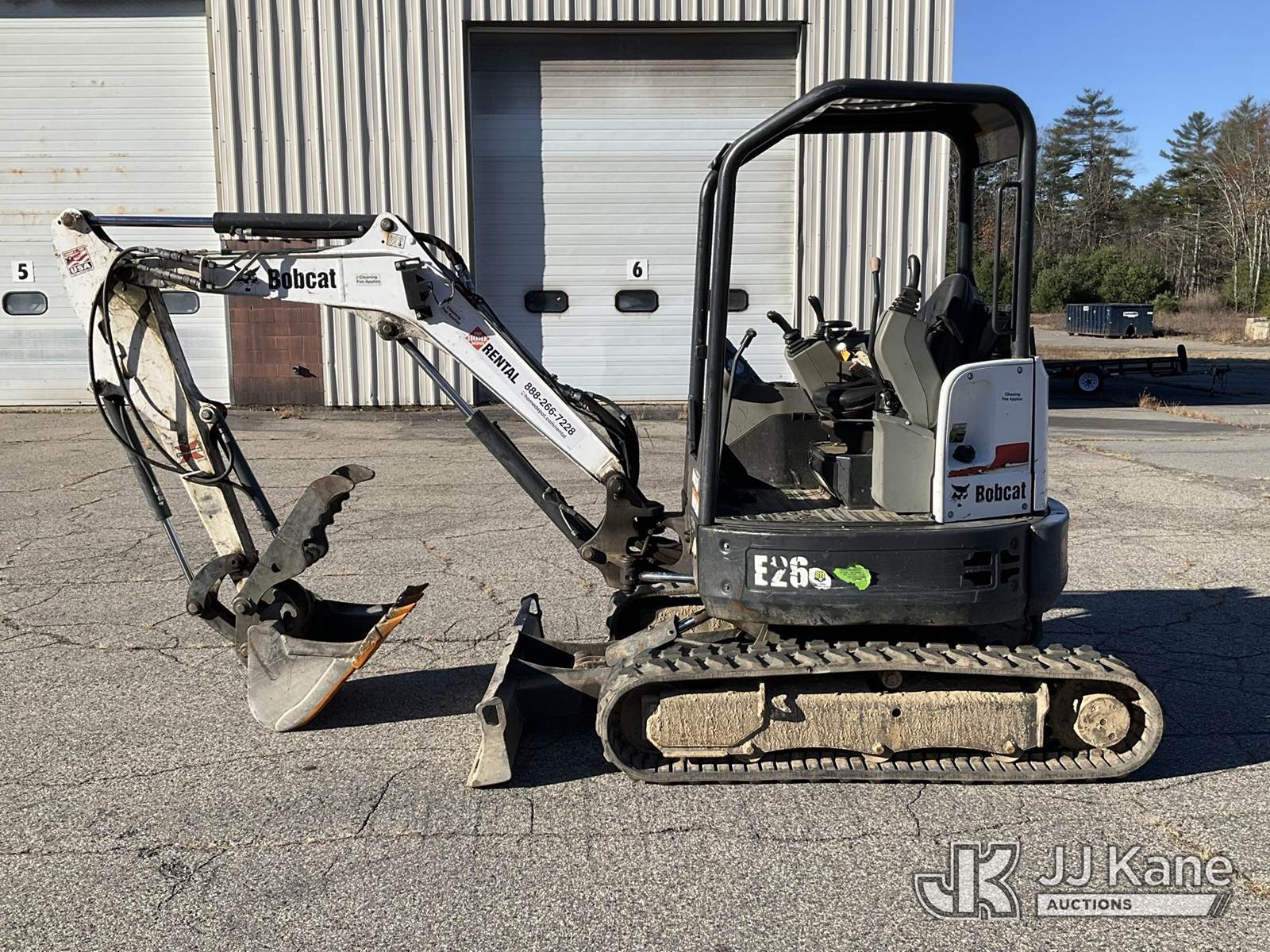 2018 Bobcat E26 Mini Hydraulic Excavator, s/n B3JE14197, Kubota diesel, Hydraulic Drive, with rubber tracks, digging bucket w/ hyd thumb attachment, aux hydraulics, backfill blade & ROPS, (Runs, Moves & Operates) (Removal is by Appointment Only, Buyer MUST make a appointment prior to picking up, Buyer/Transporter Must have PAID IN FULL RELEASE. No onsite assistance available, Please Come prepared.) (Reads 1,880 hours) NOTE: This unit is being sold AS IS/WHERE IS via Timed Auction and is located in Wells, ME. For specific technical information or questions about this item, contact Joe LaChance at (207) 608-7136. Inspection & Loadout days are the Tuesday through Thursday prior to the auction. For load-out and pick information, reference the hauler sheet sent out after purchase. These items are used and may contain defects that are not immediately detectable. Text descriptions and photos given are meant to be used as a guide only. The conditions are provided by the consignor. The Buyer is responsible for inspecting the item before bidding. All information provided is believed to be correct but no warranty as such is either intended or implied. All items are sold AS IS - WHERE IS AND WITH ALL FAULTS AND DEFECTS THEREIN. (Buyer is responsible for removal. Assistance by consignor or JJ Kane Auctioneers is not assured.)