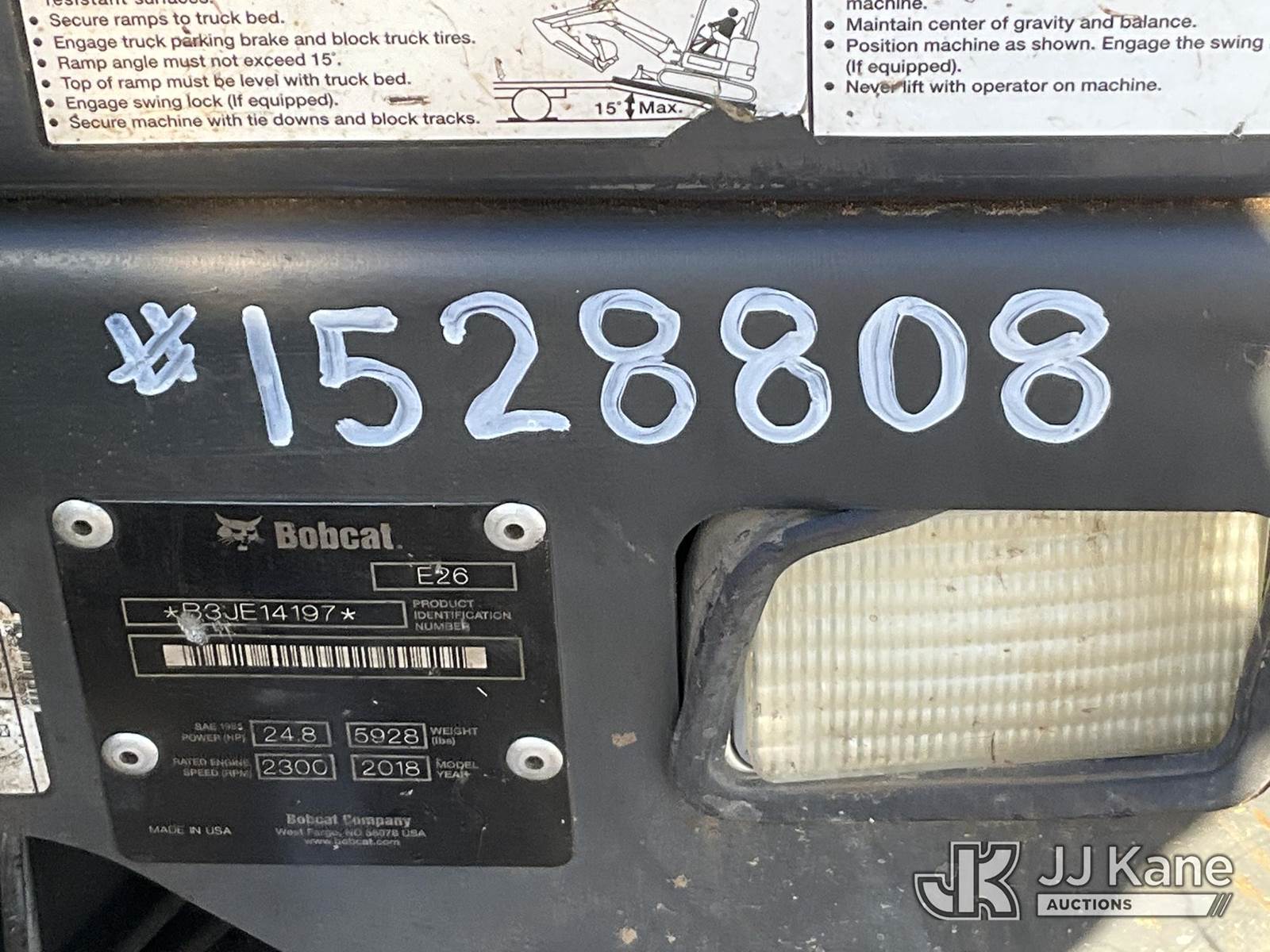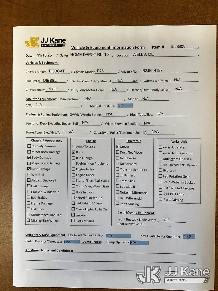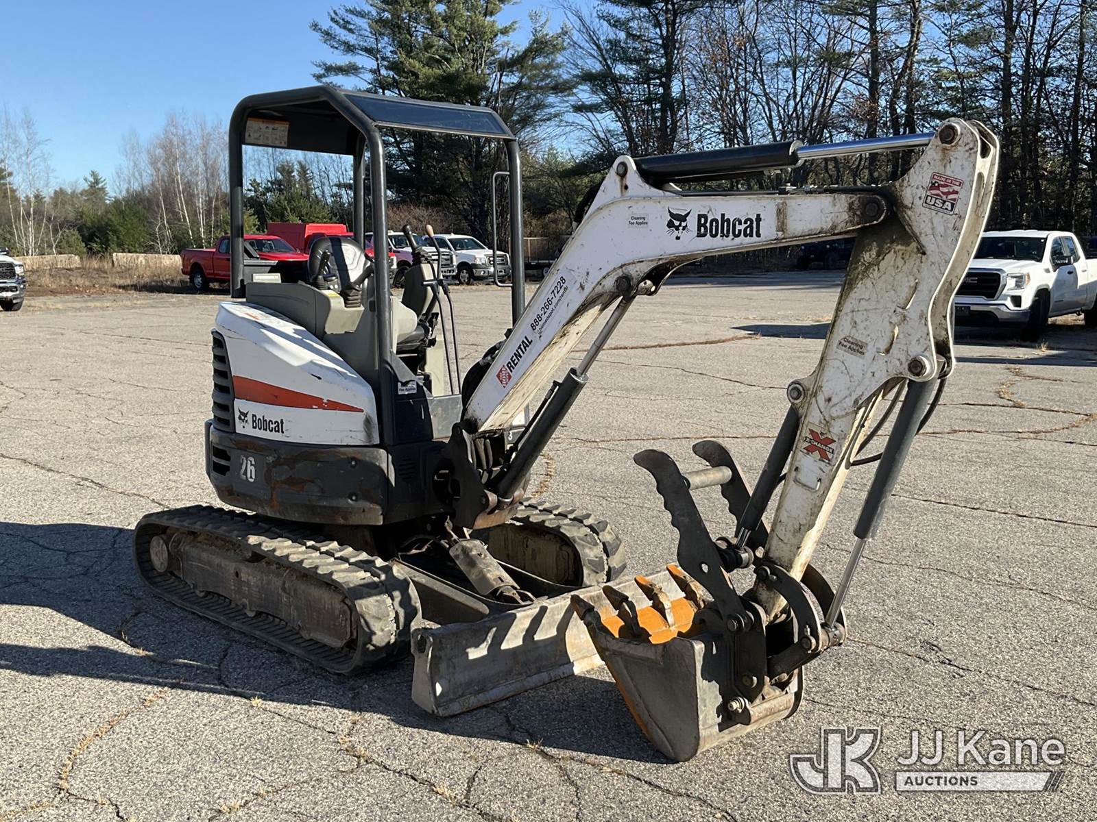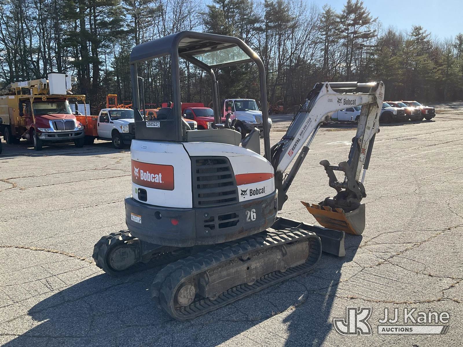 2018 Bobcat E26 Mini Hydraulic Excavator, s/n B3JE14197, Kubota diesel, Hydraulic Drive, with rubber tracks, digging bucket w/ hyd thumb attachment, aux hydraulics, backfill blade & ROPS, (Runs, Moves & Operates) (Removal is by Appointment Only, Buyer MUST make a appointment prior to picking up, Buyer/Transporter Must have PAID IN FULL RELEASE. No onsite assistance available, Please Come prepared.) (Reads 1,880 hours) NOTE: This unit is being sold AS IS/WHERE IS via Timed Auction and is located in Wells, ME. For specific technical information or questions about this item, contact Joe LaChance at (207) 608-7136. Inspection & Loadout days are the Tuesday through Thursday prior to the auction. For load-out and pick information, reference the hauler sheet sent out after purchase. These items are used and may contain defects that are not immediately detectable. Text descriptions and photos given are meant to be used as a guide only. The conditions are provided by the consignor. The Buyer is responsible for inspecting the item before bidding. All information provided is believed to be correct but no warranty as such is either intended or implied. All items are sold AS IS - WHERE IS AND WITH ALL FAULTS AND DEFECTS THEREIN. (Buyer is responsible for removal. Assistance by consignor or JJ Kane Auctioneers is not assured.)