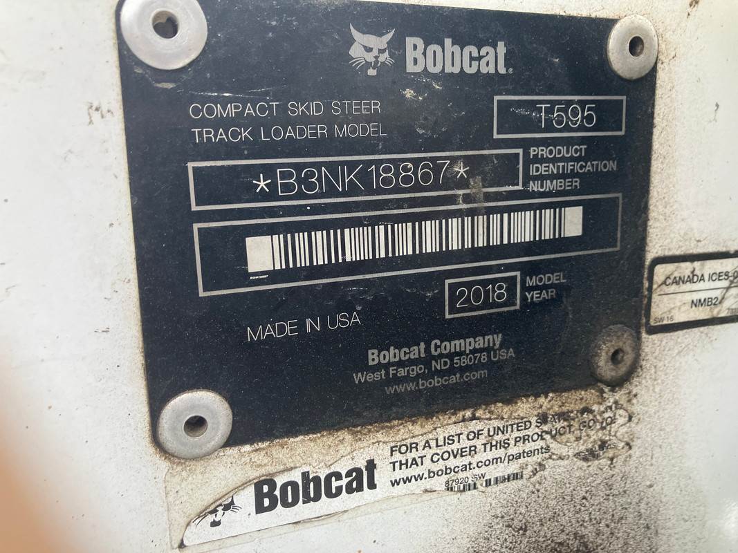 2018 Bobcat T595 Compact Track Loader, 4-Cylinder Turbocharged Diesel Engine, Hyd. Transmission, Enclosed Cab, Air Ride Seat, A/C, Heater, AM/FM Radio, Hour Meter Reads: 2,665 (Unverified), S/N: B3NK18867