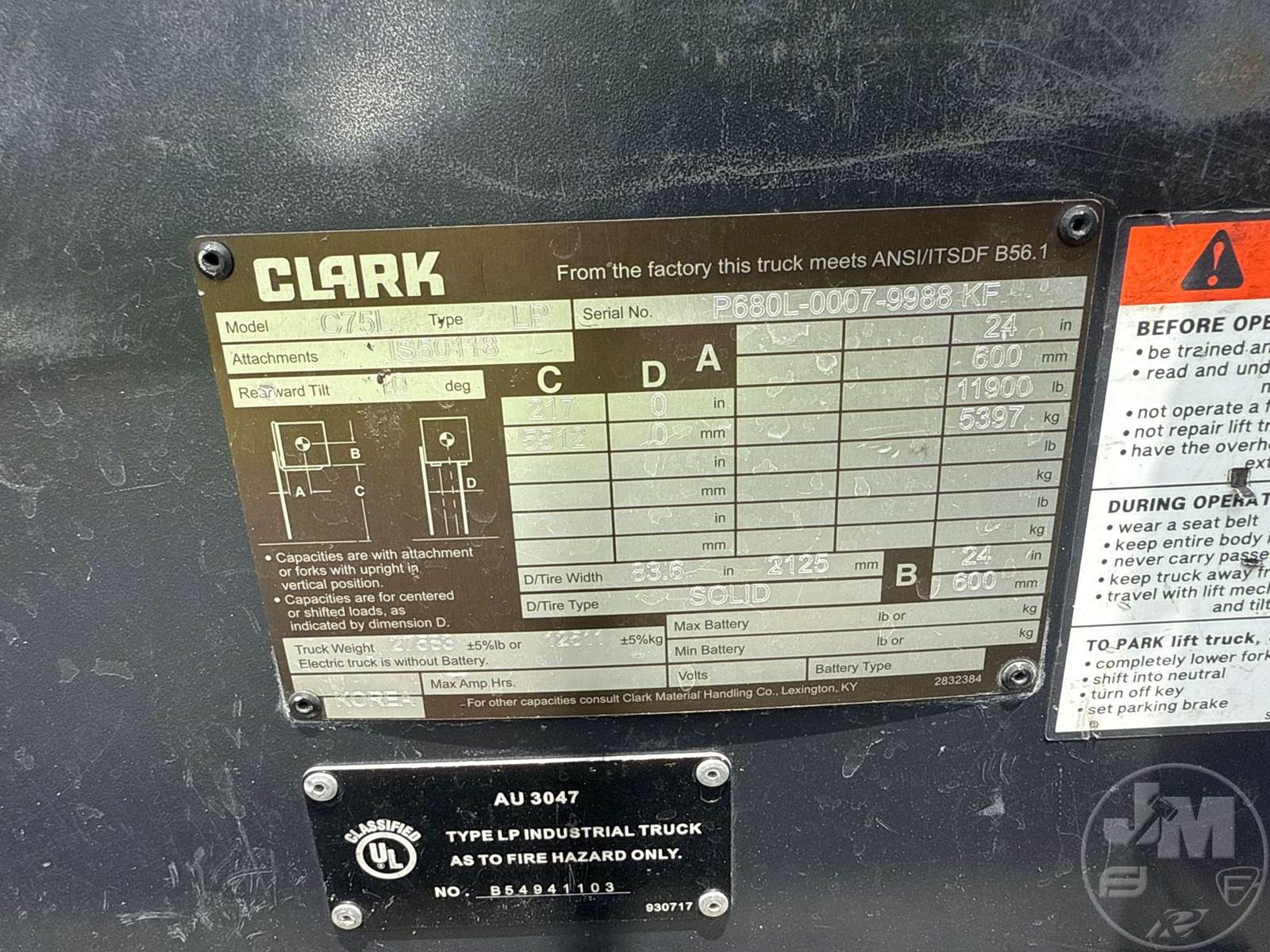 CLARK 16500 LBS CUSHION TIRE FORKLIFT, 6 CYLINDER , LPG, CANOPY, 2 STAGE MAST, 96" FORKS, HOUR METER READS: 6999, ***LPG TANK NOT INCLUDED***