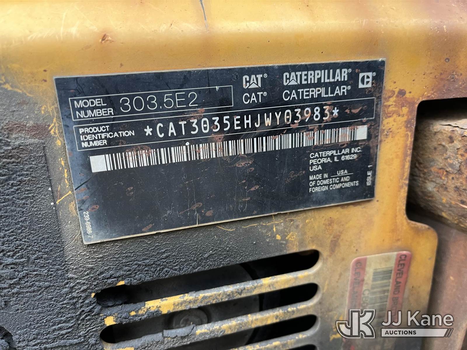 2018 Cat 303.5E2 CR Mini Hydraulic Excavator, s/n CAT3035EHJWY03983, 3-cyl Diesel, Hydraulic Driven, A/C, with Leveling Blade, Aux Hydro, ROPS, (Runs, Moves & Operates, Bucket Coupler Removed) (Reads 3,584 hours) NOTE: This unit is being sold AS IS/WHERE IS via Timed Auction and is located in Smock, PA. Inspection & preview days for this unit are the 2 business days prior to the first day of items closing for this auction, item is located at 1000 Franklin Dr Smock, PA 15480 and hours of operations are 7:00 am to 3:30 pm. For pre-sale questions, please contact Alaina White @ (724) 562-2575 or Alaina.White@JJKane.com. (Buyer is responsible for removal. Assistance by consignor or JJ Kane Auctions is not assured.)