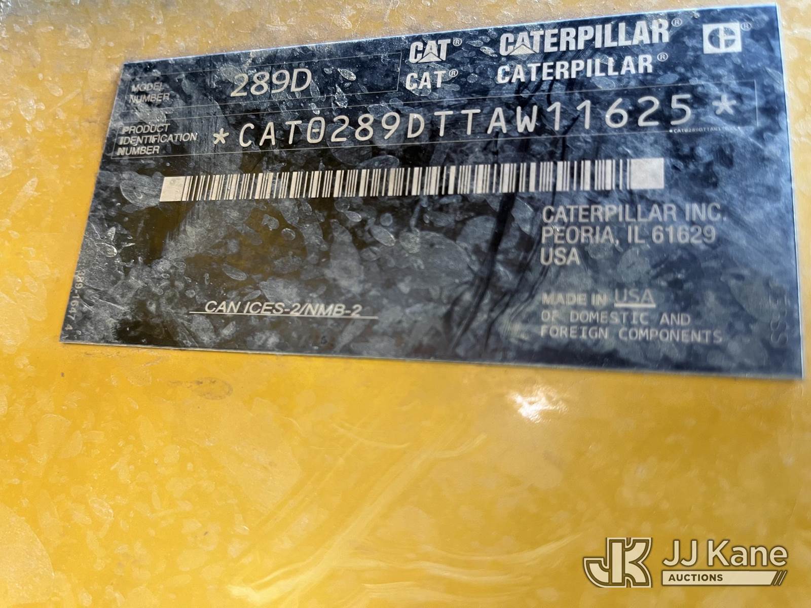 2018 Caterpillar 289D Tracked Skid Steer Loader, s/n CAT0289DTTAW11625, Cat Hydraulic Drive, diesel, with rubber tracks & EROPS w/A/C, (Runs, Moves & Operates) (Starts with Jump, Engine smokes, missing front glass, paint damage).) (Reads 1,935 hours) NOTE: This unit is being sold AS IS/WHERE IS via Timed Auction and is located in Hawk Point, MO. Inspection & preview days for this unit are the 2 business days prior to the first day of items closing for this auction, item is located at 25 State Highway A Hawk Point, MO 63349 and hours of operations are 8a-4p. For pre-sale questions, please contact Adam Stanek at (636) 295-1594. (Buyer is responsible for removal. Assistance by consignor or JJ Kane Auctioneers is not assured.)
