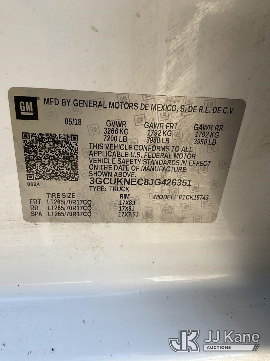 2018 Chevrolet Silverado 1500 4x4 Crew-Cab Pickup Truck, 5.3L V8 OHV 16V Gas, Auto, A/C, with service cap, (117,335 miles) (Duke Unit) (Runs & Moves) This is a Titled Item NOTE: This unit is being sold AS IS/WHERE IS via Timed Auction and is located in Ocala, FL. Inspection & preview days for this unit are by appointment only; please contact us at contact@jjkane.com or 84-Go-JJKane for more details. For more information & removal arrangements please contact Mike Lessard @ (352) 629-6677. (Buyer is responsible for removal. Assistance by consignor or JJ Kane Auctions is not assured.)
