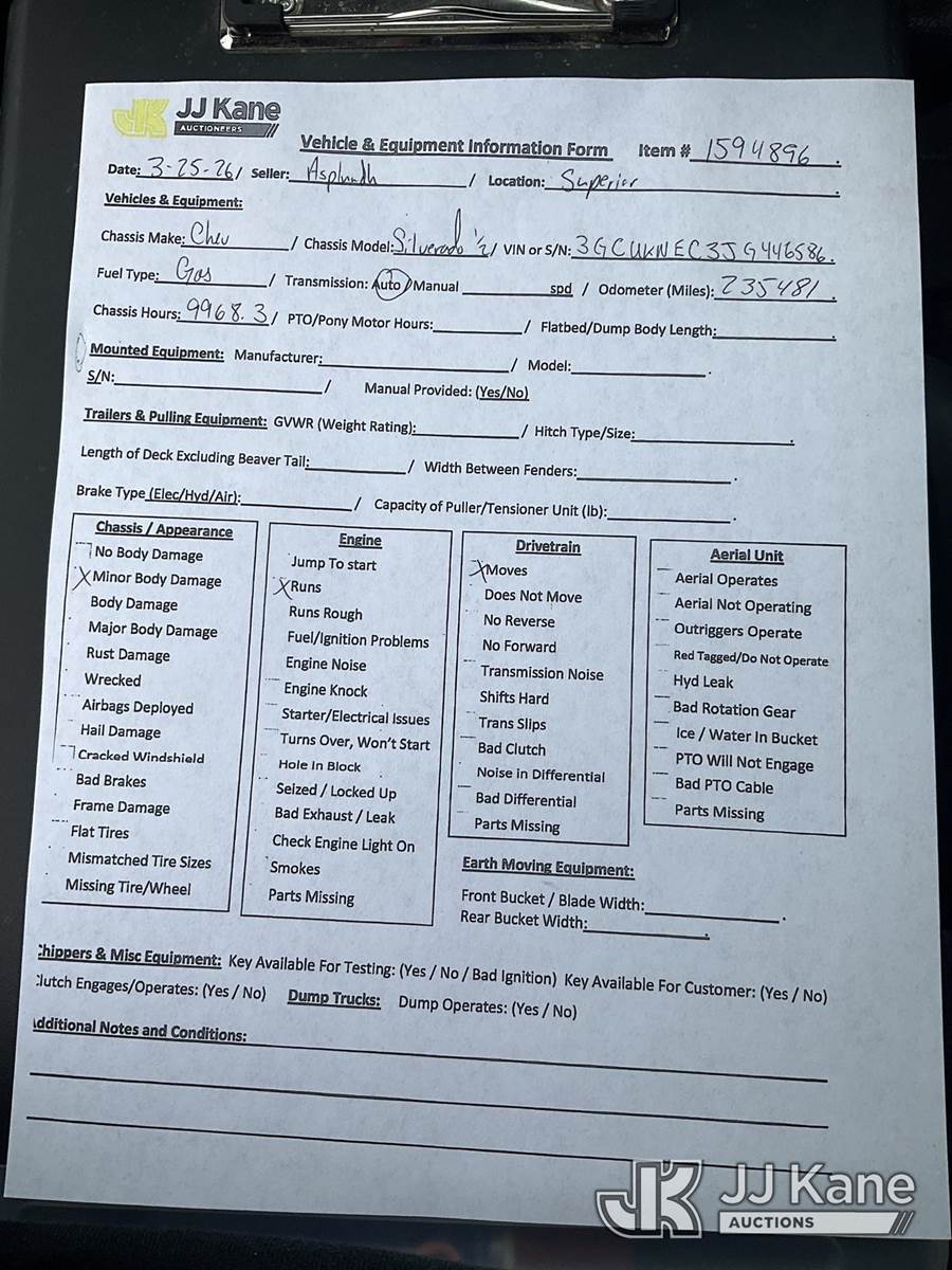 2018 Chevrolet Silverado 1500 4x4 Crew-Cab Pickup Truck, 5.3L V8 OHV 16V gas, 6-Speed Automatic, A/C, with bed cap, (235,481 miles) (Runs & Moves) (Check Engine Light On, Body Damage) (Seller States: Needs A New Windshield) This is a Titled Item NOTE: This unit is being sold AS IS/WHERE IS via Timed Auction and is located in Superior, WI. Inspection & preview days for this unit are by appointment only; please contact us at contact@jjkane.com or 84-Go-JJKane for more details. (Buyer is responsible for removal. Assistance by consignor or JJ Kane Auctions is not assured.)