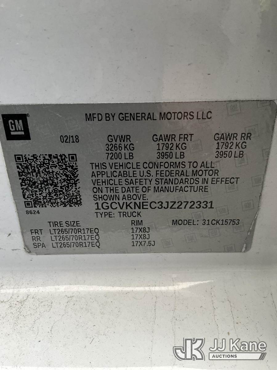2018 Chevrolet Silverado 1500 4x4 Extended-Cab Pickup Truck, 8-cyl gas, Auto, A/C, with bed cover, (110,082 miles) (Duke Unit) (Runs & Moves) This is a Titled Item NOTE: This unit is being sold AS IS/WHERE IS via Timed Auction and is located in Ocala, FL. Inspection & preview days for this unit are by appointment only; please contact us at contact@jjkane.com or 84-Go-JJKane for more details. For more information & removal arrangements please contact Mike Lessard @ (352) 629-6677. (Buyer is responsible for removal. Assistance by consignor or JJ Kane Auctioneers is not assured.)