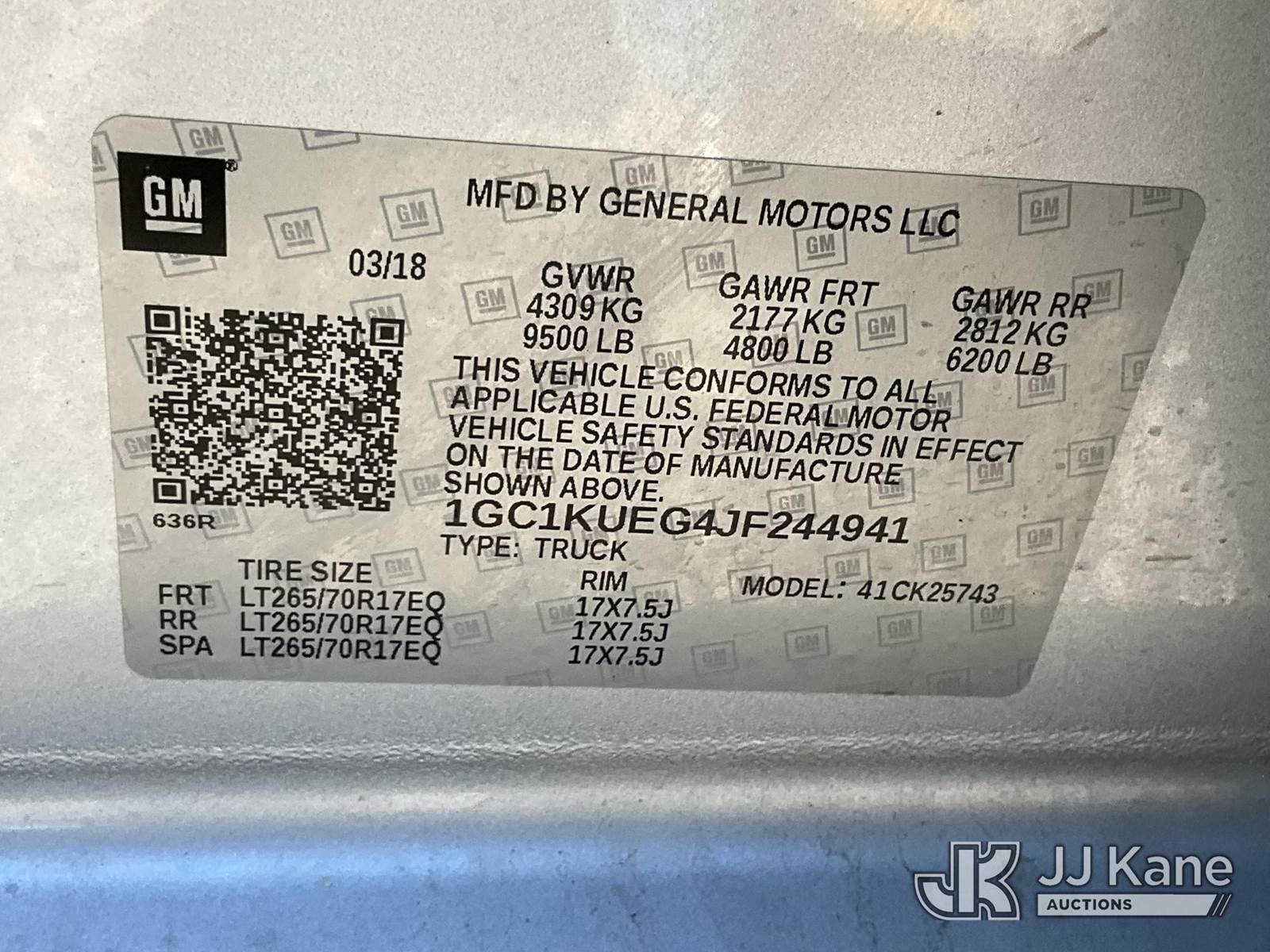 2018 Chevrolet Silverado 2500HD 4x4 Crew-Cab Pickup Truck, 8-cyl gas, Auto, A/C, (113,321 miles) (Runs & Moves) (Body Damage) This is a Titled Item NOTE: This unit is being sold AS IS/WHERE IS via Timed Auction and is located in Salt Lake City, UT. Inspection & preview days for this unit are the 2 business days prior to the first day of items closing for this auction, item is located at 2353 N Redwood Rd Salt Lake City, UT 84116 and hours of operations are 8a-4p. Titles executed exactly as bidder registered. Ensure your name and/or business name and address in JJ Kane and/or ProxiBid is correct before bidding. For pre-sale questions, please contact Office Staff @ (801) 519-0123. (Buyer is responsible for removal. Assistance by consignor or JJ Kane Auctions is not assured.)