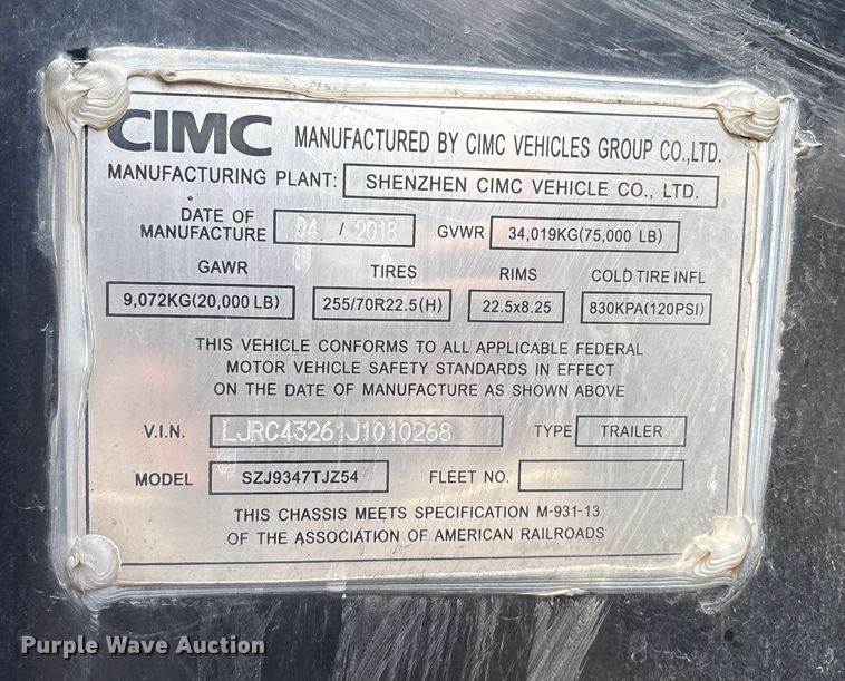 2018 Cimc SZJ9347TJZ54 Container Trailer