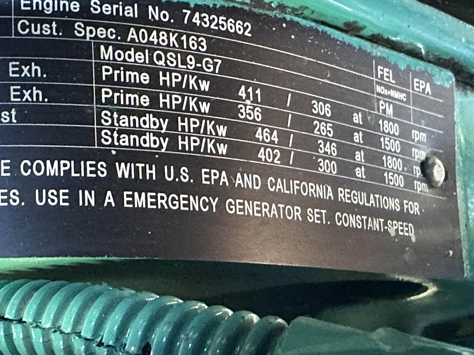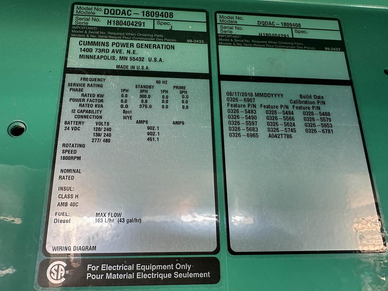 Cummins 300 kW standby (270 kW prime) diesel generator set model DQDAC, SN-H180404291. Cummins QSL9-G7 engine rated 464 HP at 1800 RPM, EPA Tier 3 emissions, SN-74325662. 3/60/277/480V, 12 lead reconnectable to other voltages. (1) 600, (1) 250 and (1) 100 Amp main-line circuit breaker. PMG - Permanent magnet generator. Oversized generator end rated 335 kW. UL 2200 listed stationary engine-generator assembly. Engine cooling high ambient air temp. PowerCommand digital control panel. Battery charger. Coolant heater. Sound attenuated enclosure. 550 gallon UL listed sub-base fuel tank with secondary containment. 93 Hrs. Year 2018. Passed load test 11/11/2025. Overall dimensions 54W x 180L x 130H on 6H blocks, 10,000 lbs. FOB Waukesha, WI