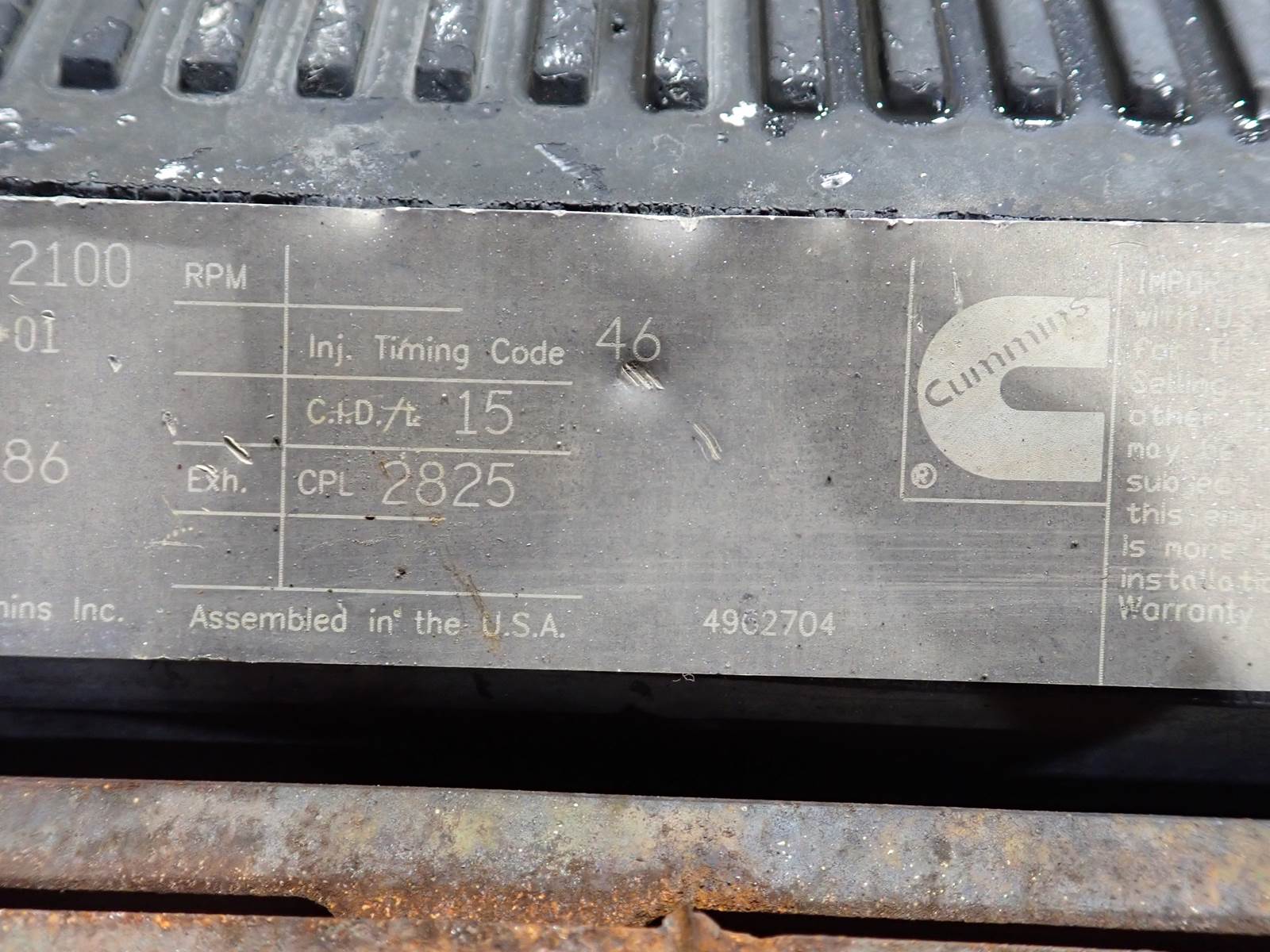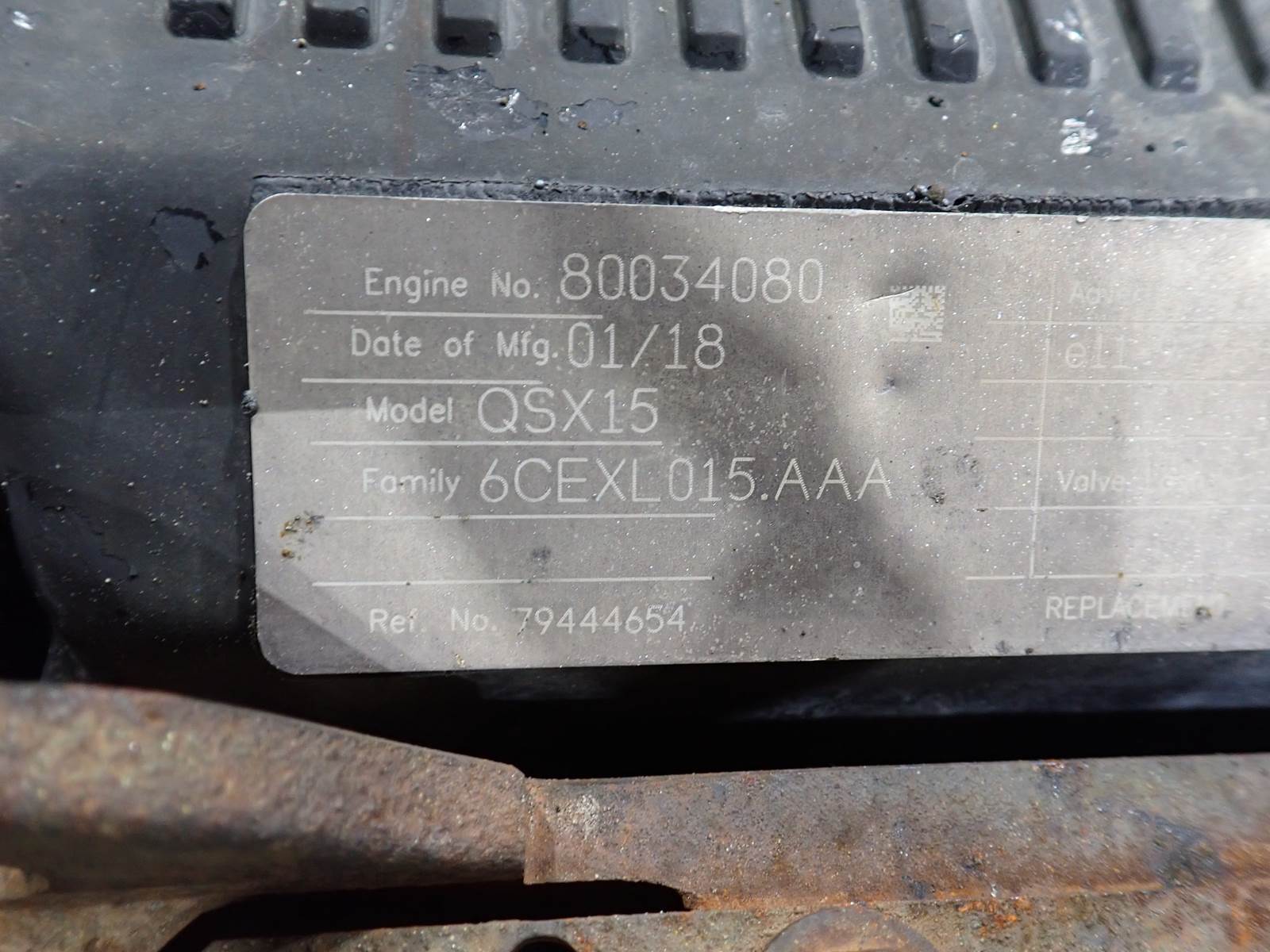 2018 Cummins QSX15 diesel engine, turbocharged, air to air intercooled, overhead cam, CM570, CPL 2825, 600 HP rating, complete engine as pictured, 5308 total hours. EXCELLENT RUNNING ENGINE, SEE VIDEO. TEST RAN CLEAN W/ NO SMOKE OR BLOWBY OBSERVED, 41 PSI OIL PRESSURE AT LOW IDLE. HARD TO FIND EARLY QSX15 -- PRE EMISSIONS, 600 HP RATING !!