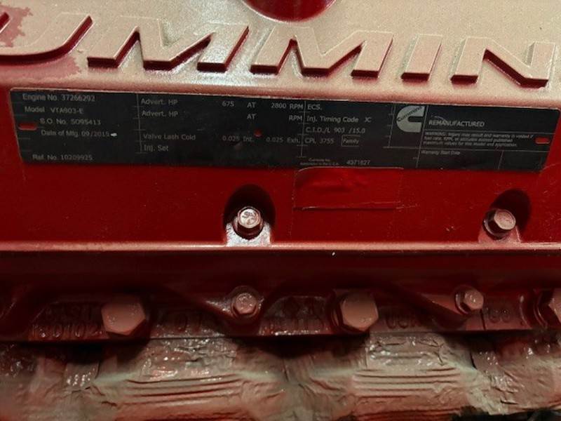 OEM Factory Reman Cummins VTA903E 675hp Surplus Engine, never used, complete ready to ship exchange plus $2,000.00 refundable core deposit. SN#37274434 SAMPLE, CPL 3755, CM2250V105.