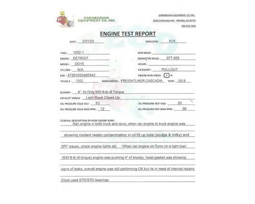 Detroit DD15 EPA10 GHG17, 14.8L, S/N 472910S0495543 977,959 Odometer Miles.Runs & Sounds Good But Shows Signs Of Water In The Oil. See Test Report For Full Details. Video On File