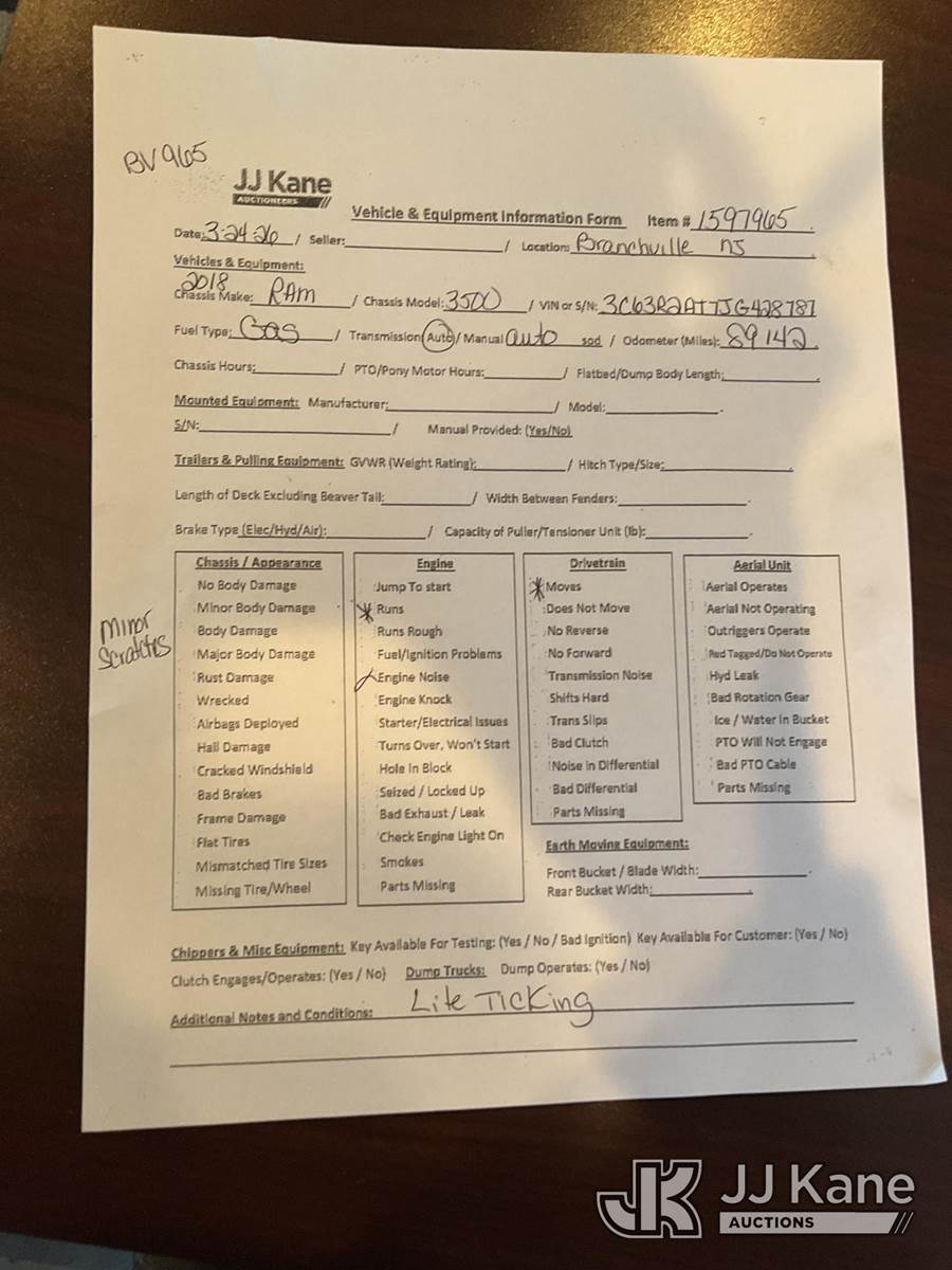 2018 Dodge RAM 3500 Service Truck, 8-cyl gas, RWD, Auto, (89,143 miles) (Runs & Moves) (Engine Noise. Condition Unknown, Needs Tow) This is a Titled Item NOTE: This unit is being sold AS IS/WHERE IS via Timed Auction and is located in Branchville, NJ. Inspection & preview days for this unit are by appointment only; please contact us at contact@jjkane.com or 84-Go-JJKane for more details. For pre-sale questions, please contact the on-site office @ (973) 948-2026 or wtrbranchville@gmail.com. (Buyer is responsible for removal. Assistance by consignor or JJ Kane Auctions is not assured.)