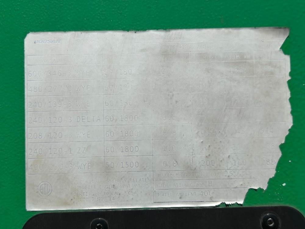 2018 DOOSAN G190WCU-3A-T4F GENERATOR, 150kw, Cummins diesel, portable. s/n:485779UDACF35