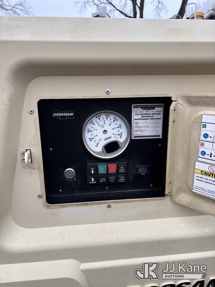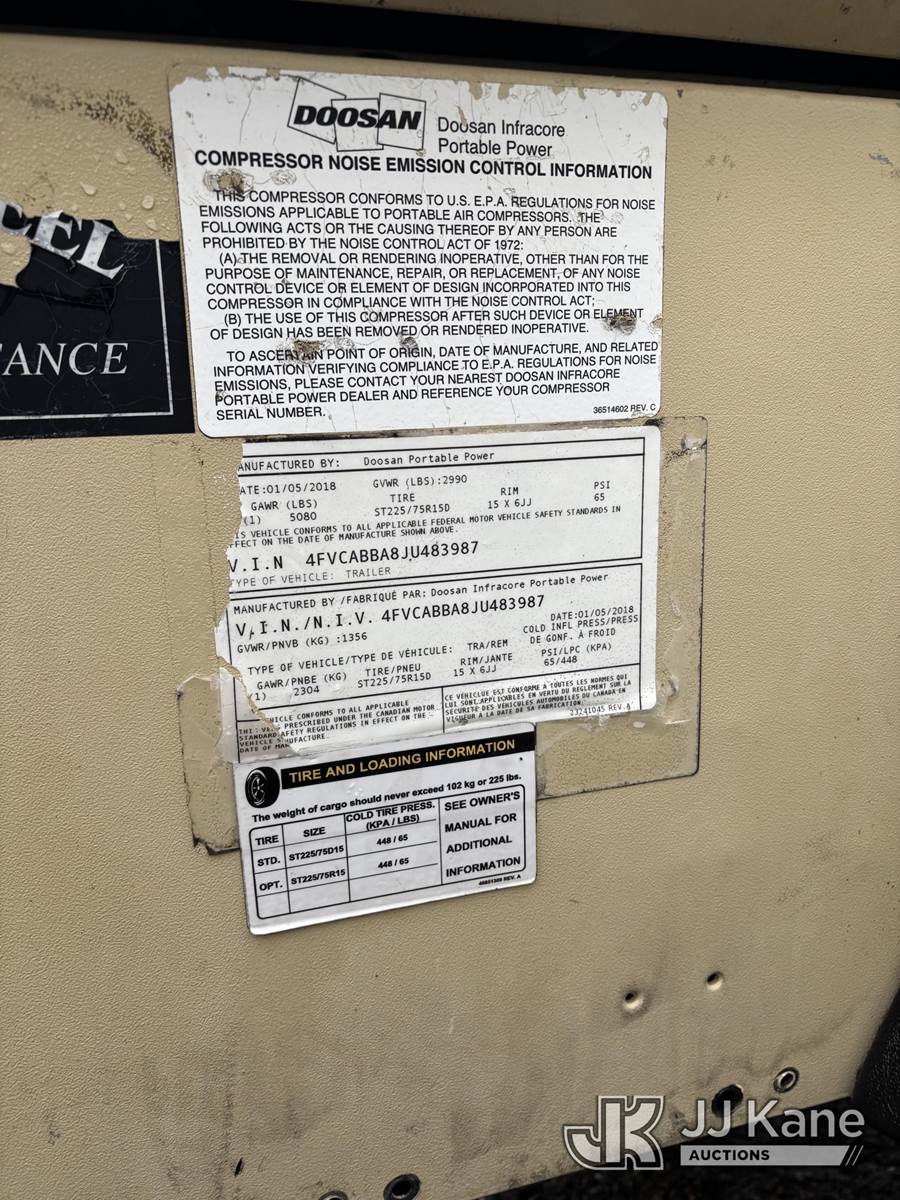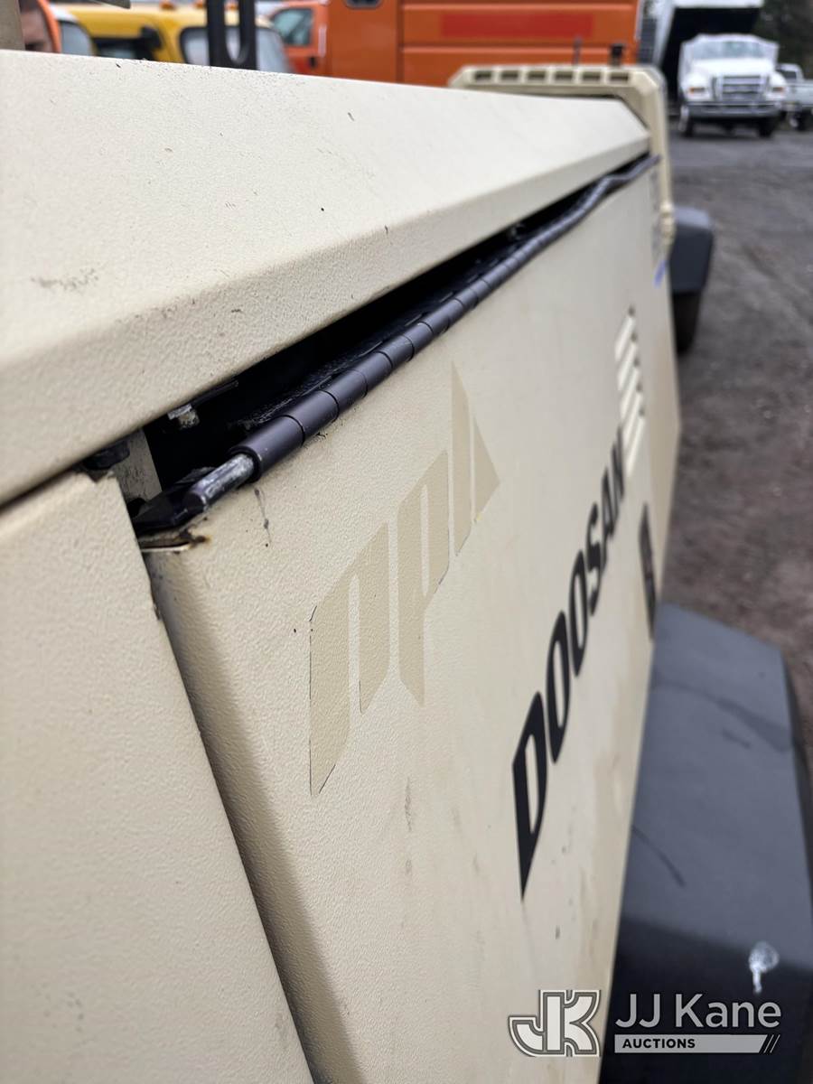 2018 DOOSAN P250 Portable Air Compressor, s/n 4FVCABBA8JU483987, diesel, (No Title) (Not Running Condition Unknown, Engine Access Door Broken) (Reads 1,101 hours) NOTE: This unit is being sold AS IS/WHERE IS via Timed Auction and is located in Alpha, NJ. For pre-sale questions and pickups, please contact Pete Rhodes at peter.rhodes@jjkane.com. Pickups can be conducted Monday through Friday 9:30am to 3:00pm. (Buyer is responsible for removal. Assistance by consignor or JJ Kane Auctioneers is not assured.)