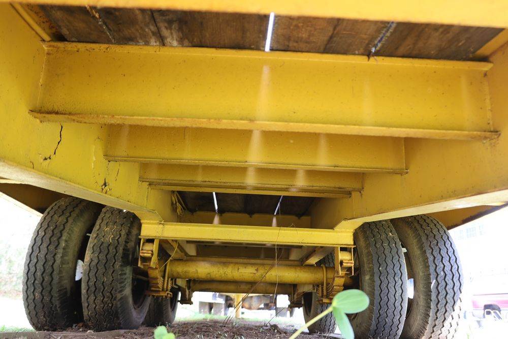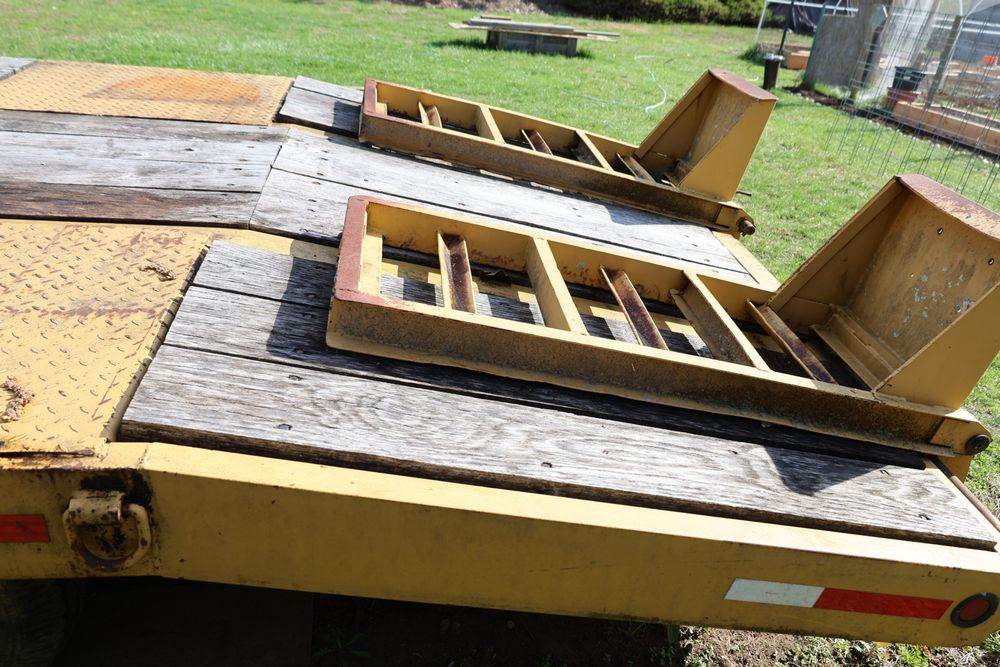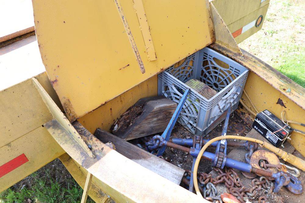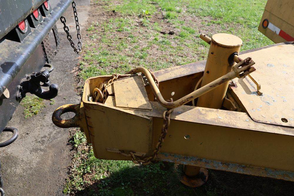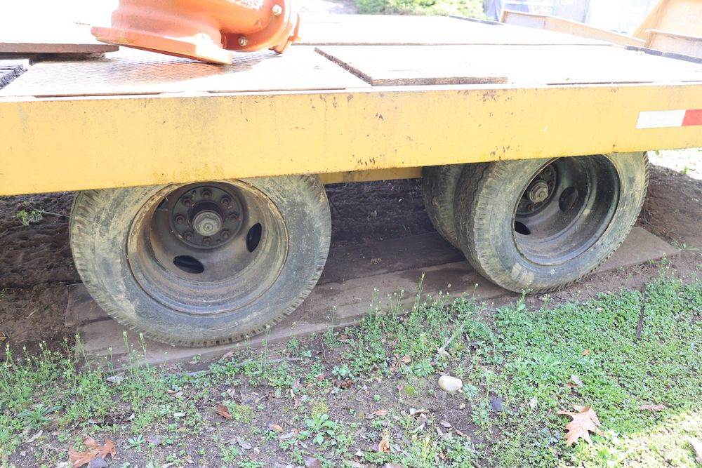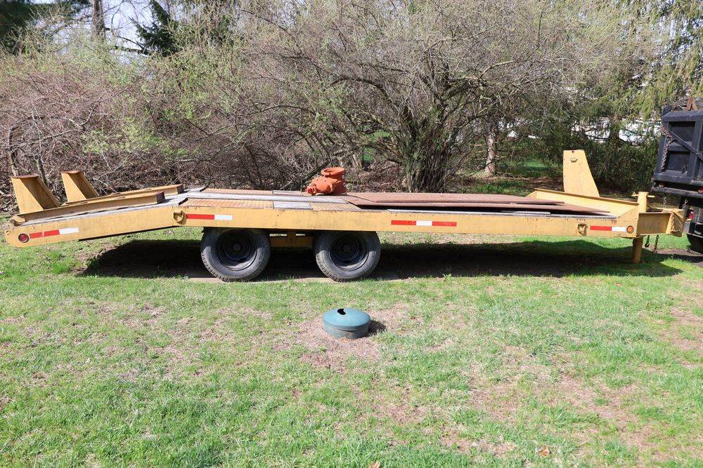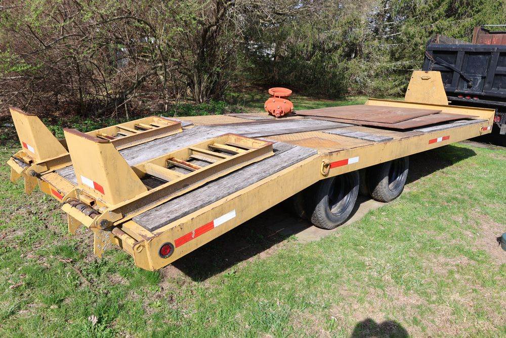 2018 Eager Beaver TL3 9 Ton equipment trailer; VIN 112HDB204JT090160; tandem axle dual wheel setup; wood deck; rear loading ramps; pintle hitch with jack stand; tie down points along sides; includes chains, binders, crate, and contents in front compartment. Excludes all items on the trailer. Title available.