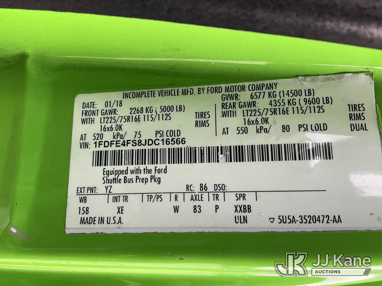 2018 Ford E450 14 Passenger Bus, 6.8L V10 SOHC 20V gas, RWD, Auto, A/C, (187,200 miles) (Runs & Moves) (Check Engine Light On, Paint Damage) This is a Titled Item NOTE: This unit is being sold AS IS/WHERE IS via Timed Auction and is located in Verona, KY. Inspection & preview days for this unit are the 2 business days prior to the first day of items closing for this auction, item is located at 2841 Verona-Mudlick Rd Ste B Verona, KY 41092 and hours of operations are 8a-4p. For pre-sale questions, please contact Office Staff @ (502) 612-5080. Auctioneer Michael Whitebread / License # 256617. (Buyer is responsible for removal. Assistance by consignor or JJ Kane Auctions is not assured.)