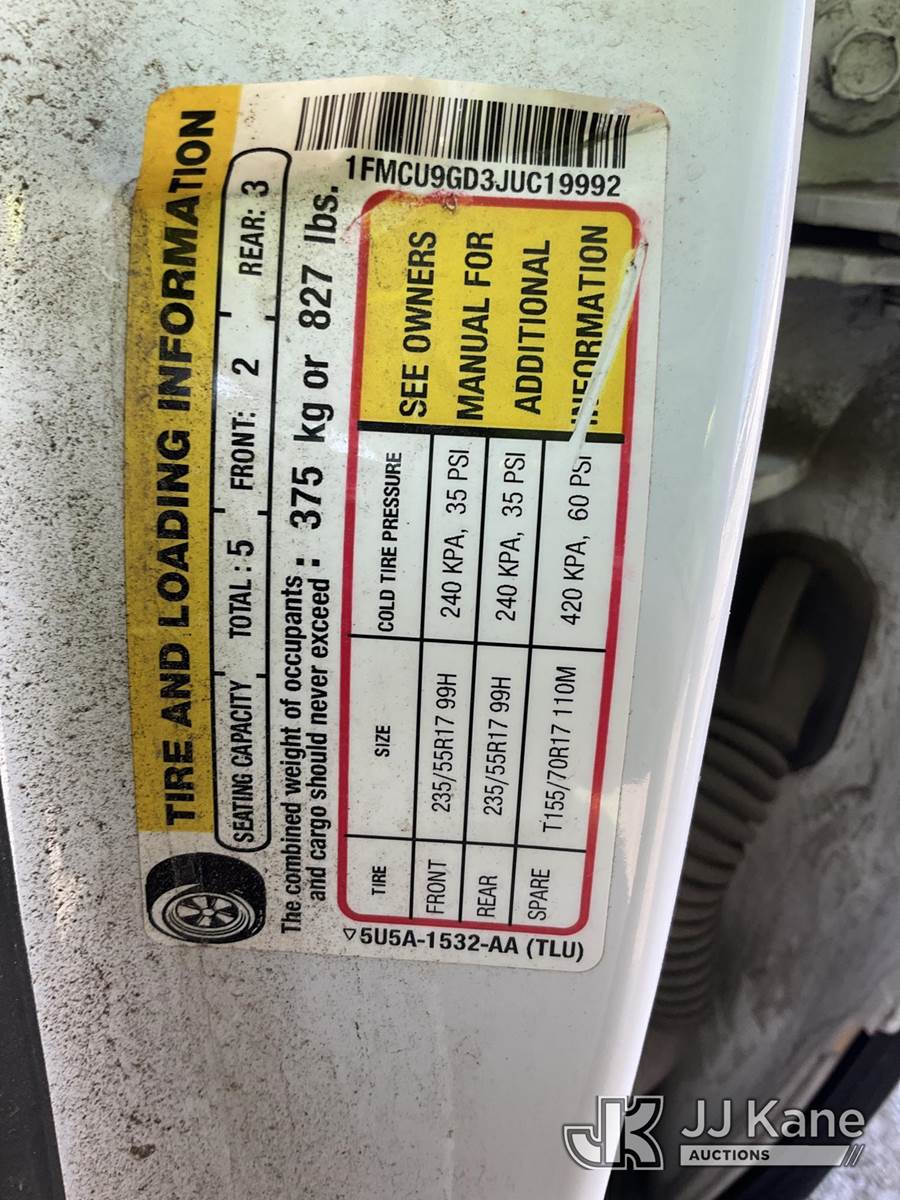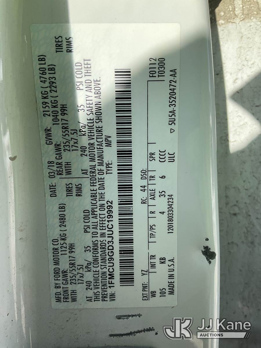 2018 Ford Escape 4-Door Sport Utility Vehicle, 4-cyl gas, 4wd, 6-Speed Automatic, A/C, (108,190 miles) (Runs & Moves) (Check Engine Light On, Runs Rough/Shakes, Chipped Windshield, Paint/Body Damage) This is a Titled Item NOTE: This unit is being sold AS IS/WHERE IS via Timed Auction and is located in South Beloit, IL. Inspection & preview days for this unit are the 2 business days prior to the first day of items closing for this auction, item is located at 14354 Dearborn Ave South Beloit, IL and hours of operations are 8a-4p. For pre-sale questions, please contact Derek Eklund at (608) 904-0618 or (derek.eklund@jjkane.com). (Buyer is responsible for removal. Assistance by consignor or JJ Kane Auctions is not assured.)
