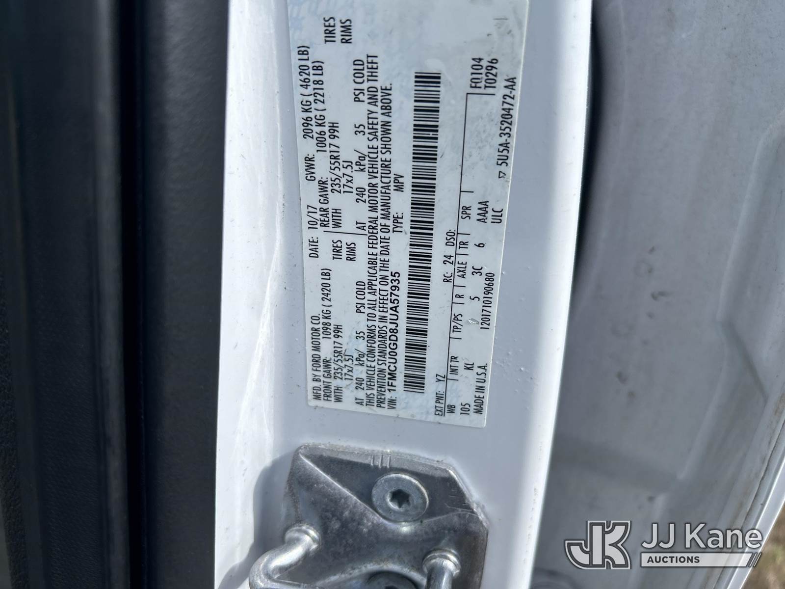 2018 Ford Escape 4-Door Sport Utility Vehicle, 4-cyl gas, FWD, 6-Speed Automatic, A/C, (120,811 miles) (Runs & Moves) (Paint Damage) (Seller States: Bad Engine) (FL Residents Purchasing Titled Items - tax, title & registration fees will be collected at the maximum rate of $400.00 under 25,999 and $800.00 for Over 26,000 and $250.00 trailers - Proof of insurance is mandatory; Out of State Residents Purchasing Title Items - tax will be collected based upon your state rate.) This is a Titled Item NOTE: This unit is being sold AS IS/WHERE IS via Timed Auction and is located in Riviera Beach, FL. An inspection day for FPL auction items will be conducted on the Friday before the auction from 8a-3p at 2455 Port West Boulevard, Riviera Beach, FL 33407. Winning Buyer/Hauler must present copy of paid invoice upon arrival to pick up. For load out and pick up information, please reference the release form sent out after purchase. Any more information please call Andy Garcia @ 561-215-0085. Sales Tax Collected Based on Residency (Buyer is responsible for removal. Assistance by consignor or JJ Kane Auctions is not assured.)