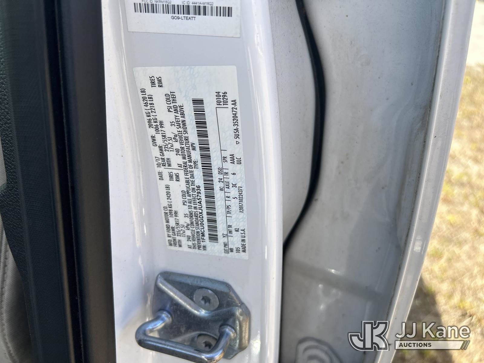 2018 Ford Escape 4-Door Sport Utility Vehicle, 4-cyl gas, FWD, 6-Speed Automatic, A/C, (115,589 miles) (Runs & Moves) (Paint Damage) (FL Residents Purchasing Titled Items - tax, title & registration fees will be collected at the maximum rate of $400.00 under 25,999 and $800.00 for Over 26,000 and $250.00 trailers - Proof of insurance is mandatory; Out of State Residents Purchasing Title Items - tax will be collected based upon your state rate.) This is a Titled Item NOTE: This unit is being sold AS IS/WHERE IS via Timed Auction and is located in Riviera Beach, FL. An inspection day for FPL auction items will be conducted on the Friday before the auction from 8a-3p at 2455 Port West Boulevard, Riviera Beach, FL 33407. Winning Buyer/Hauler must present copy of paid invoice upon arrival to pick up. For load out and pick up information, please reference the release form sent out after purchase. Any more information please call Andy Garcia @ 561-215-0085. Sales Tax Collected Based on Residency (Buyer is responsible for removal. Assistance by consignor or JJ Kane Auctions is not assured.)