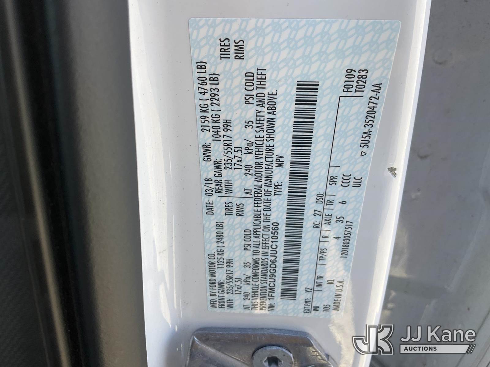 2018 Ford Escape 4WD 4-Door Sport Utility Vehicle, 4-cyl gas, Auto, A/C, (92,799 miles) (Runs & Moves) This is a Titled Item NOTE: This unit is being sold AS IS/WHERE IS via Timed Auction and is located in China Grove, NC. Inspection & preview days for this unit are the 2 business days prior to the first day of items closing for this auction, item is located at 820 E NC Hwy 152 China Grove, NC 28023 and hours of operations are 8a-4p. For pre-sale questions, please contact Office Staff @ (704) 674-1113. Sales Tax Collected Based on Residency (Buyer is responsible for removal. Assistance by consignor or JJ Kane Auctions is not assured.)
