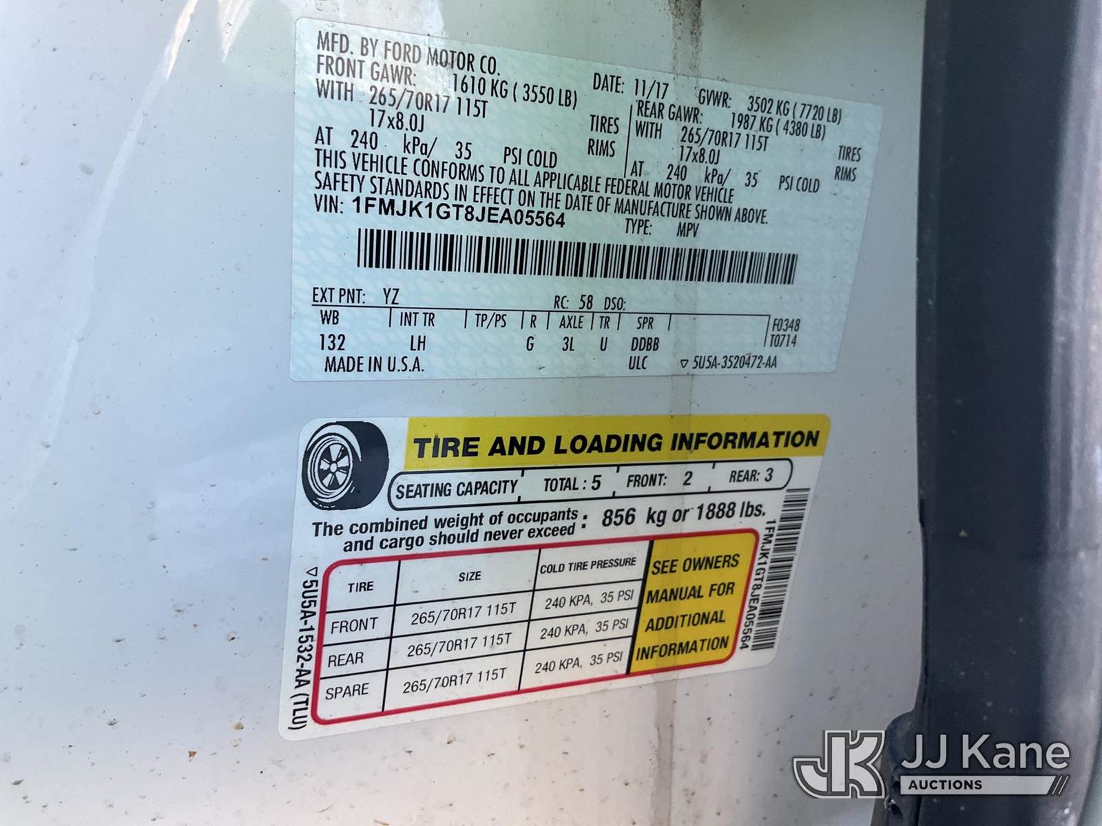 2018 Ford Expedition EL XL 4WD 4-Door Sport Utility Vehicle, 3.5L V6 DOHC 24V FFV 4wd, FFV, 6-Speed Automatic, A/C, (167,901 miles) (Runs & Moves) (Hail/Body Damage, Headlights Cracked, No 3rd Row Seat) (Reads 3,695 hours) This is a Titled Item NOTE: This unit is being sold AS IS/WHERE IS via Timed Auction and is located in South Beloit, IL. Inspection & preview days for this unit are the 2 business days prior to the first day of items closing for this auction, item is located at 14354 Dearborn Ave South Beloit, IL and hours of operations are 8a-4p. For pre-sale questions, please contact Derek Eklund at (608) 904-0618 or (derek.eklund@jjkane.com). (Buyer is responsible for removal. Assistance by consignor or JJ Kane Auctions is not assured.)